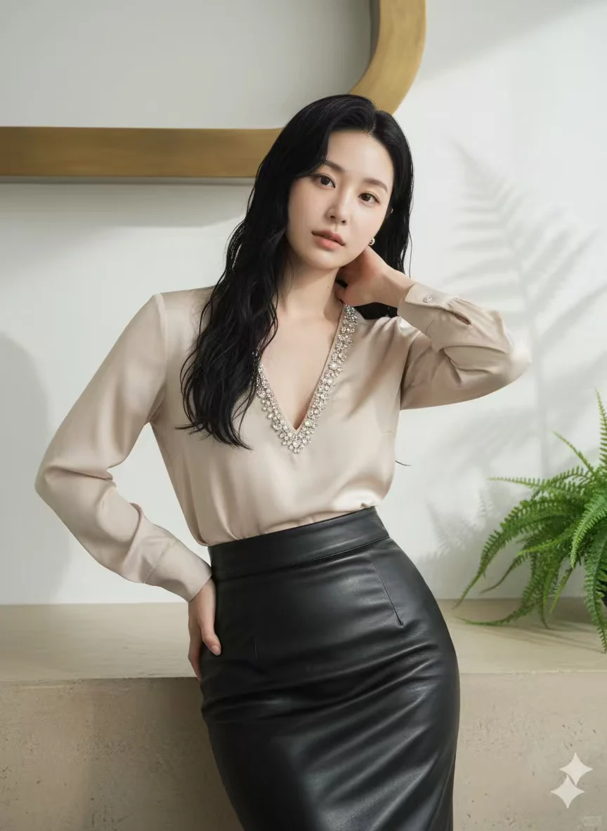 将照片转轻奢性感时尚肖像,保留面部特征。穿黑色蕾丝透视吊带(带花纹)+亮面皮质高腰裙,搭长款钻石流苏耳饰;黑长直大波浪发型,发丝柔顺垂坠。柔和漫射光打亮面部,背景极简米白墙+弧形金属装饰,旁边有翠绿蕨类植物。眼神魅惑带笑意,姿态慵懒撩发,画面高分辨率,保留蕾丝、皮质细节,色调清透暖调,3:4竖幅构图。”