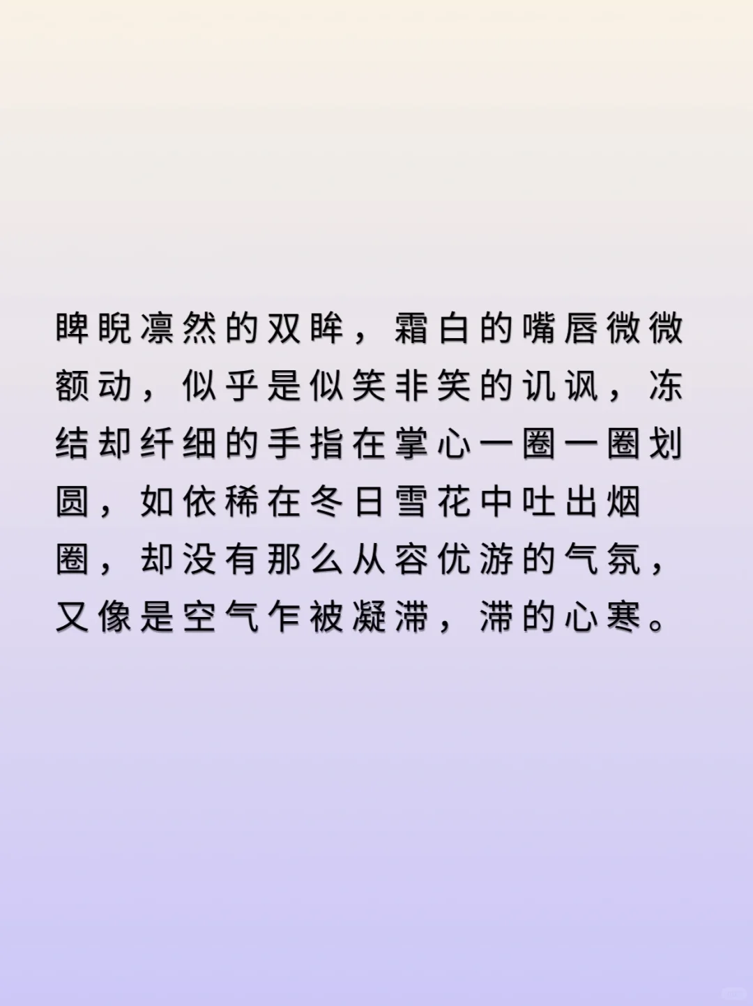 睥睨凛然的双眸,霜白的嘴唇微微额动,似乎是似笑非笑的讥讽,冻结却纤细的手指在掌心一圈一圈划圆,如依稀在冬日雪花中吐出烟圈,却没有那么从容优游的气氛,又像是空气乍被凝滞,滞的心寒。