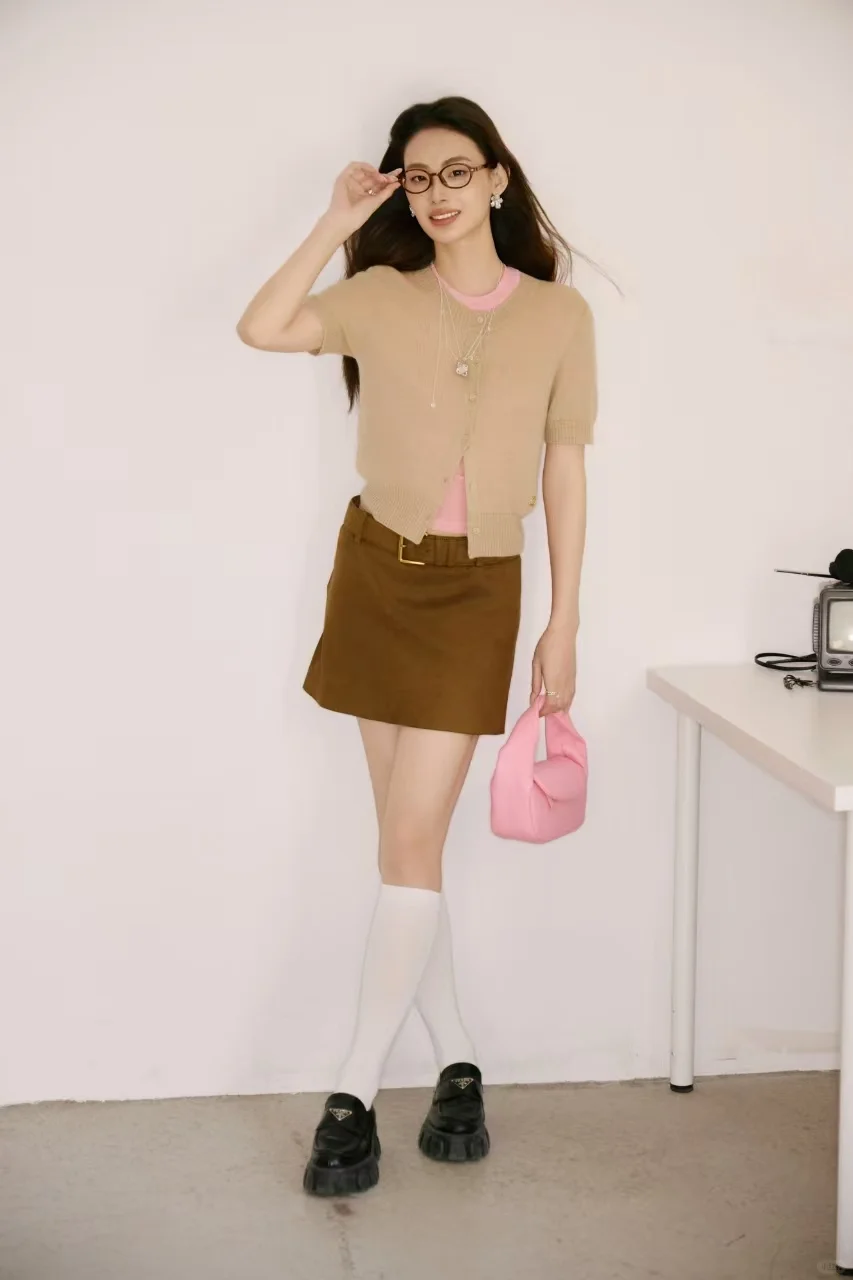 1️⃣米色针织+棕裙的温柔暴击