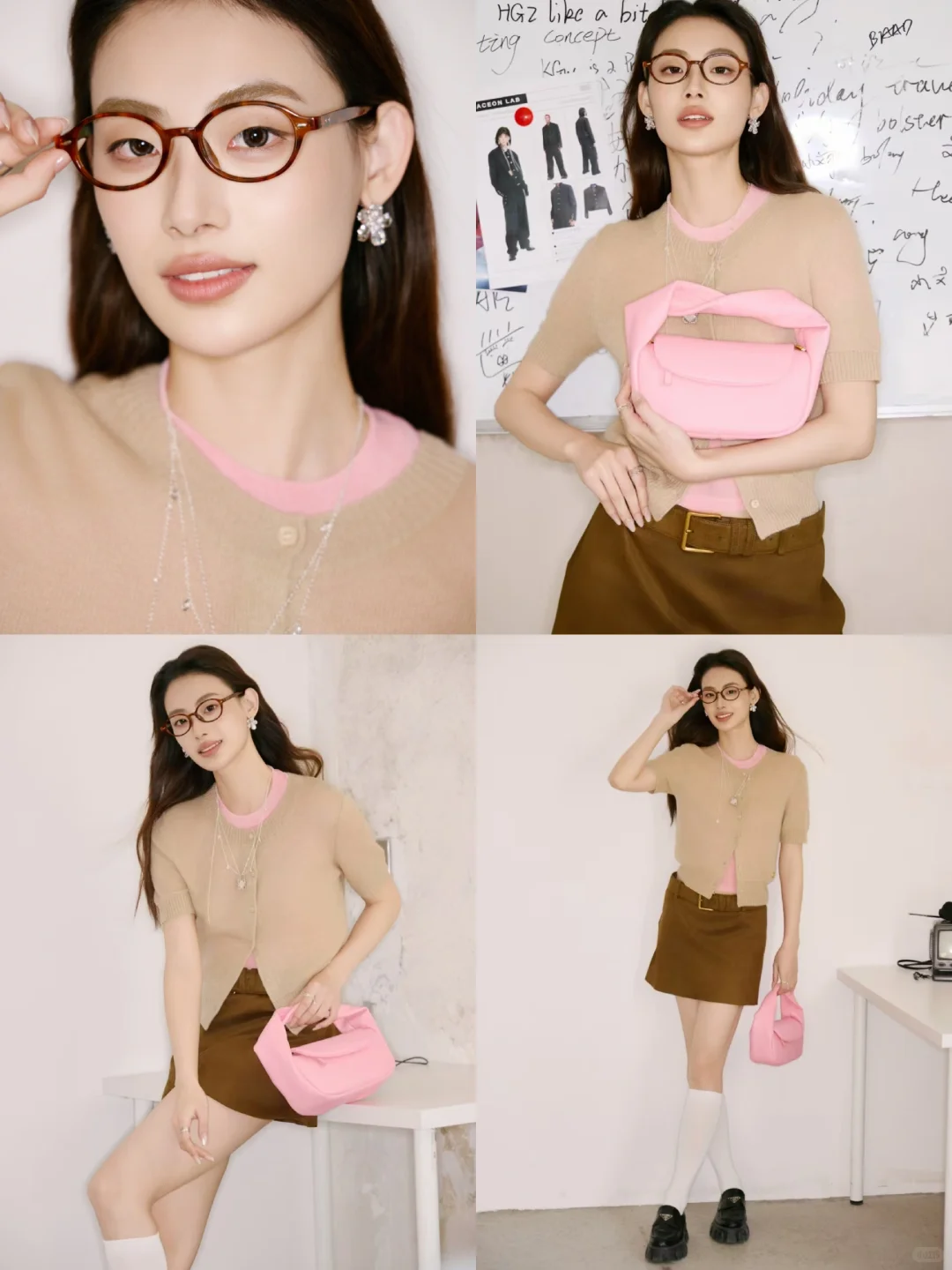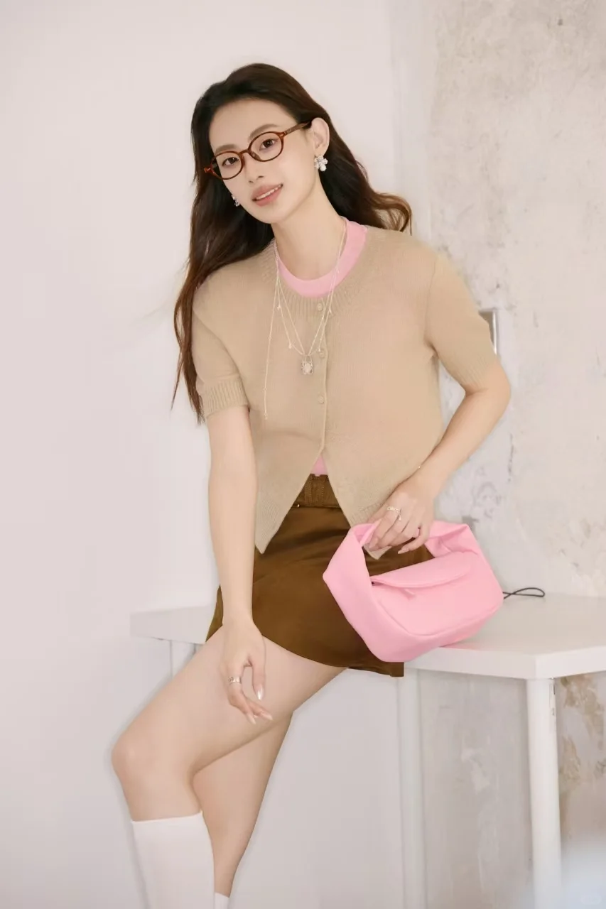 MIU系标志性的低饱和场景中,小果用莫兰迪色系穿搭与木质背景碰撞出轻奢火花。手持包袋的45°展示角度兼顾产品细节与氛围营造,教科书式演绎「人衣共生」哲学。
