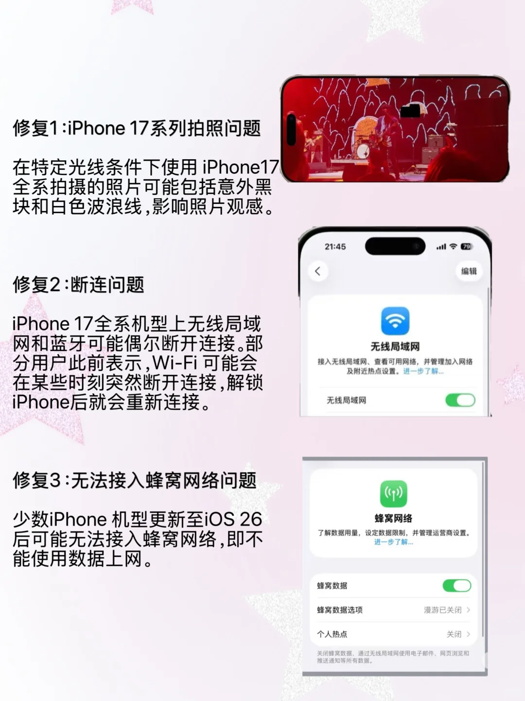 3.少数 iPhone 机型更新至iOS 26 后可能无法接入蜂窝网络。