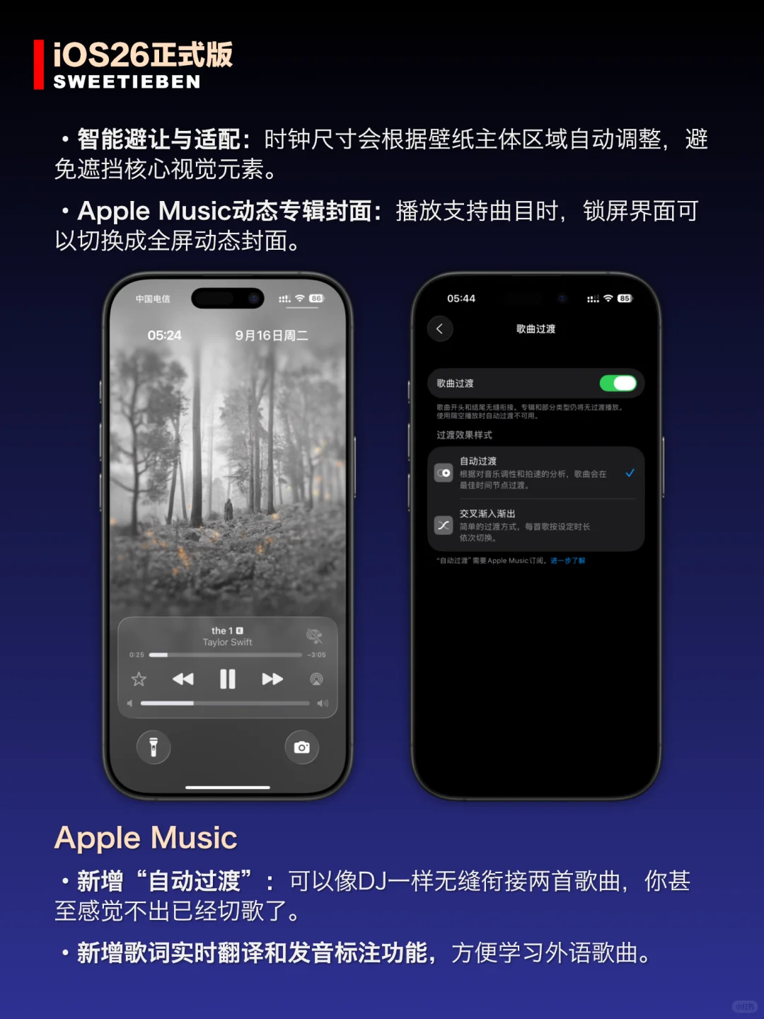 •Apple Music动态专辑封面:播放支持曲目时,锁屏界面可以切换成全屏动态封面。