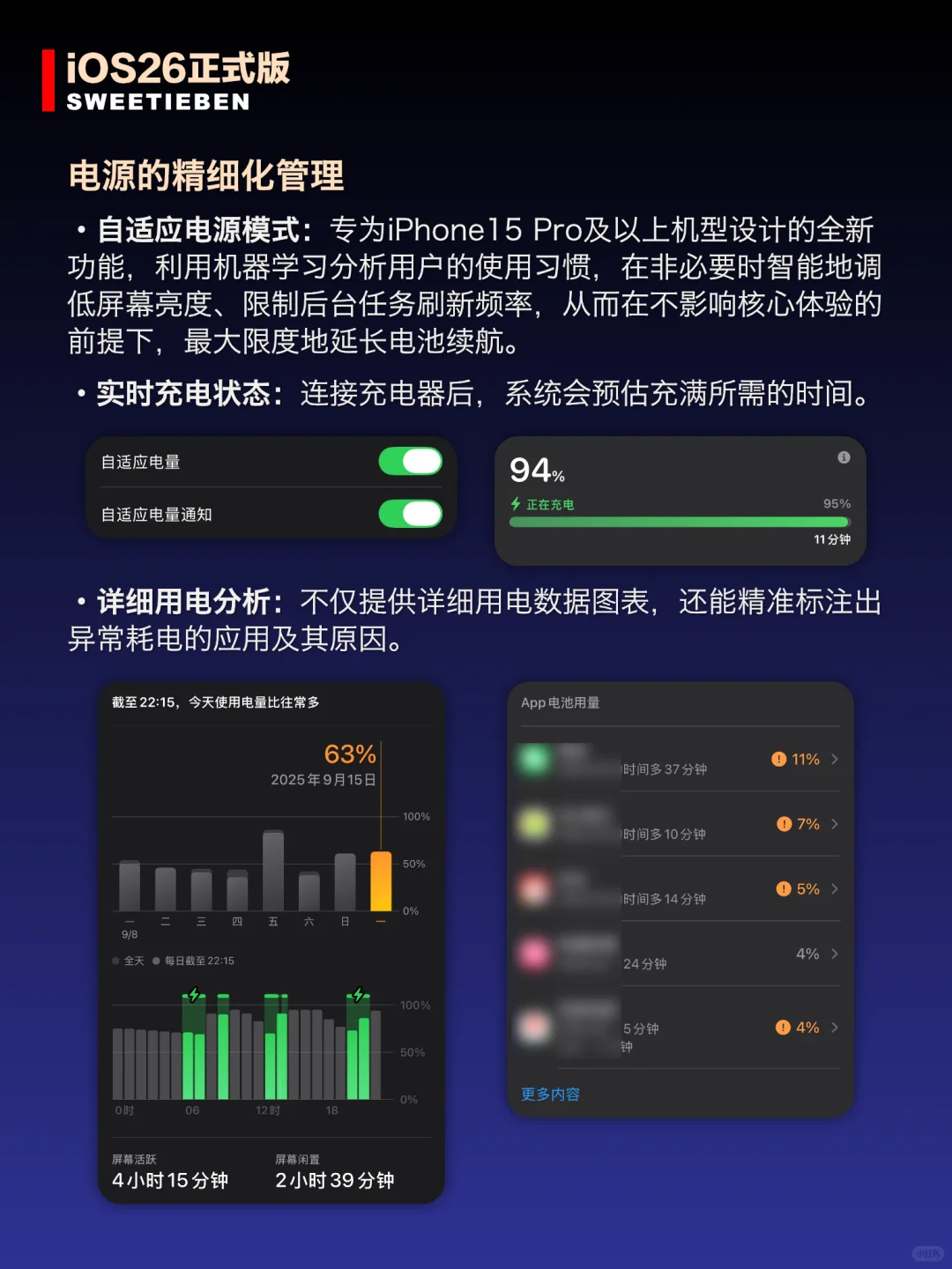 •自适应电源模式:专为iPhone15 Pro及以上机型设计的全新功能,利用机器学习分析用户的使用习惯,在非必要时智能地调低屏幕亮度、限制后台任务刷新频率,从而在不影响核心体验的前提下,最大限度地延长电池续航。