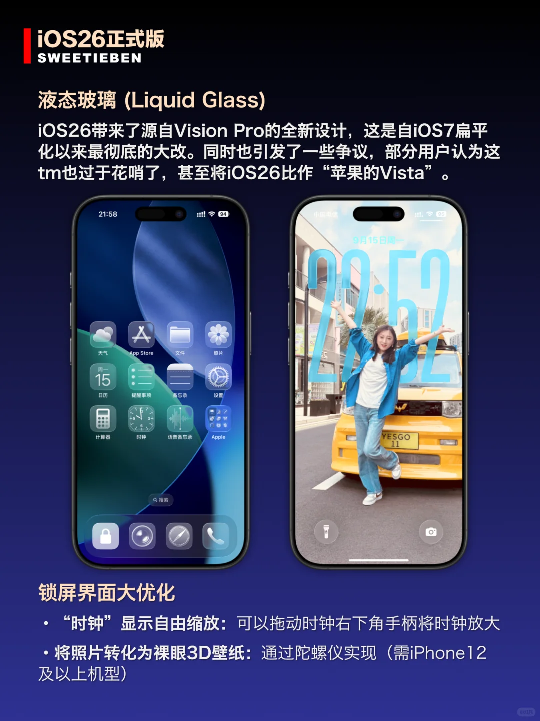 iOS26带来了源自Vision Pro的全新设计,这是自iOS7扁平化以来最彻底的大改。同时也引发了一些争议,部分用户认为这tm也过于花哨了,甚至将iOS26比作“苹果的Vista”。