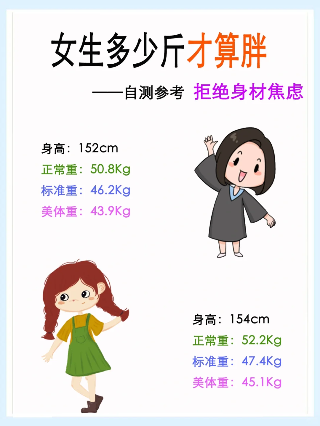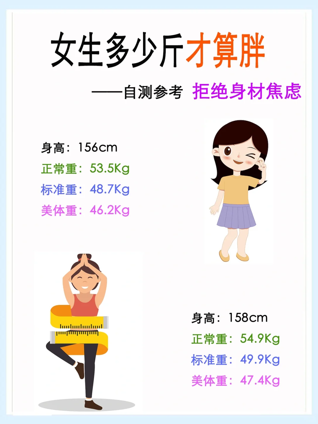 女生到底多少斤才算胖?你的身高,多少斤算正常体重?多少斤算标准体重?多少斤算美体体重?