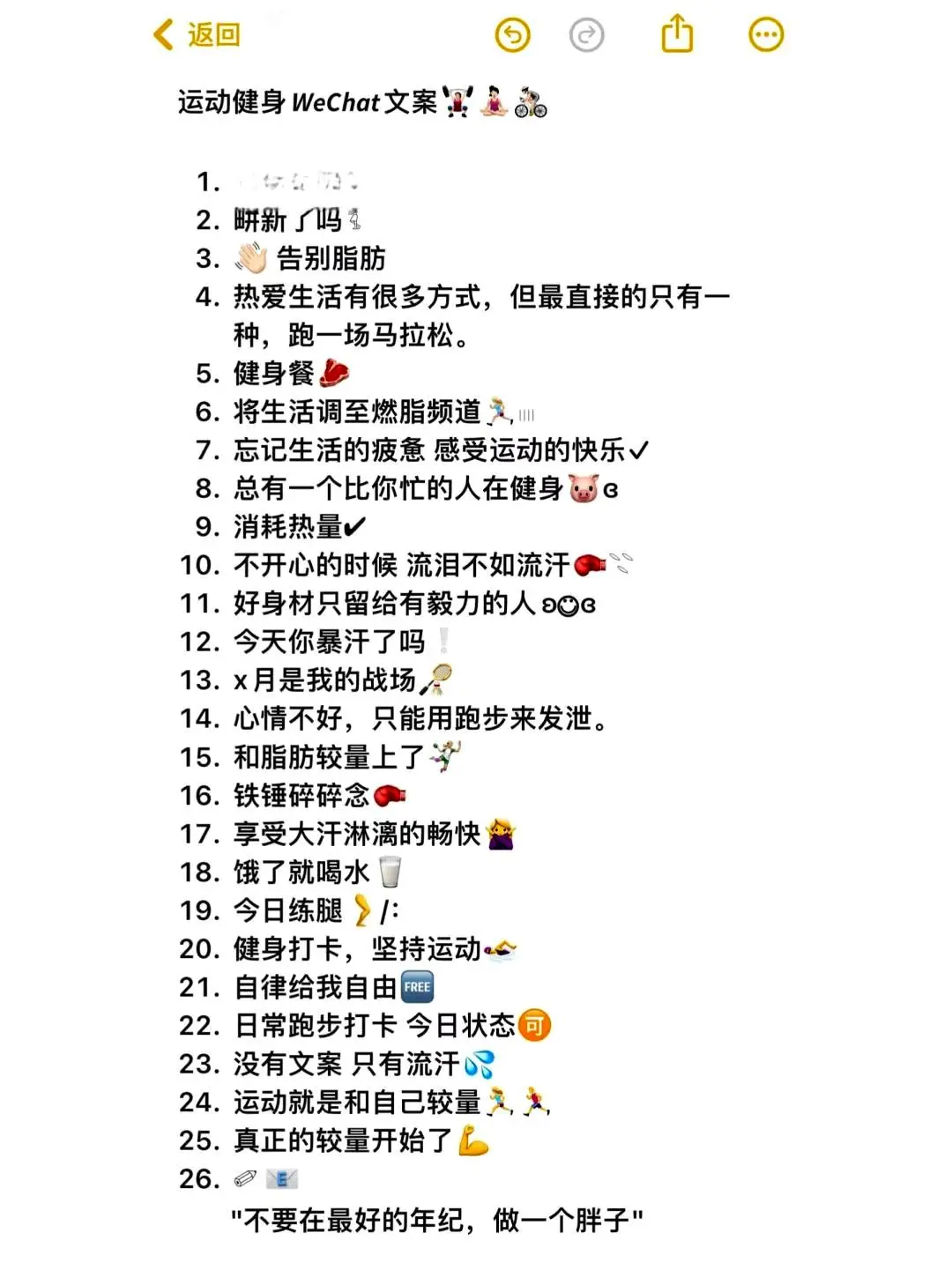1. 🥑 加油减肥中!2. 畊宏跳起来!𓀤 3. 挥手告别赘肉!4. 热爱生活的方式千千万,最直接的就是跑一场马拉松🏃。5. 健康饮食🥩6. 生活模式切换到燃脂状态🏃🏼♀️𓏽7. 忘记疲惫,享受运动的快乐✓8. 总有比你忙的人在锻炼🐷ɞ9. 燃烧卡路里✔︎10. 不开心时,汗水比泪水更有用🥊𓇢11. 美丽身材只属于坚持者ʚ◡̈⃝ɞ12. 今天你大汗淋漓了吗?13. x月,我的健身战场🏸14. 不爽时,跑步是最好的发泄方式🤫15. 和赘肉的斗争开始了!16. 铁锤碎碎念🥊17. 大汗淋漓的快感最棒!18. 饿了就喝杯水吧!19. 今天专注腿部训练!20. 健身打卡,运动不停歇!21. 自律带来自由!22. 日常跑步打卡,今天状态满分!23. 不需要文案,汗水就是最好的证明!24. 和自己的较量才刚刚开始!25.