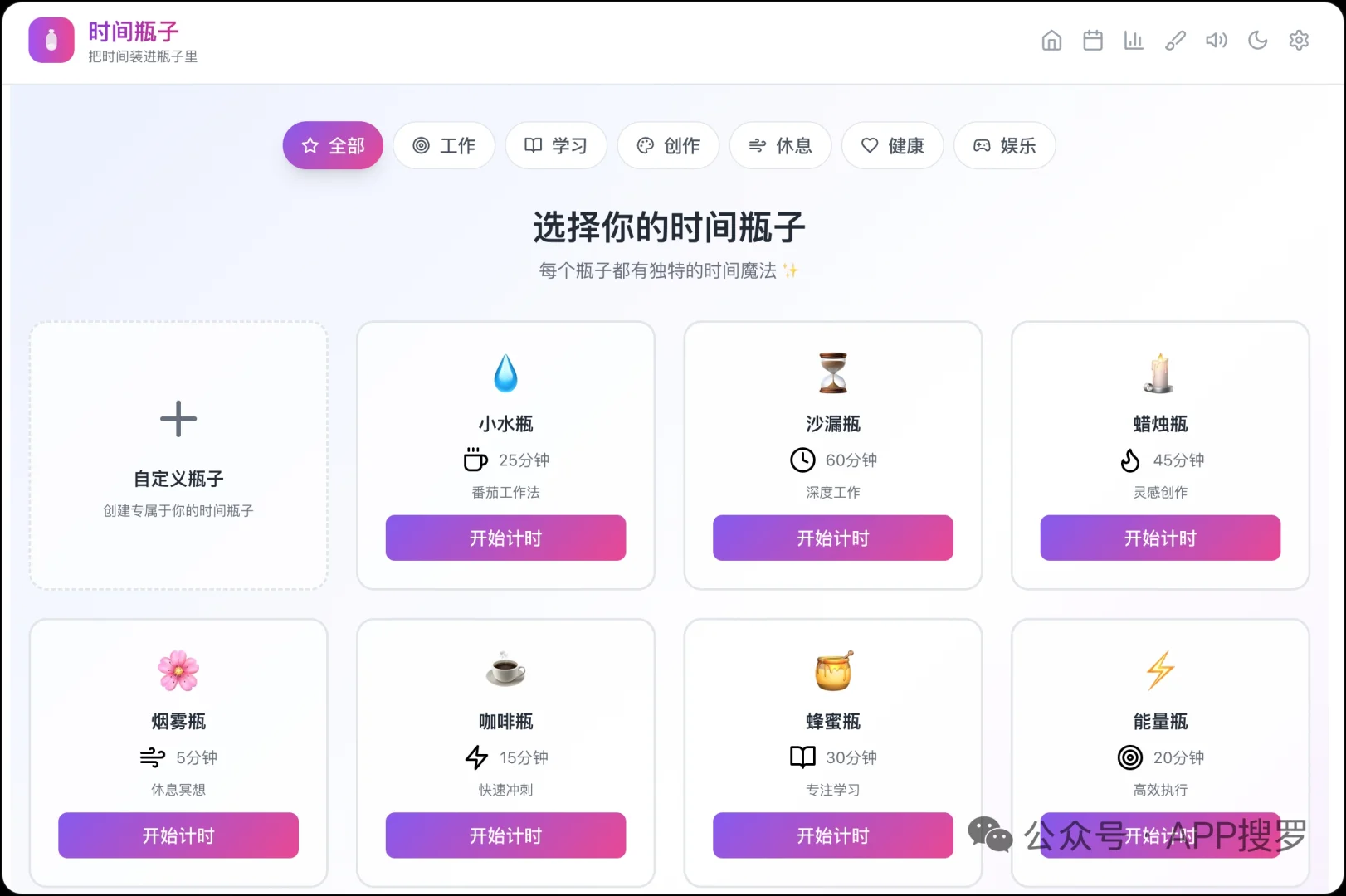 时间瓶子是一个非常棒的番茄时钟网站,界面设计好看,可以用于你学习工作沉思或者休息的时候使用。选择一个你喜欢的瓶子,然后随着时间的推移,瓶子里面的沙漏或者其他东西会减少,非常形象。