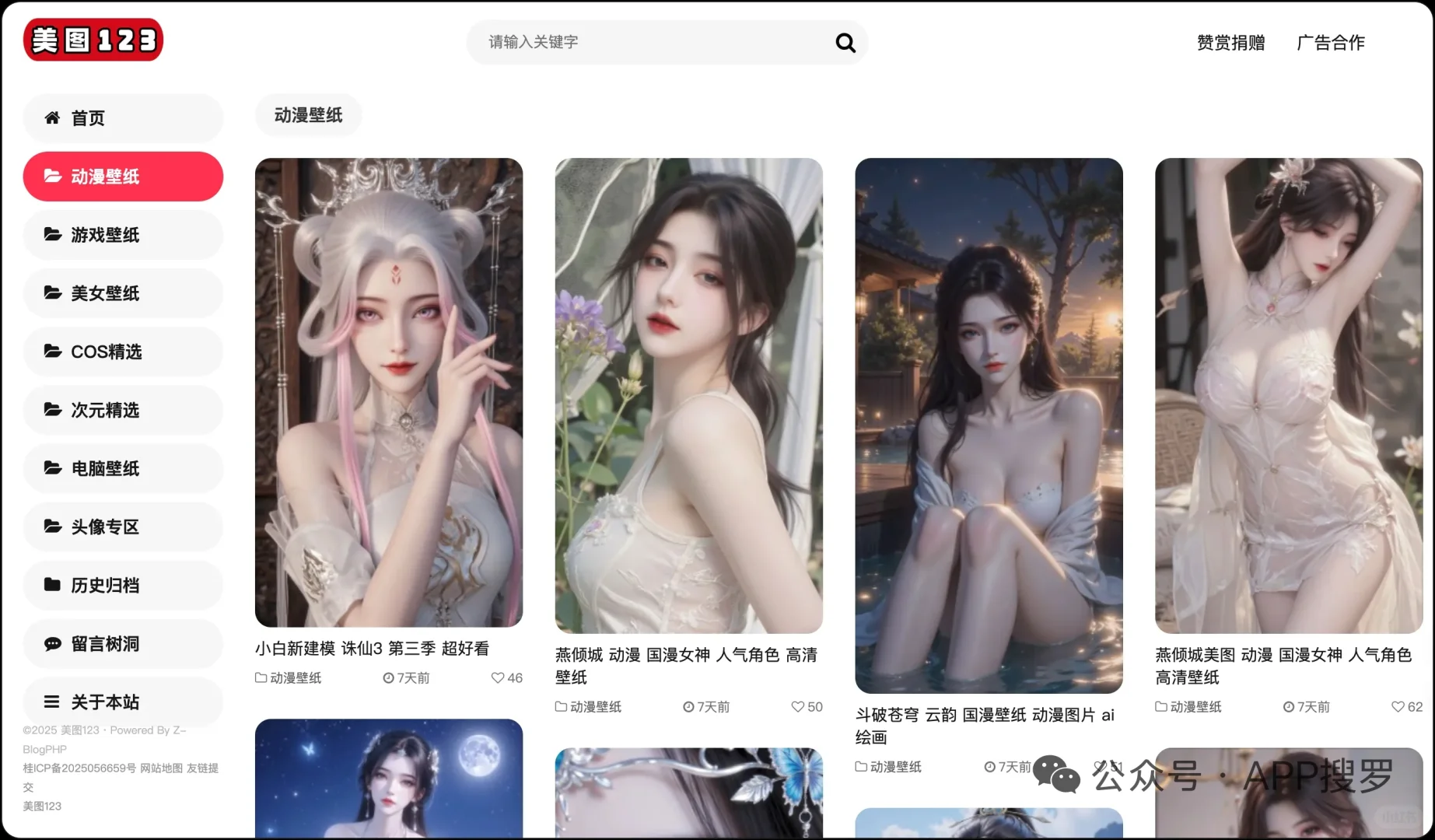 美图123是一个专注分享各种4K高清美图壁纸的网站,拥有动漫壁纸、游戏、美女、COS、电脑、头像···很多分类。所有图片清晰度都很高完全免费下载,绝对是美图收藏爱好者的福音。