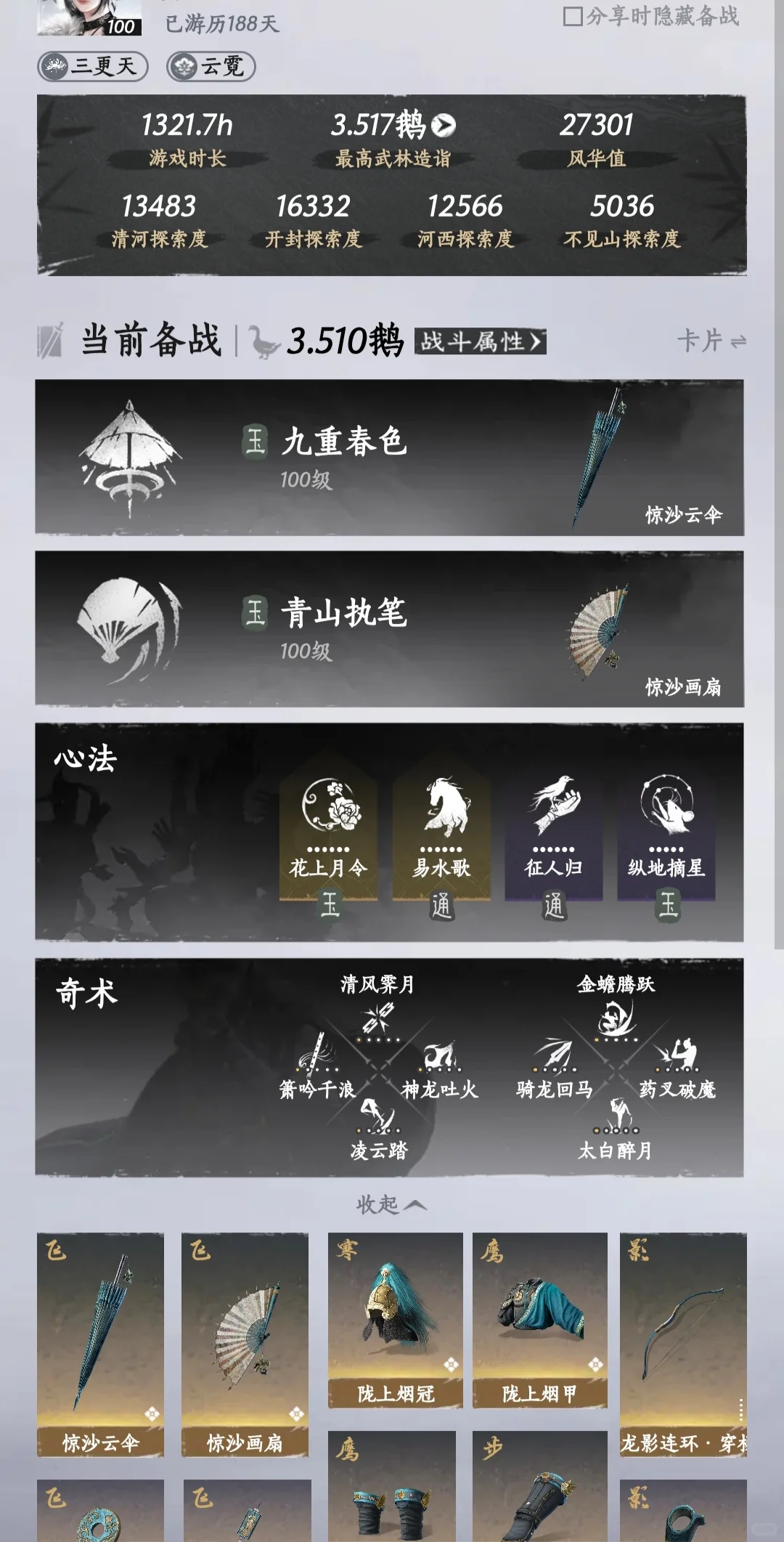 我是女玩女,目前待在三更天,平时喜欢打双排觉论剑偶尔打但只有飞花水平,会打斗地主掼蛋,家业经营得井井有条现在九级正准备升十级。虽然已玩了快两百天依旧燕瘾·九重 ,对了说到九重我玩的是玉玉,战力3.5e,虽不是大输出但打本绝对没问题。