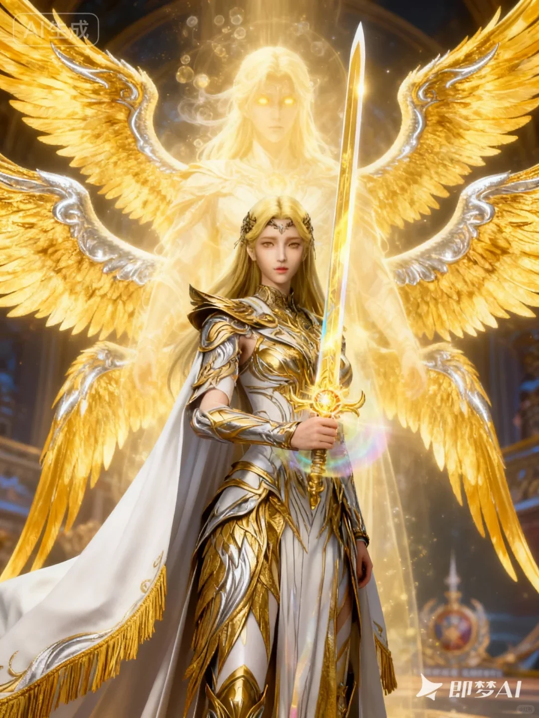 (中文版提示词):斗罗大陆武魂真身场景,女性角色千羽寒展现天使神武魂,背后浮现高大圣洁的天使神祇虚影。虚影被金色圣光包裹,光芒柔和却带着强大压迫感,背后展开三对巨大金色天使羽翼,羽翼边缘有银白色光纹,每根羽毛散发温暖光明气息;面容模糊,唯有机灵明亮如太阳的金色眼眸,饱含悲悯与威严,周身环绕淡金色光粒子,似能净化一切黑暗,尽显神圣庄严、不可亵渎的光明主宰气场。