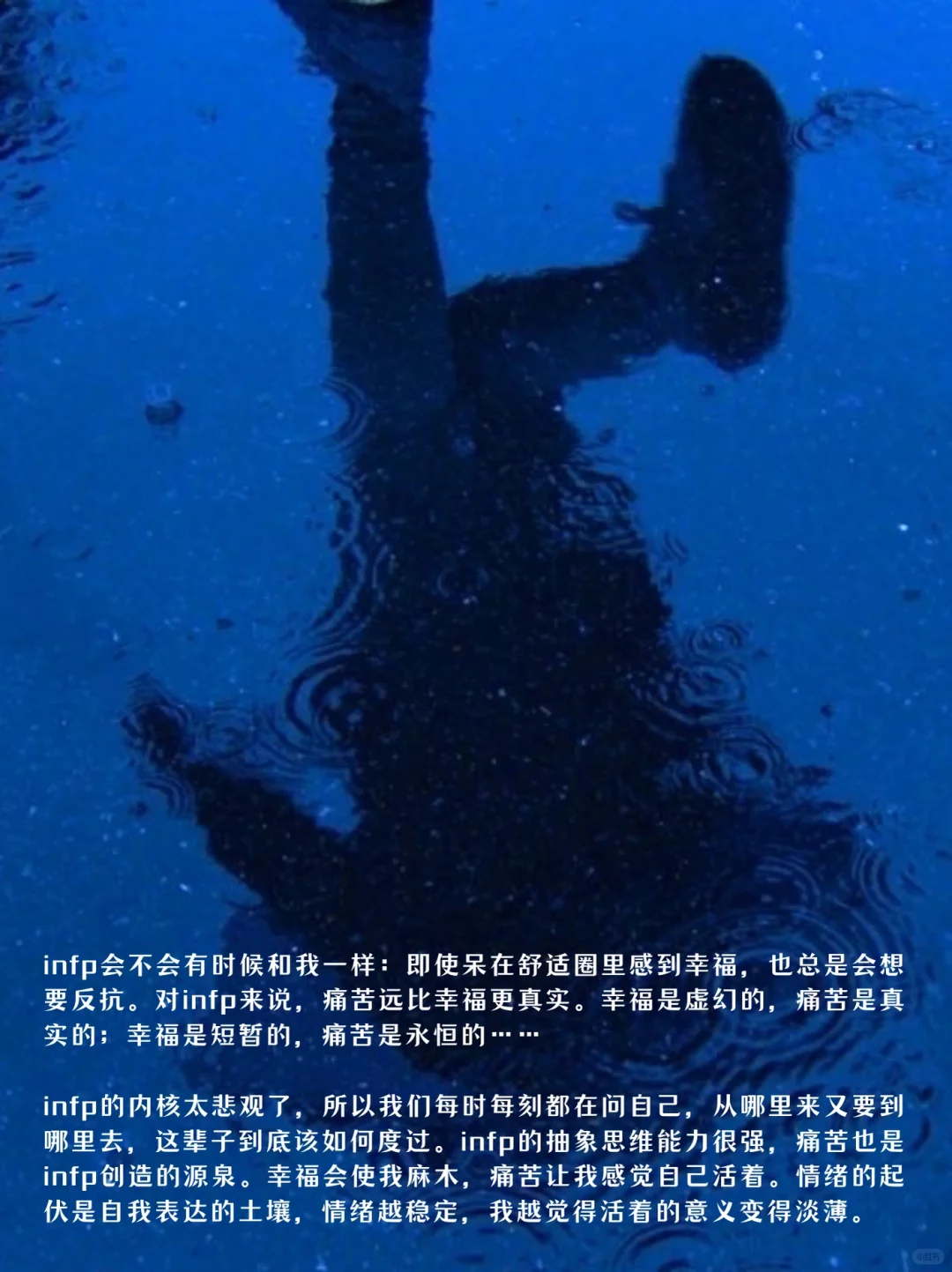 :有时候真的觉得infp人格的设定很带感,极致反差,迷人又难以捉摸。她从天边的一朵云走来,纯洁无瑕,闪耀着淡蓝色的微光;她像天神下凡历练,有着极大的慈悲与包容,却知晓世间最深处的黑暗;她常常沉默地行走,不与任何人为伍,永葆初心;她孤独却坚定,适时勇敢地反击;她看淡一切,附身凝望整个社会与人类……