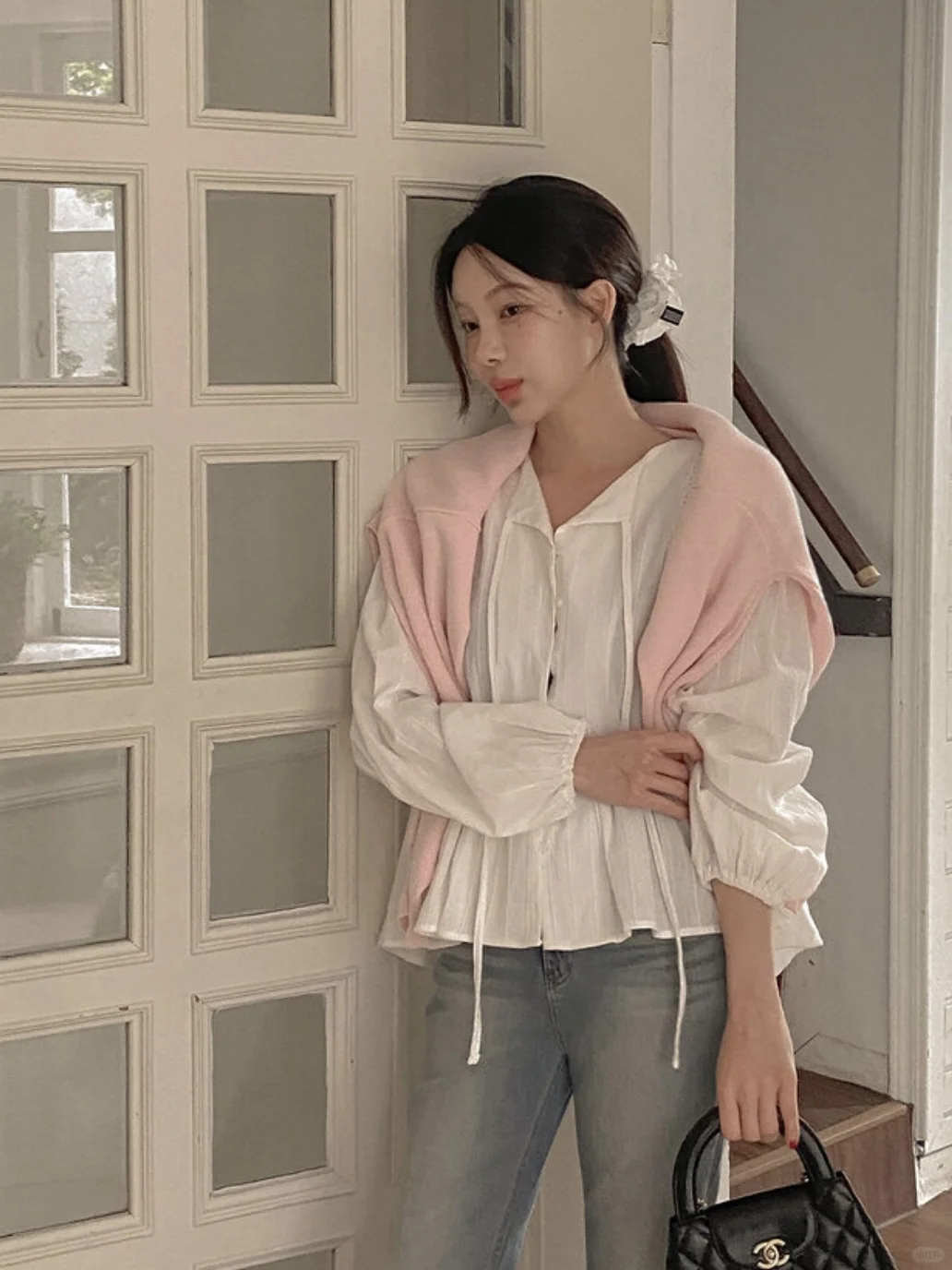 灯笼袖系带上衣