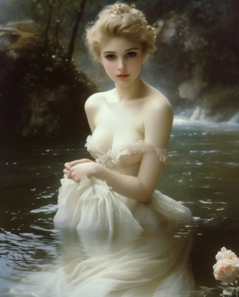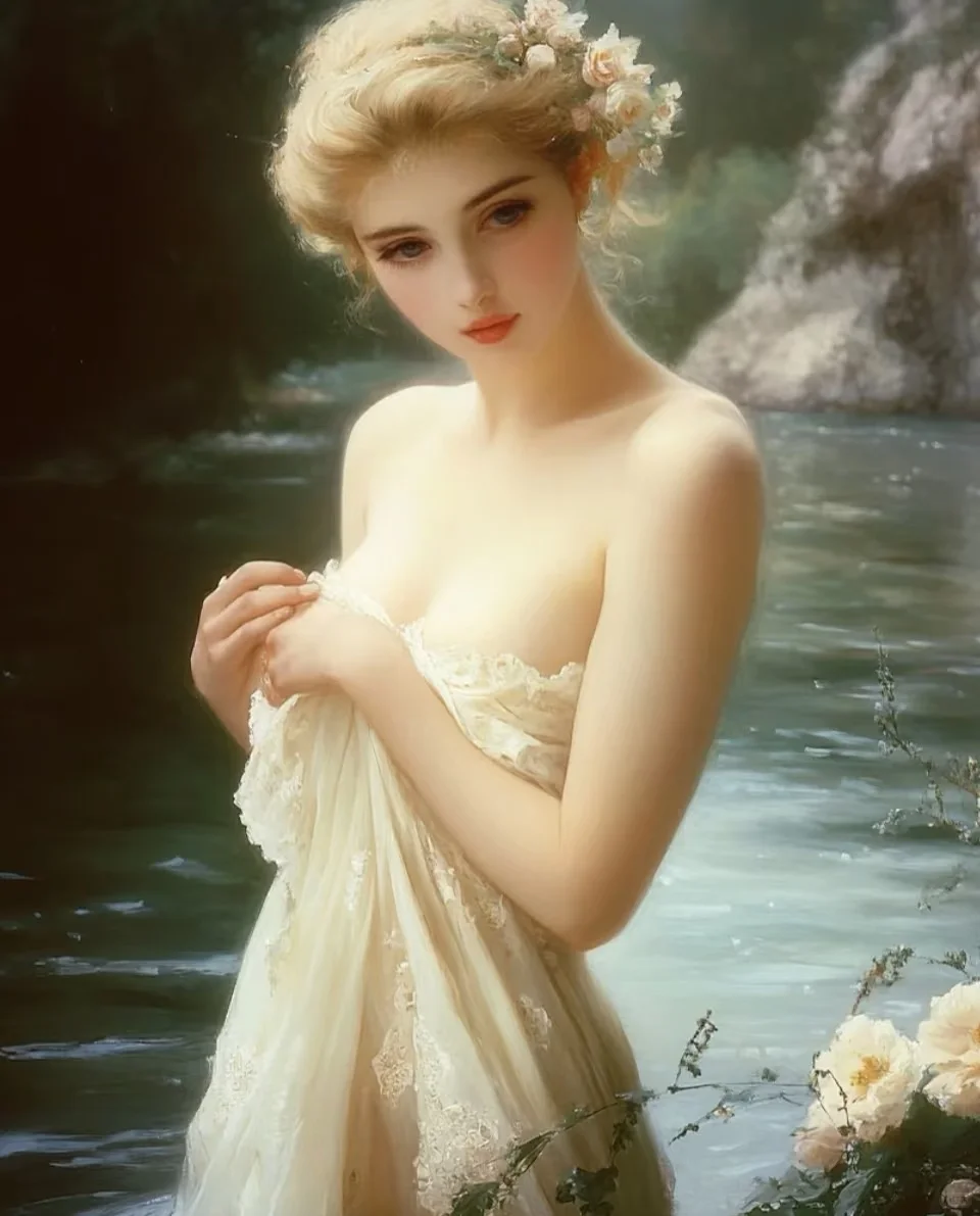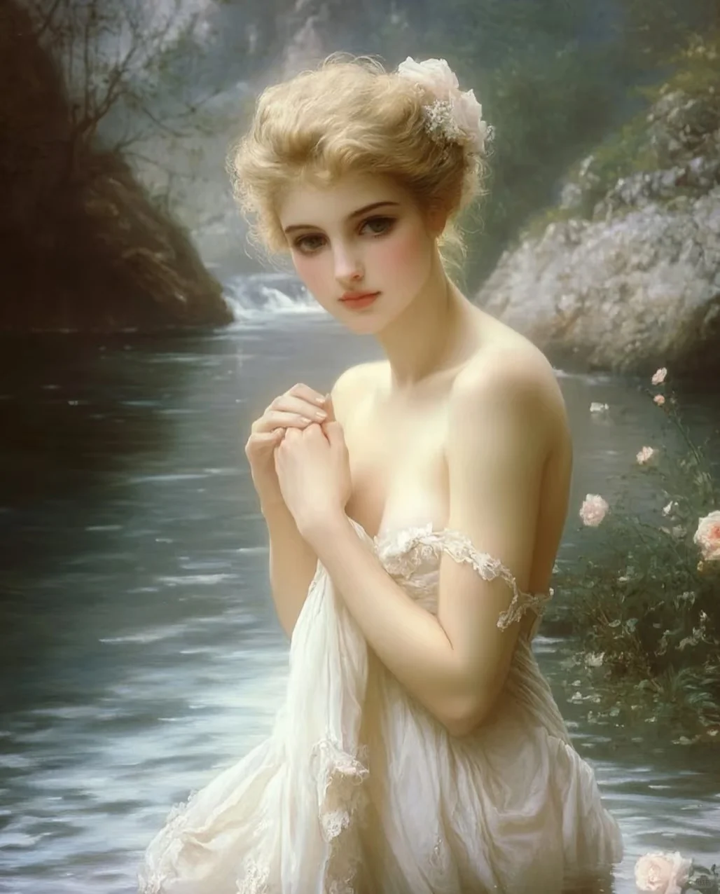 在浪漫主义艺术的长河中,有这样一幅令人心旷神怡的作品——油画《水中的阿狄丽娜》(又名《水边的仙女》)。这幅画作以19世纪法国浪漫主义艺术风格为灵感,深受著名画家威廉·阿道夫·布格罗(William-Adolphe Bouguereau)的影响,展现了纯美与浪漫的完美交融。🌿