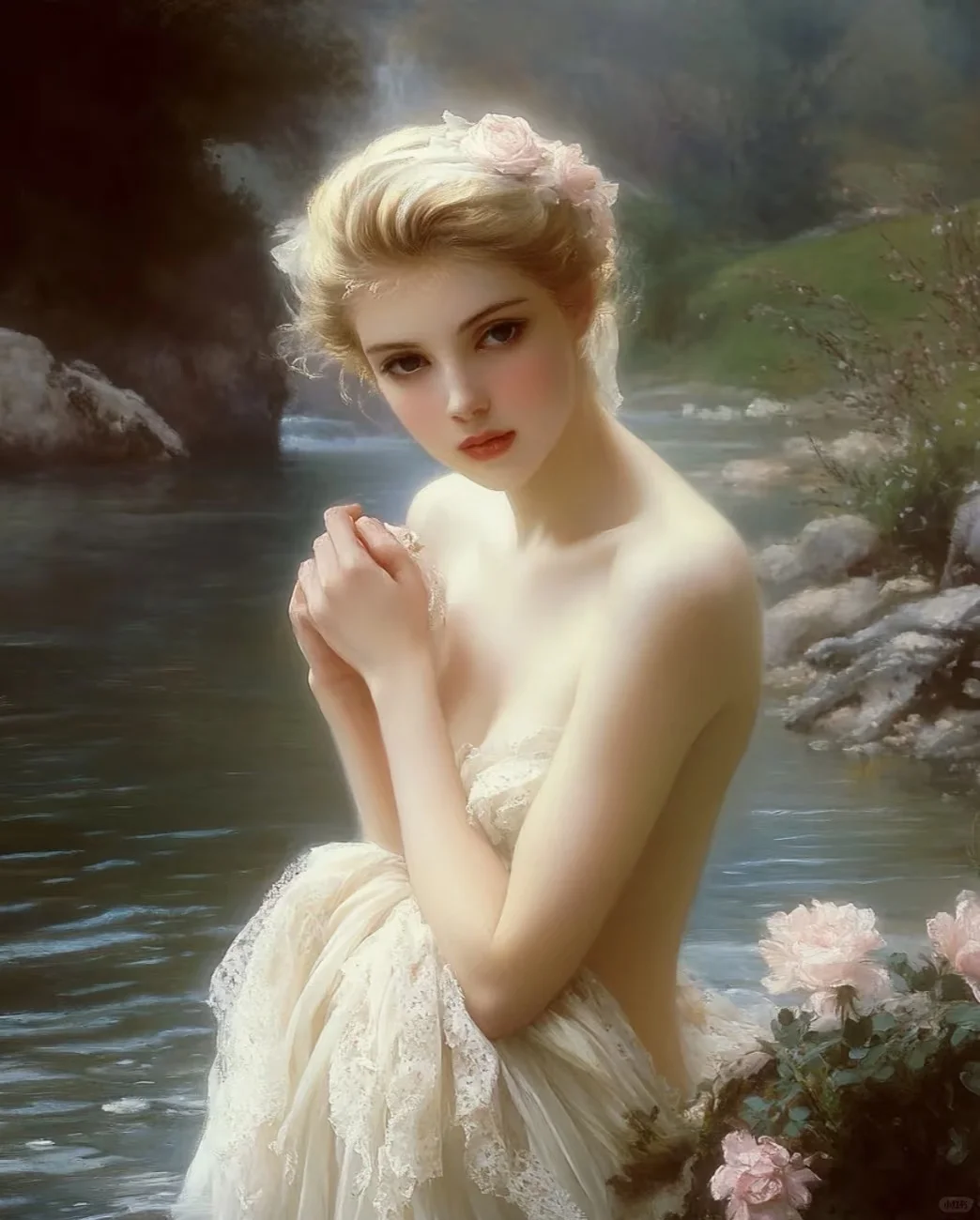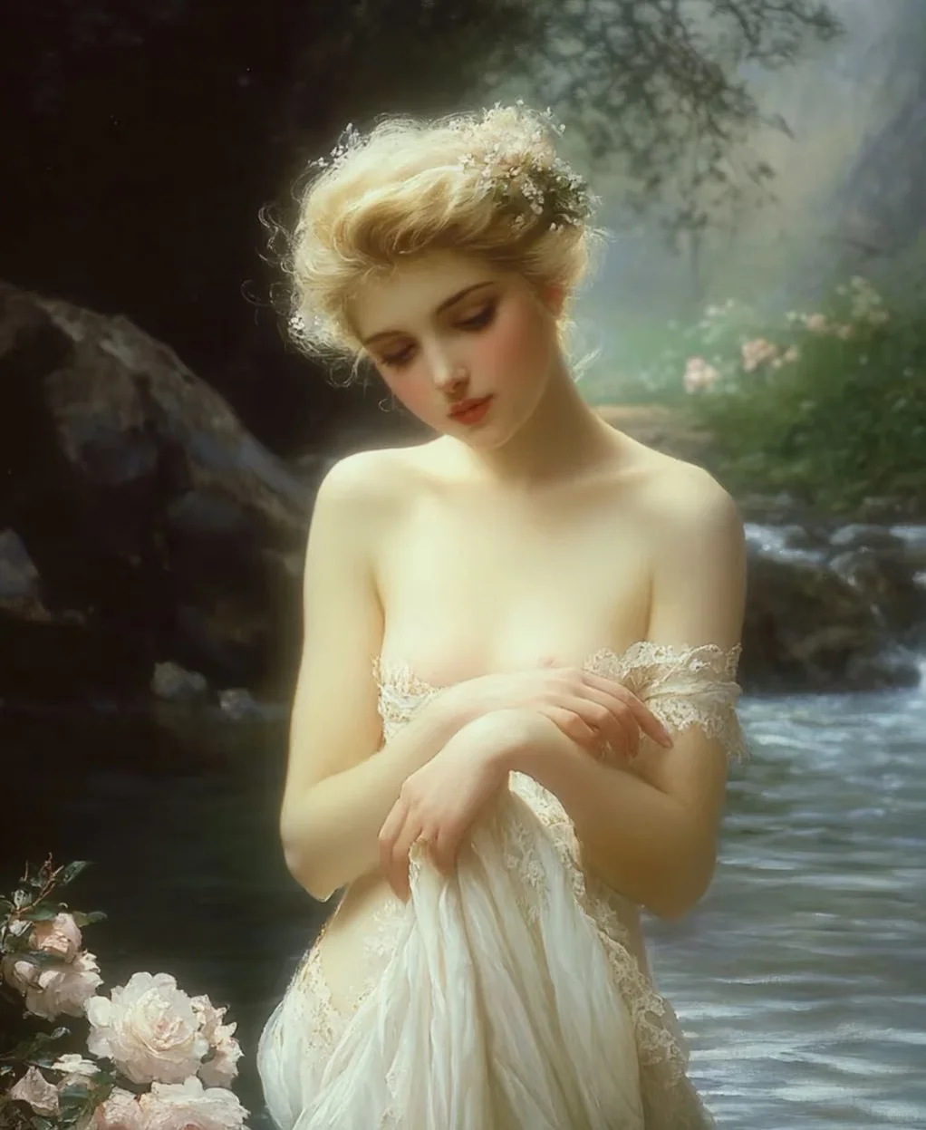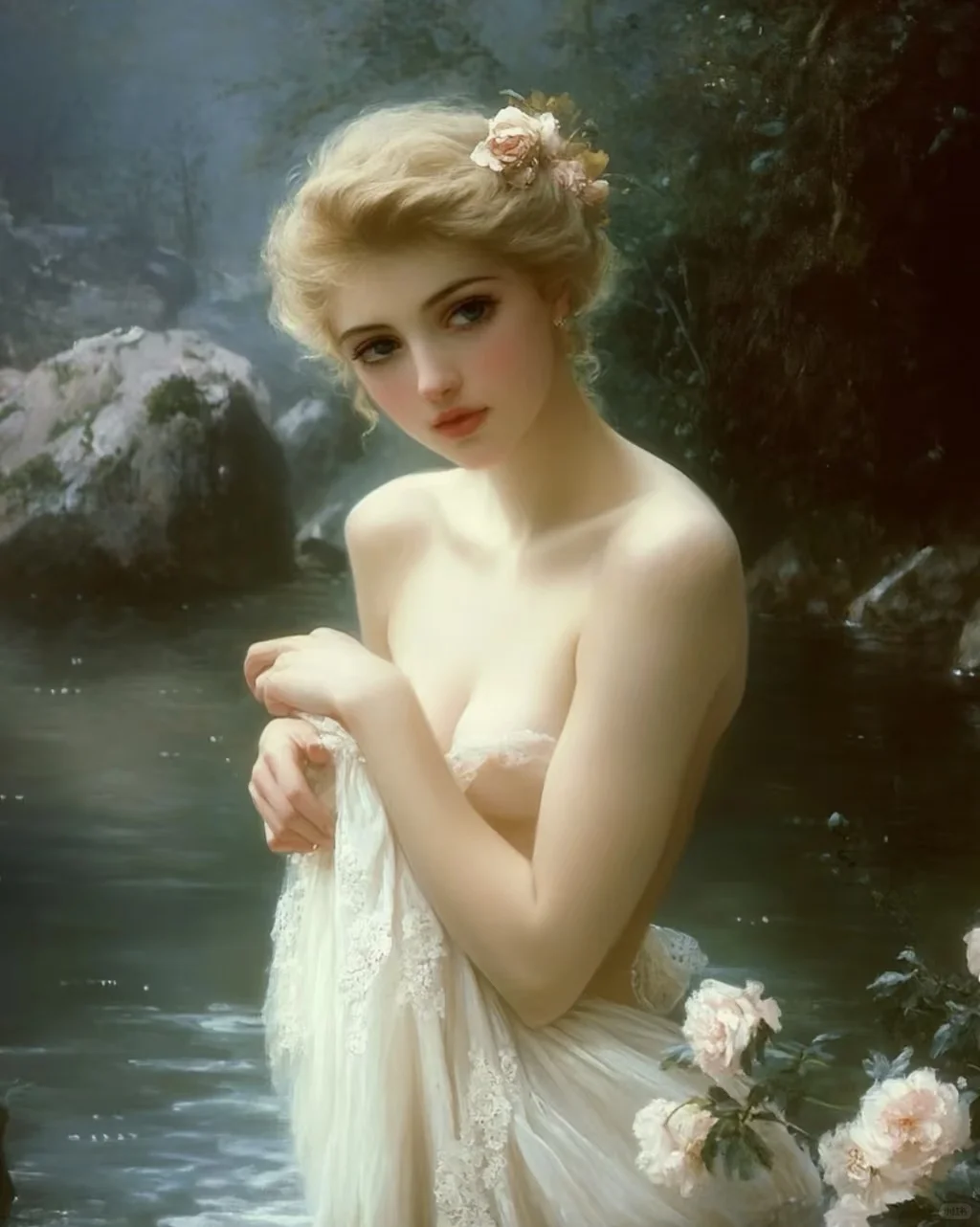 在浪漫主义艺术的长河中,有这样一幅令人心旷神怡的作品——油画《水中的阿狄丽娜》(又名《水边的仙女》)。这幅画作以19世纪法国浪漫主义艺术风格为灵感,深受著名画家威廉·阿道夫·布格罗(William-Adolphe Bouguereau)的影响,展现了纯美与浪漫的完美交融。🌿