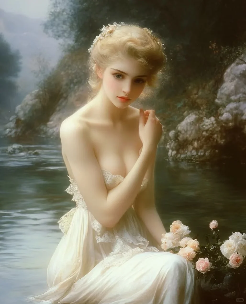 在这幅《水中的阿狄丽娜》中,画中的少女亭亭玉立于清澈的河水之中,肌肤白皙如瓷,面容柔美而宁静,眼神温柔而含蓄,仿佛在诉说着无声的故事。流水轻柔地流淌,身后的自然景致与人物相映成趣,进一步凸显了画中人物的柔美与宁静。布格罗笔下的女性,总是散发着一种超凡的优雅与纯净,仿佛来自遥远的神话世界。🌸