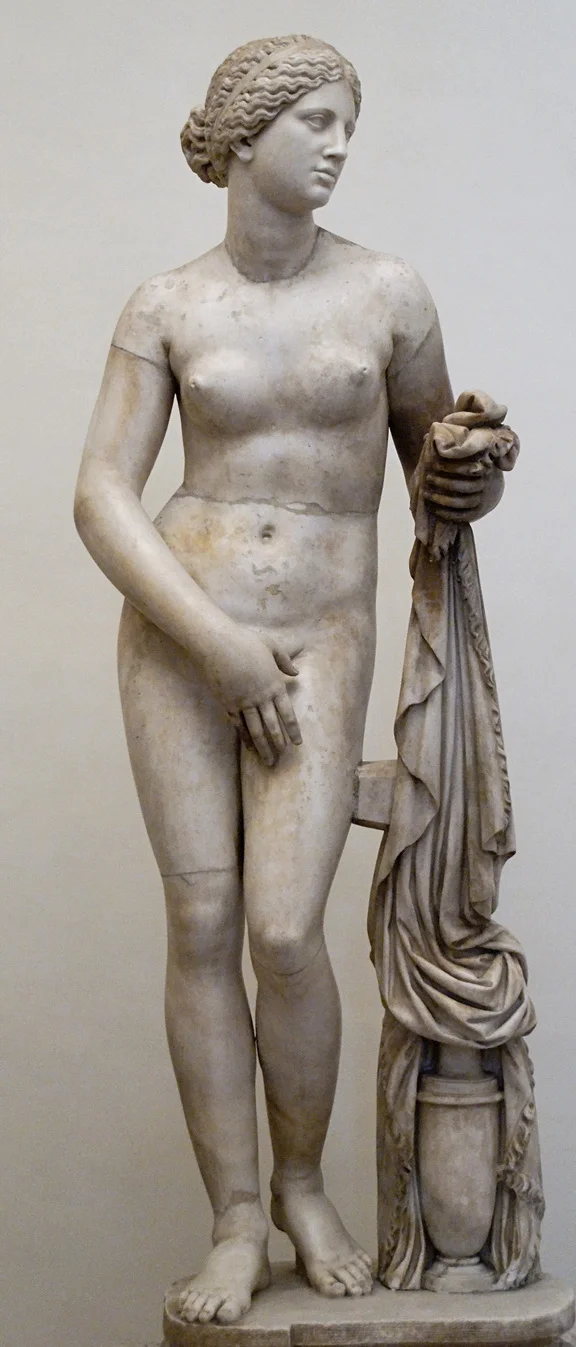 图1.普拉克西特列斯的《克尼多斯的阿佛洛狄忒》复制品,约公元前364-361年(复制品由意大利人伊波利托·布齐于1562至1634年间创作;普拉克西特列斯的原作被认为是古典雕刻中的第一座大型女性裸像,属于古希腊艺术的的古典时期作品),古代希腊雕刻——大理石雕像,收藏于意大利罗马的罗马国立博物馆阿尔坦普斯宫。