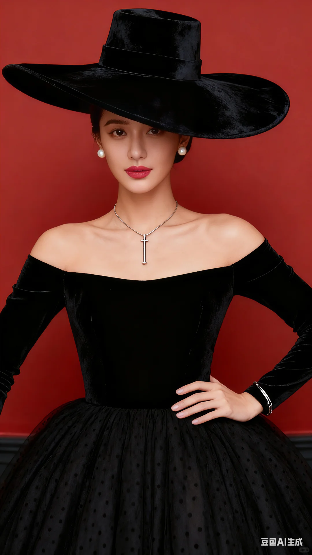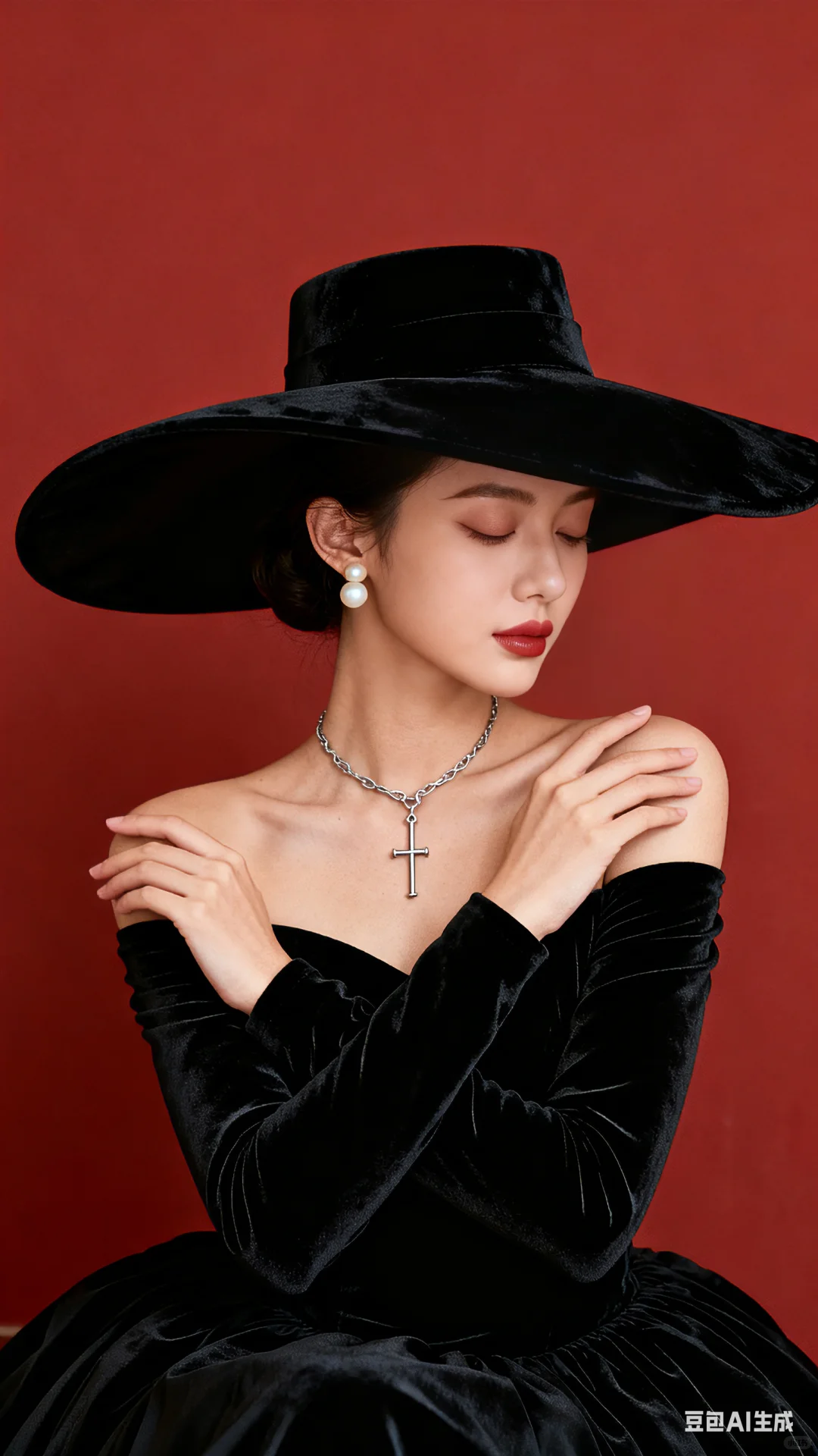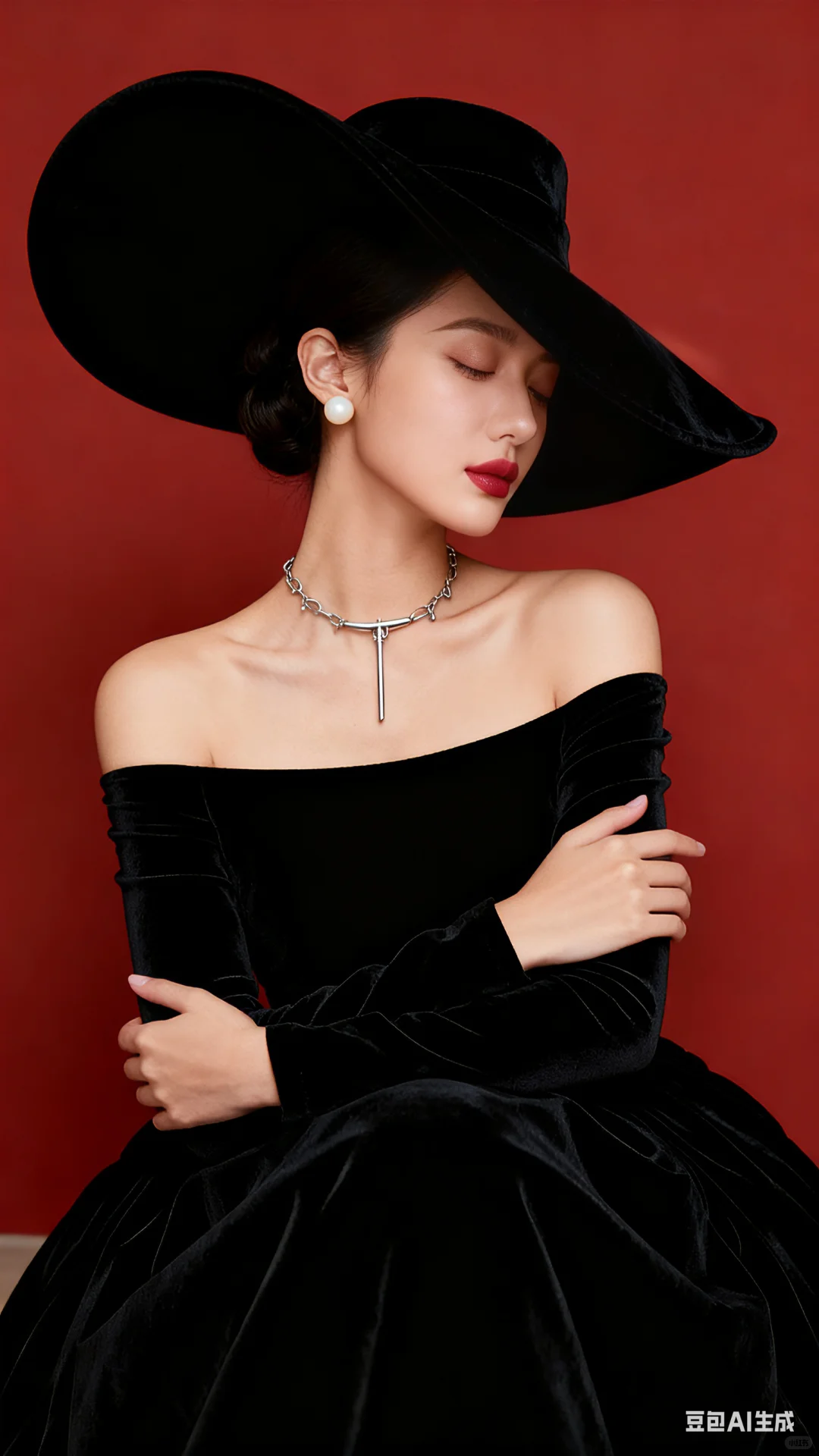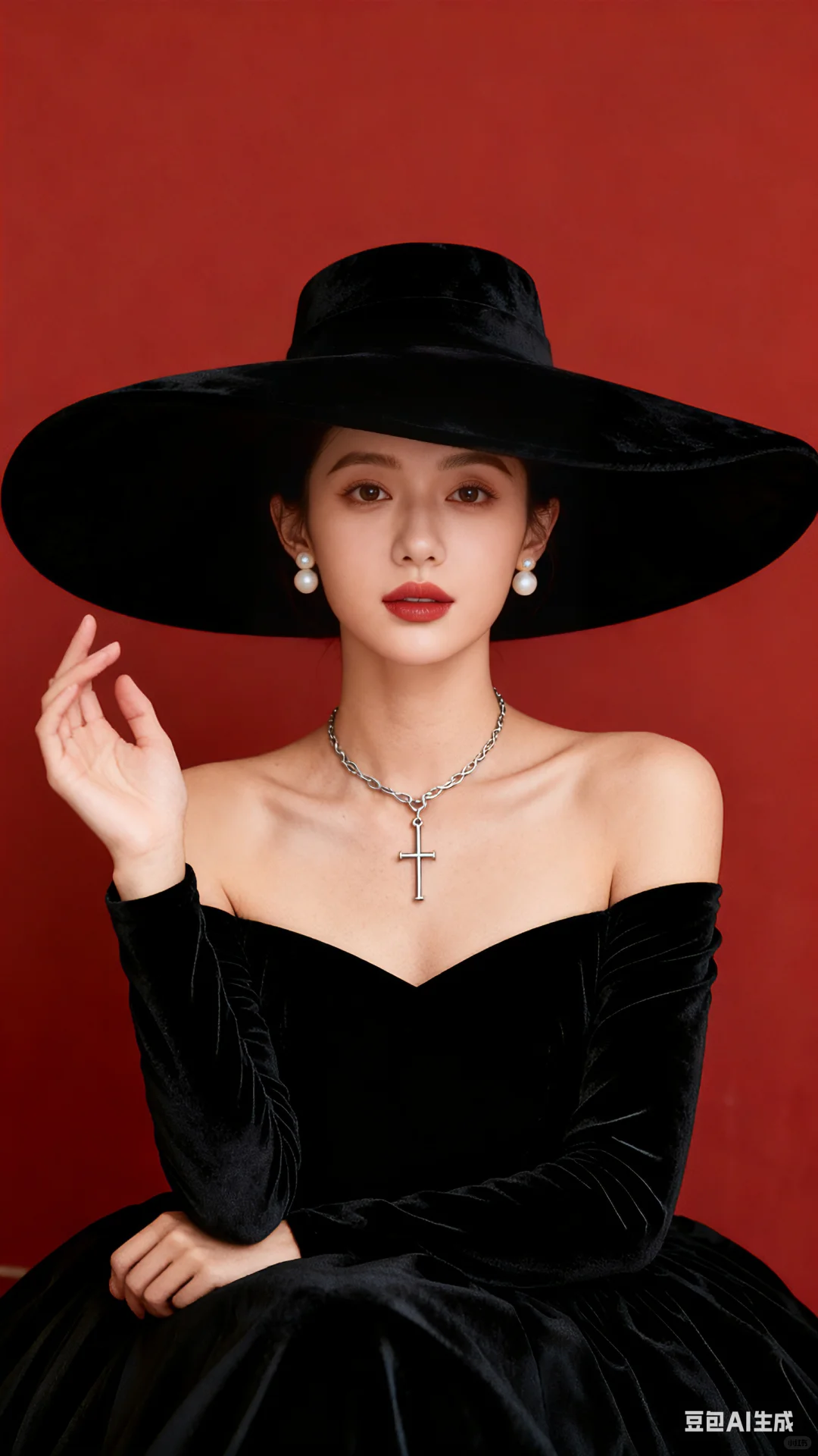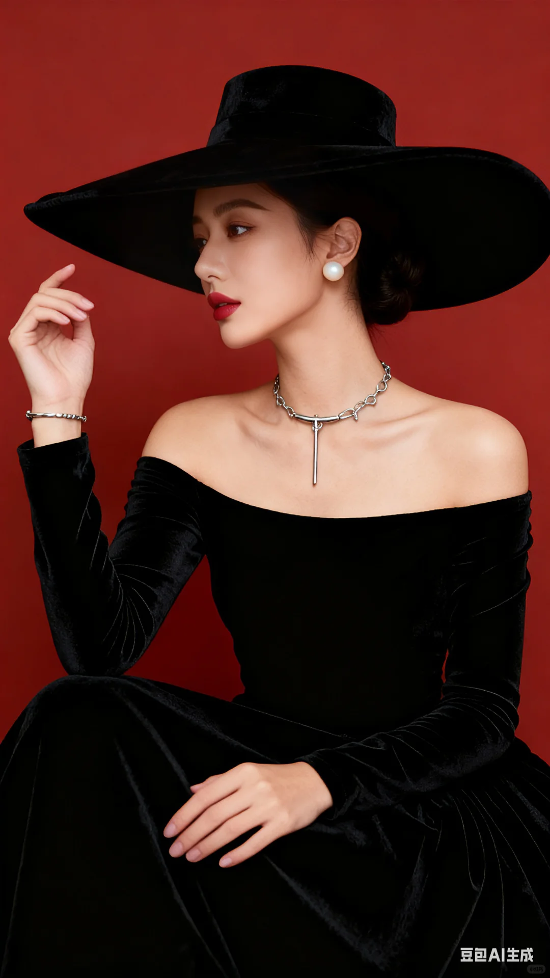帮我生成四张不同姿势的人物写真,三分线构图,高贵优雅的少女居中,第一张正坐头部向右微侧低头闭眼瞑想,双手交叉举起,左手靠于右肩,右手伸出左中肩部,第二张正坐着看向相机镜头,右手抬起,左手自然放于右手肘下方,第三张正坐头部向右侧望右前方,双手臂大交叉放于大腿上,第四张正坐头部向左微侧看左前方,皮肤浅小麦色透点白,穿一件黑色丝绒面料一字领露肩长袖蓬蓬长款连衣裙,雾感浅红色唇釉,佩带米白色珍珠耳钉,戴古银穿针式吊链项链,右手戴古银色细手链抬起垂直,左手自然放于膝部或腰部,高光打亮五官,盘发戴一米宽超大黑色赫本风丝绒大檐帽,帽沿边稍向上翻,莫兰迪大红色墙面,人物上半身近景画面,增强眼部神采,陶瓷肌肤,皮肤光滑,高级磨皮,高级去噪,高级柔光,32K细腻真人皮肤纹理,摄影大片光感 。比例9:16#赫本风 #赫本风写真 #做自己女王 #优雅与高贵 #优雅与自信 #骨子里的优雅 #豆包#豆包动图 #豆包ai#豆包p图指令