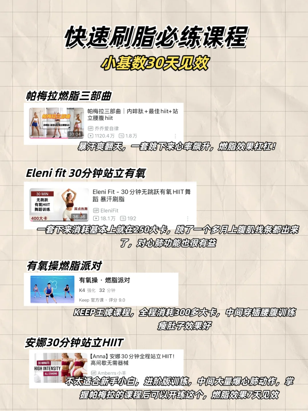 有氧无氧双结合,小基数宝宝无氧时间可以占比多点,像我运动安排通常是30分钟有氧,30分钟腰腹训练,10分钟拉伸,训练频率一周4次,至少保证好好休息一天,训练的课程都是我自己练下来效果给力的!