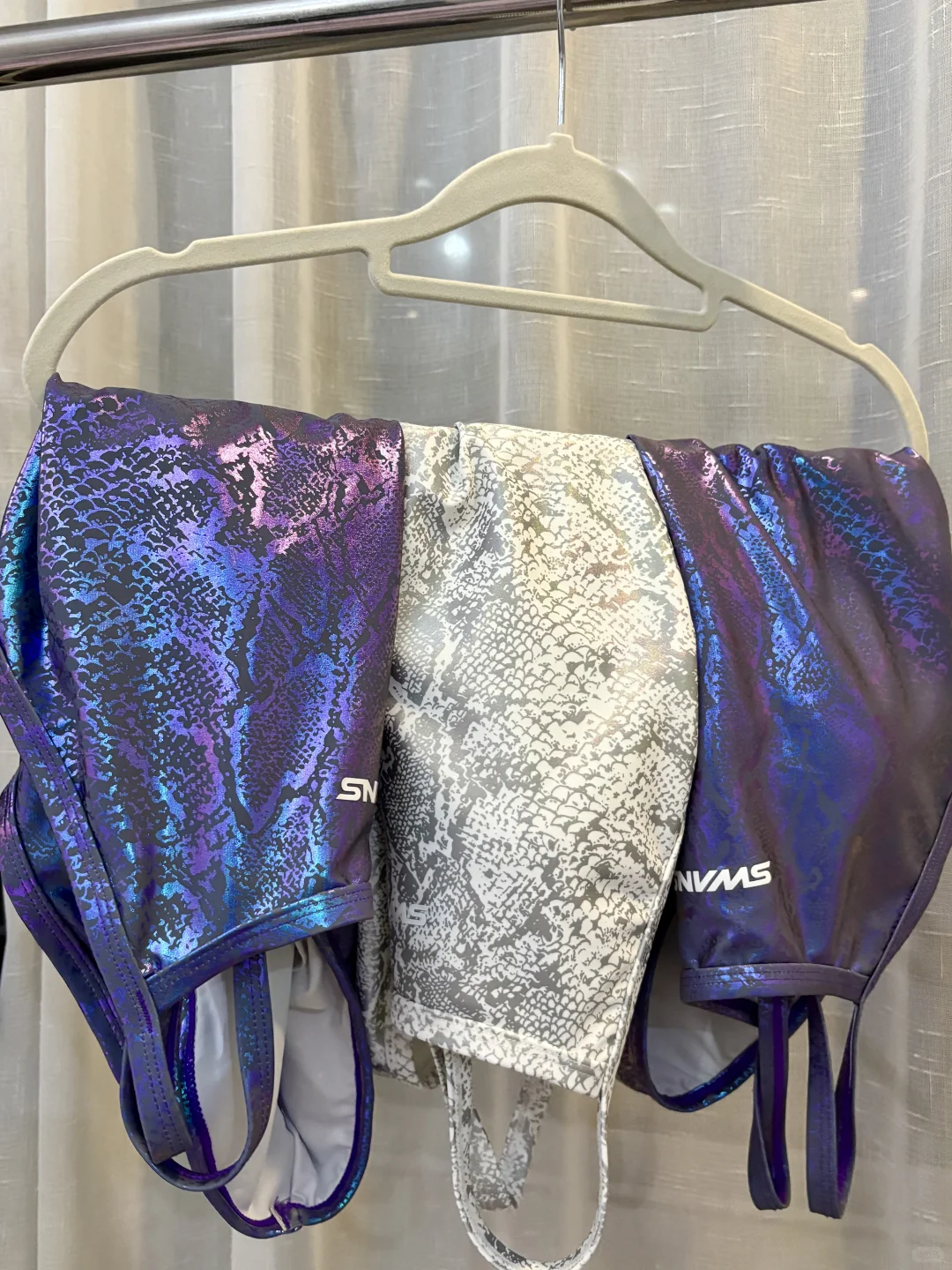 1️⃣swans紫蟒双层:我的第一件三角款泳衣,新手阶段全靠它撑着。中低叉裹得稳,安全感拉满,像我这种梨形身材,穿它特别能修饰腰臀线条。