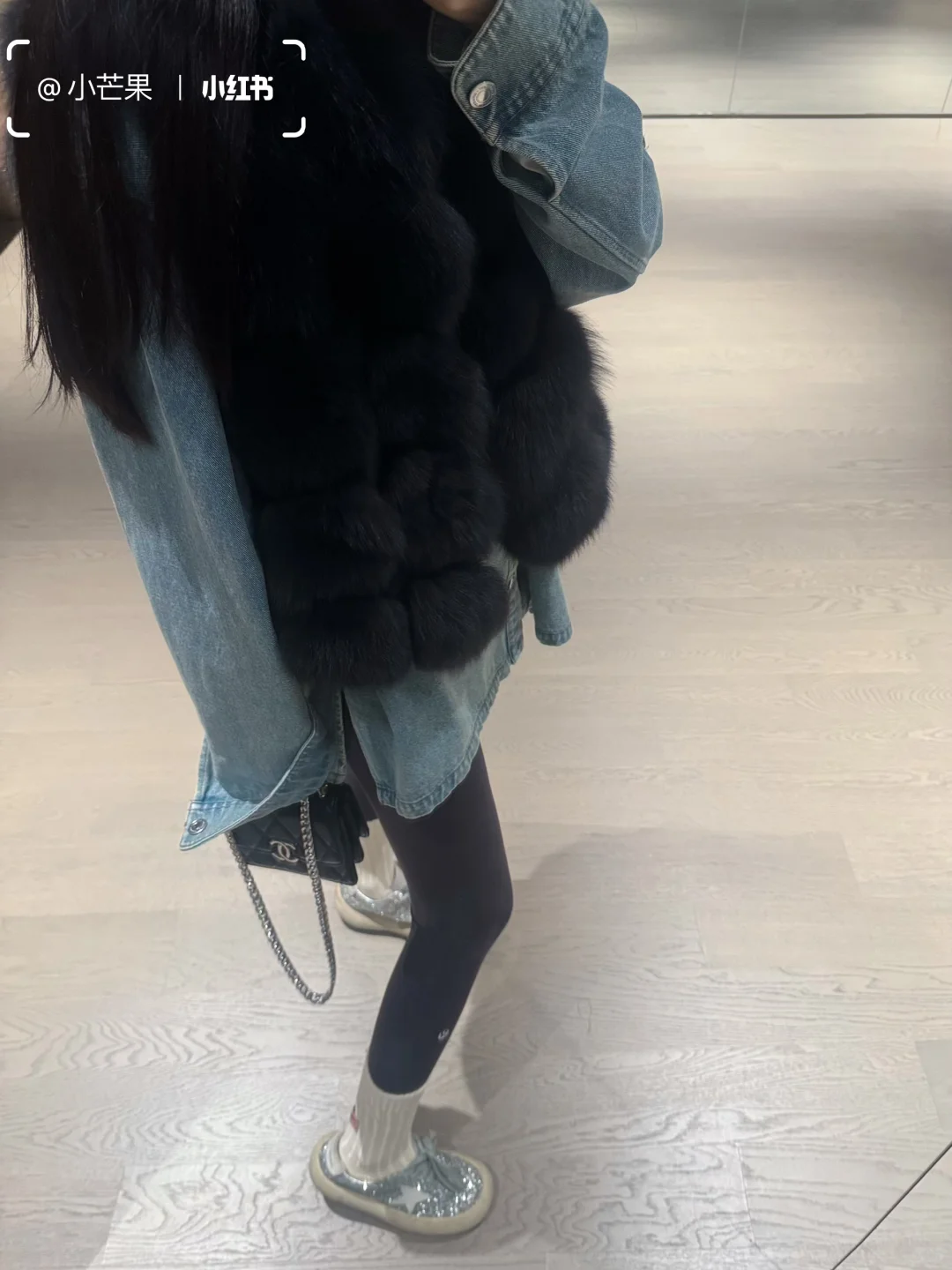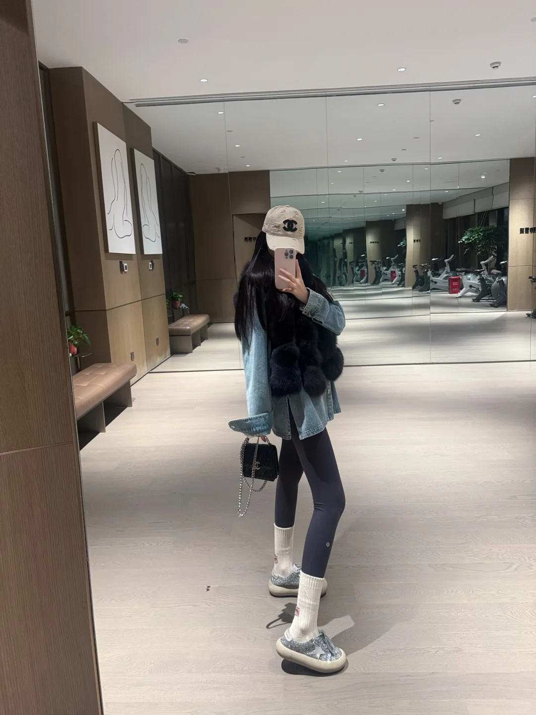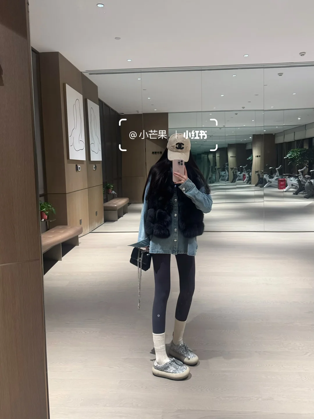 中年美女有三宝牛仔衬衫➕瑜伽裤➕狐狸毛马甲