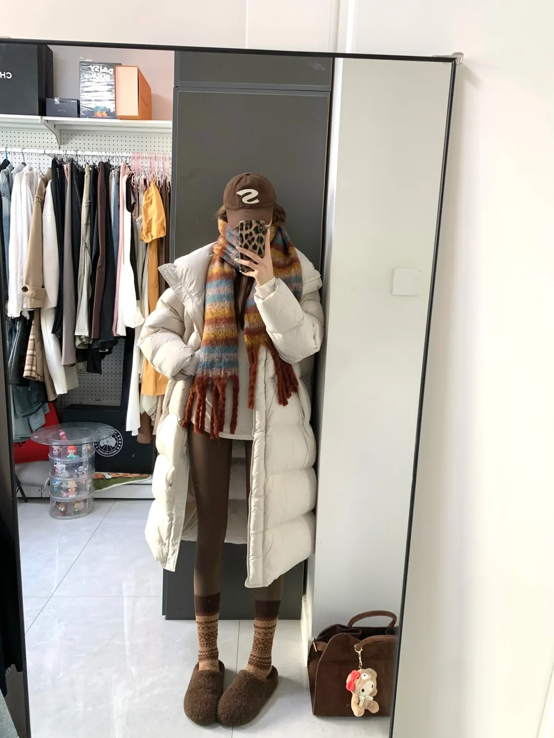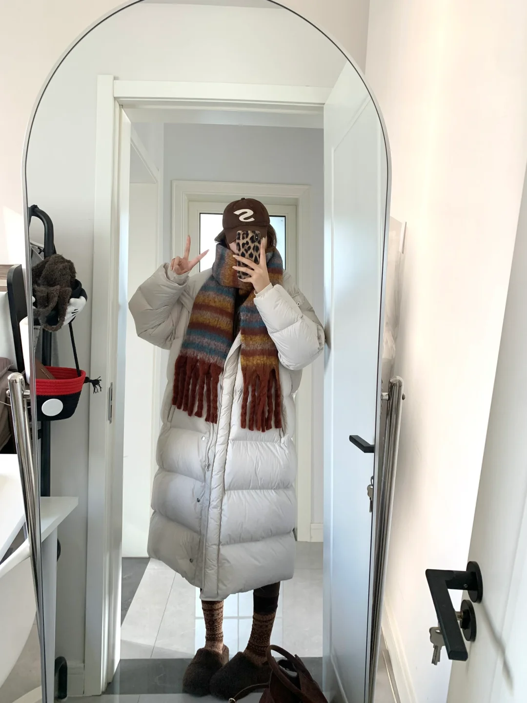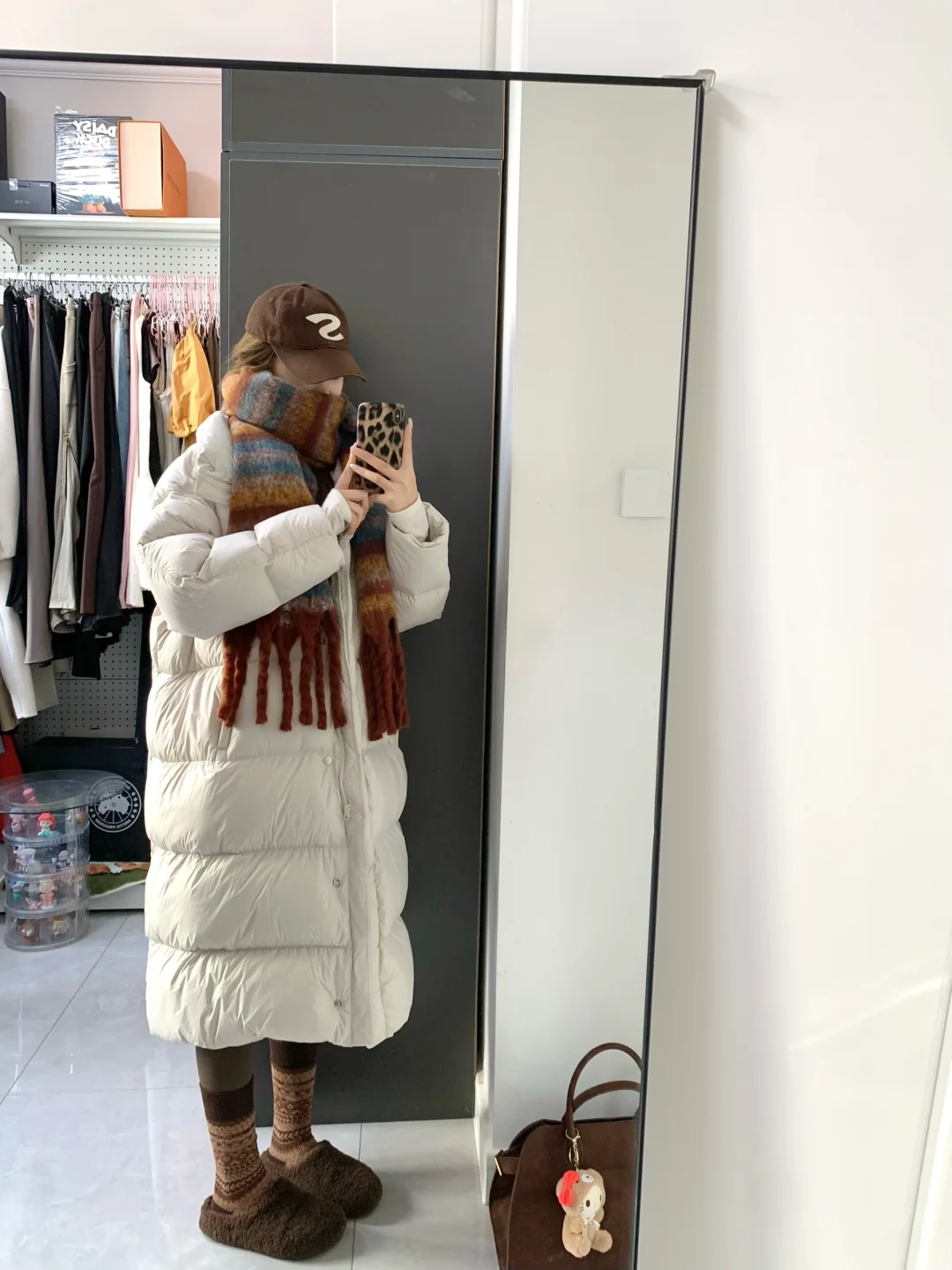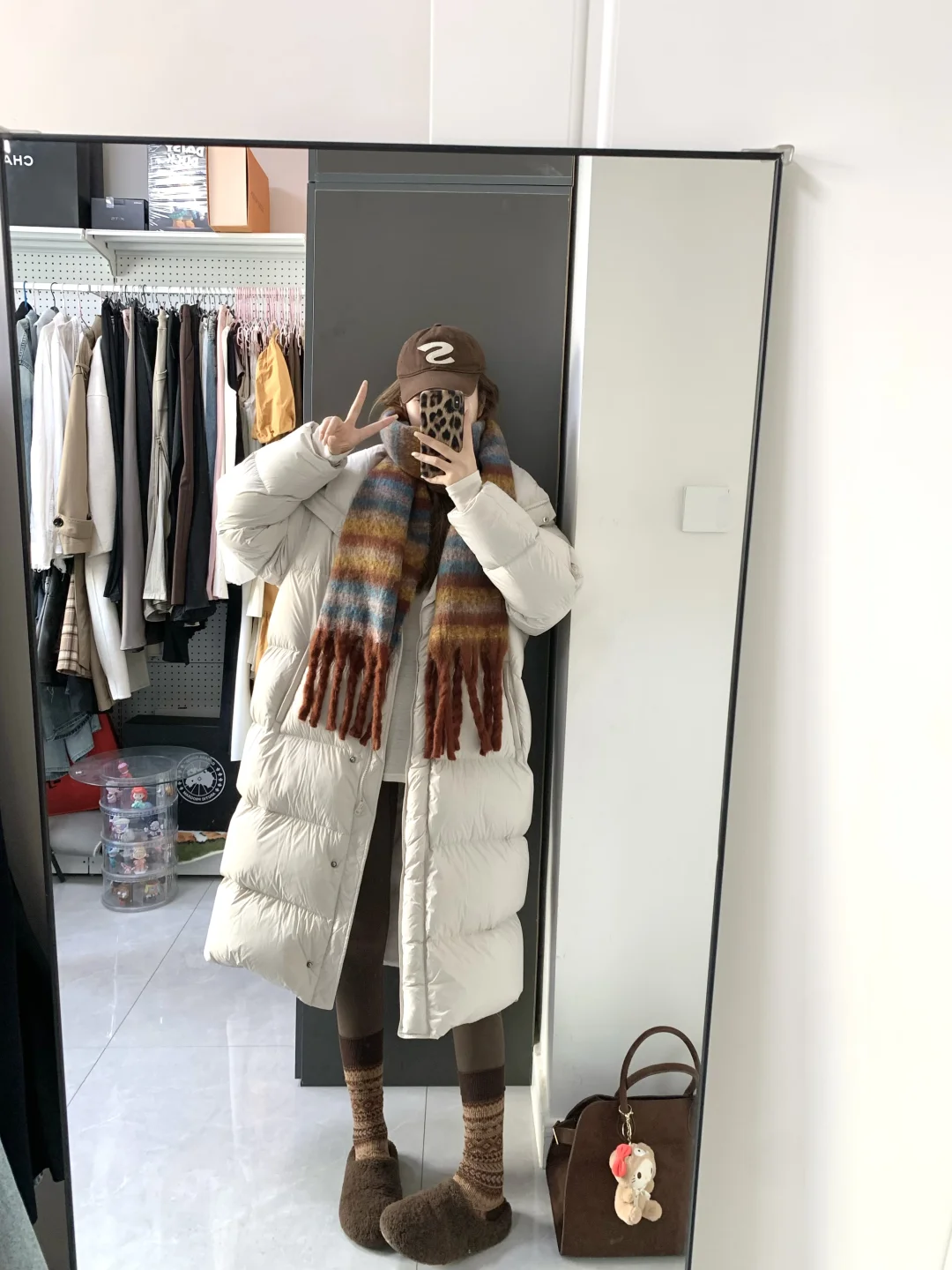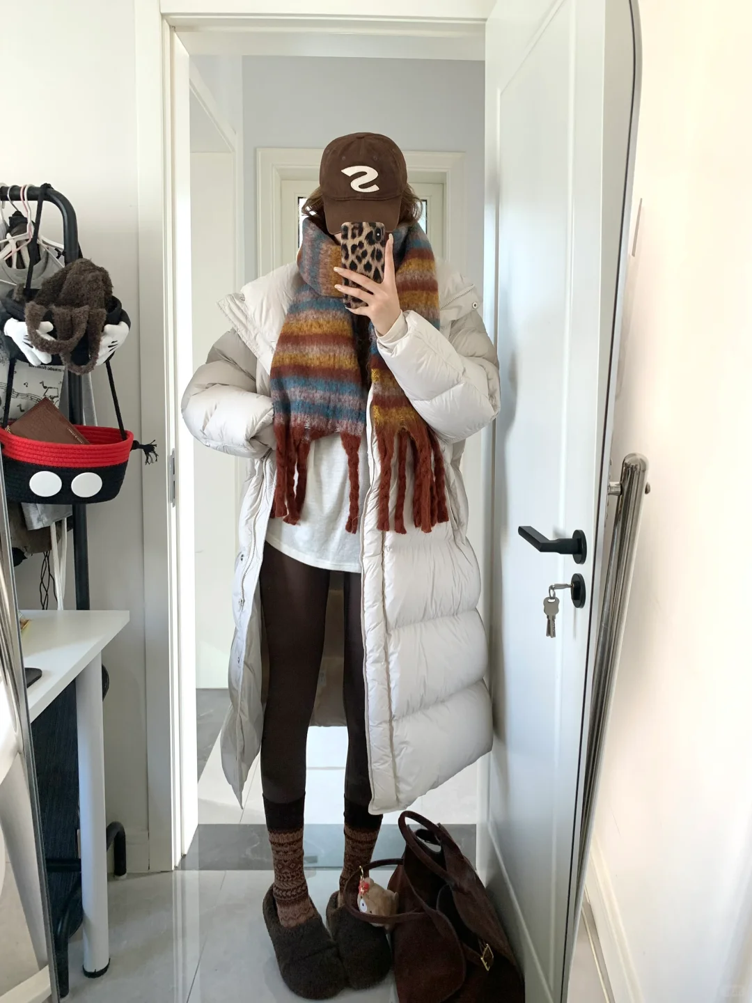 好久不见嘿嘿!白色羽绒服搭棕色瑜伽裤好韩系保暖~