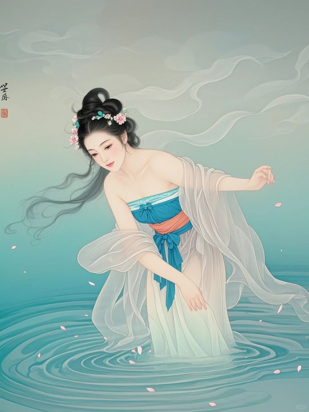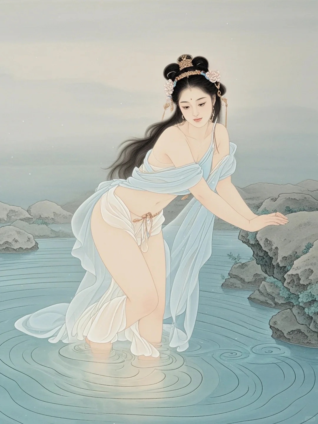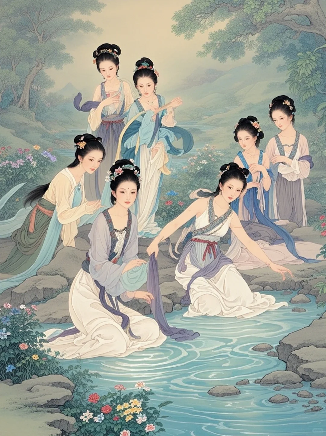 七仙女流连忘返赏春色,忙里偷闲洗凝脂
