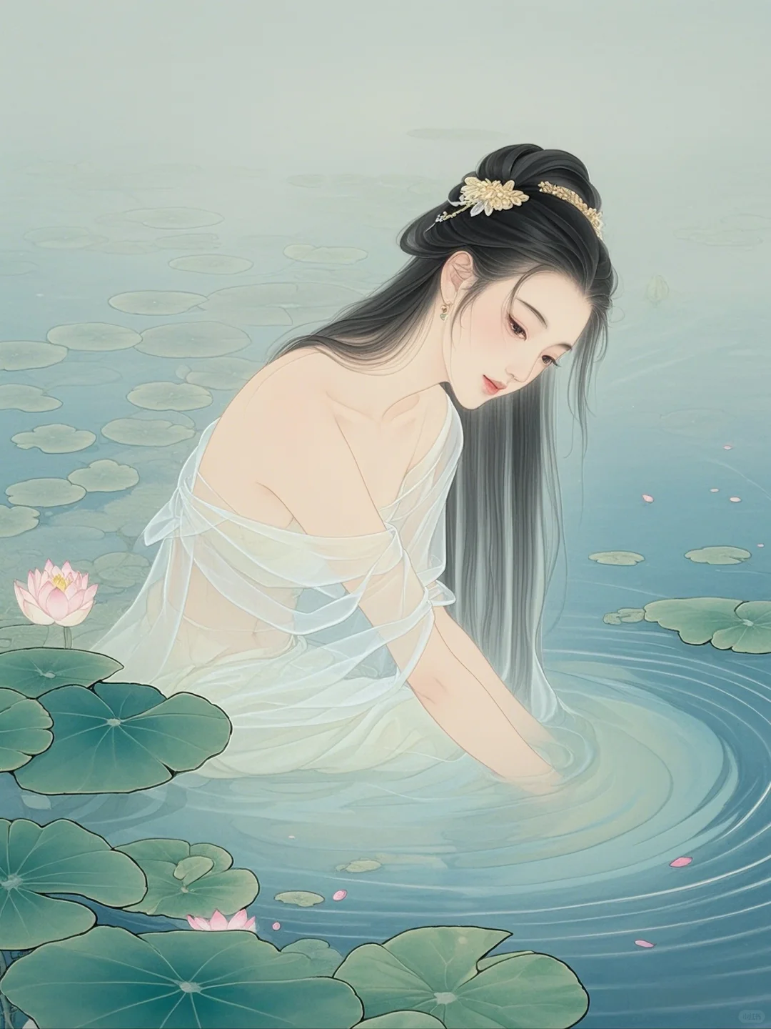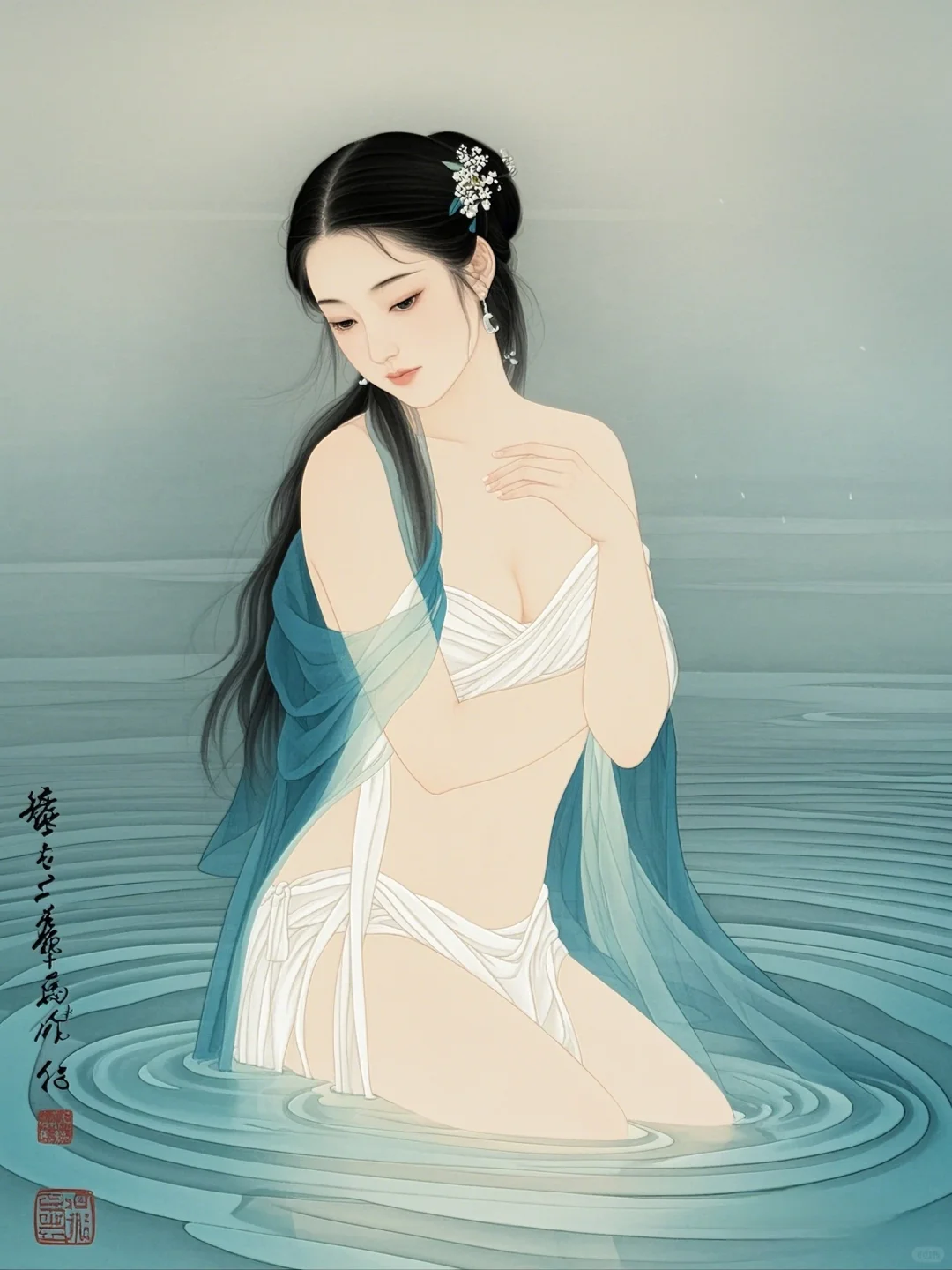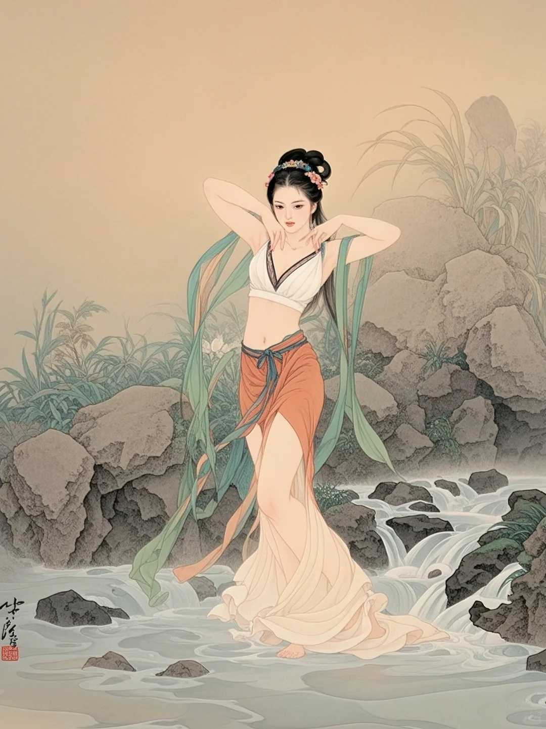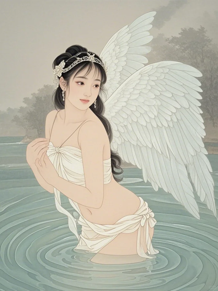 七仙女流连忘返赏春色,忙里偷闲洗凝脂