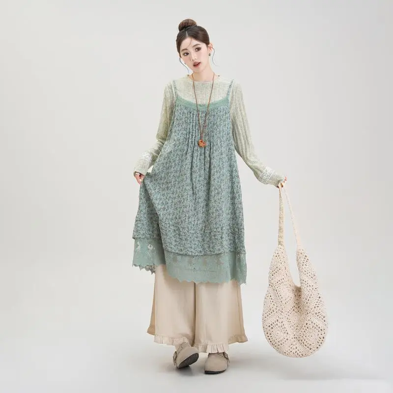 #森系套装 #早秋新款 #碎花吊带裙 #叠穿内搭 #花边阔腿裤 #甜美风 #早秋穿搭 #时尚推荐 #田园风情 #穿搭灵感