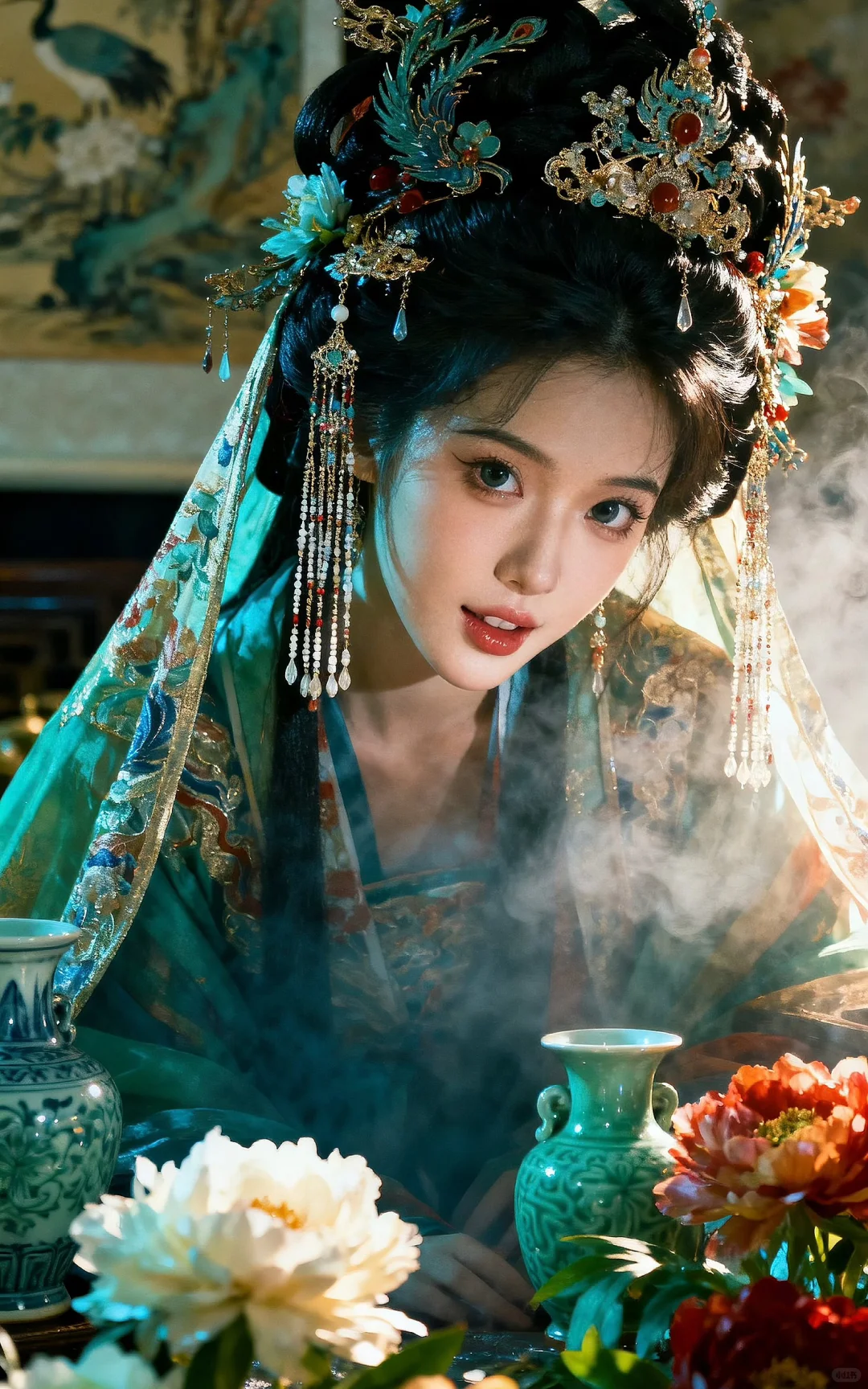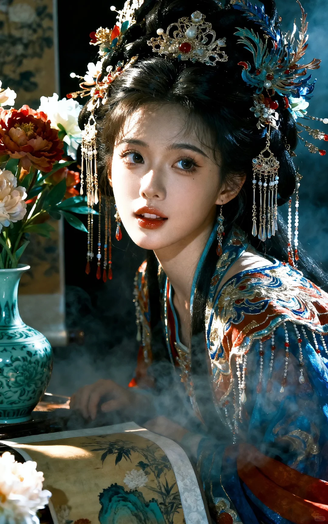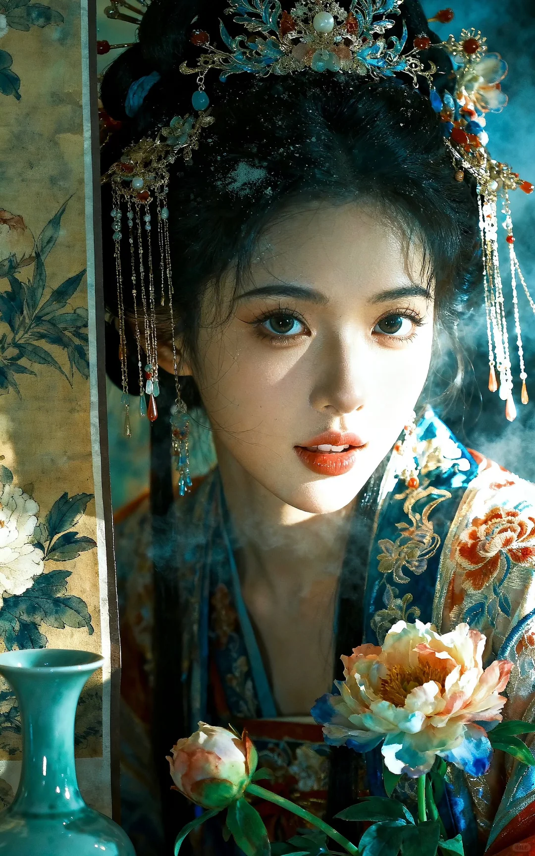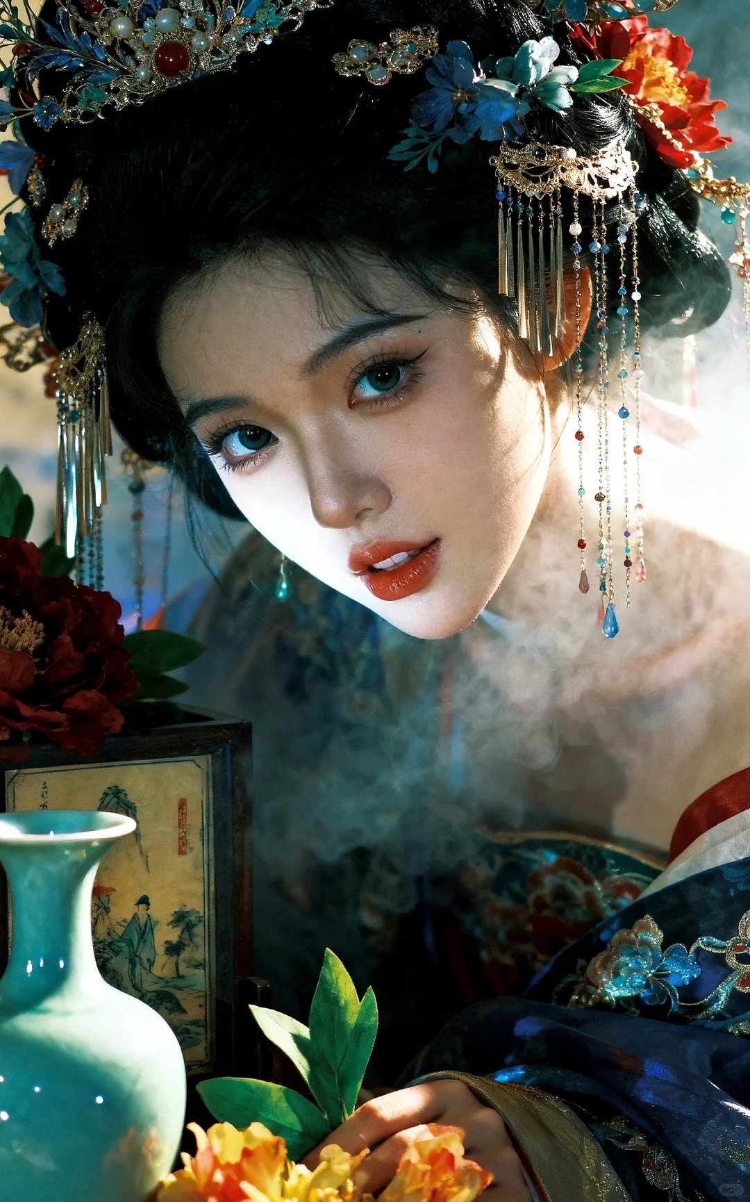 真人写真风格图片风格,色彩丰富,精致的细节。,营造出充满故事感且带着清冷大小姐氛围的画面,打造出画面的颗粒感和肌理感,展现 超古风主义美学 的高级氛围感与层次感。光感朦胧,利用晕染、叠涂、弥散渐变技法,让色彩饱满层次丰富。脸部特写,华丽繁杂精致的造型发饰,流苏,华丽的霞帔发饰,周围有古画青瓷等物,同时有极度精致繁华的花卉插入其中,是一幅极具奇幻色彩的国风画面。最具艺术感的主光源,塑造强烈的立体感、质感与戏剧性明暗对比必须优化构图。突出唯一主体,并遵循三分法、引导线或负空间等经典构图原则,创造呼吸感与叙事张力。将画面细节提升到摄影级/超写实级。极致渲染关键材质的纹理、反光与透光性。根据图像主题,生成一个和谐且富有情绪的色彩分级,营造出独特的氛围。8K分辨率,超真实,具有惊人的细节与艺术感染力,表情要丰富,尤其是眼睛与嘴巴,尽可能甜美,除非环境与造型不允许。拍照视角也可以多样化,不拘一格。