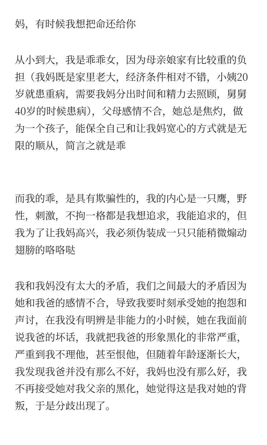 从小到大,我都在扮演乖乖女,因为母亲娘家有比较重的负担(我妈既是家里老大,经济条件相对不错,小姨20岁就患重病,需要我妈分出时间和精力去照顾,舅舅40岁的时候患病),父母感情不合,她总是焦灼,做为一个孩子,能保全自己和让我妈宽心的方式就是无限的顺从,简言之就是乖