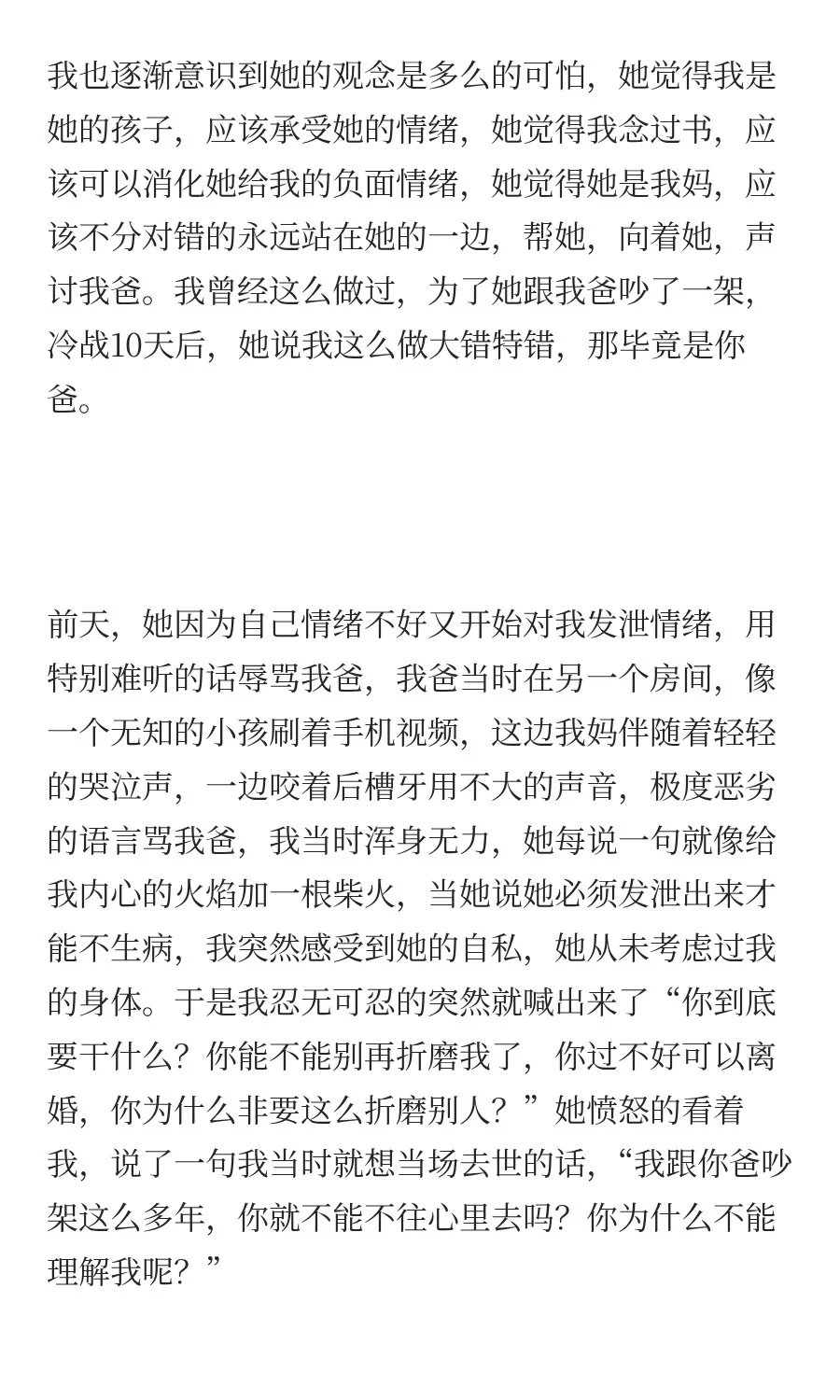 前天,在我41岁半的年纪,仍然没有摆脱她因为自己情绪不好对我的情绪发泄,用特别难听的话辱骂我爸,我爸当时在另一个房间,像一个无知的小孩刷着手机视频,这边我妈伴随着轻轻的哭泣声,一边咬着后槽牙用不大的声音,极度恶劣的语言骂我爸,我当时浑身无力,她每说一句就像给我内心的火焰加一根柴火,当她说她必须发泄出来才能不生病,我突然感受到她的自私,她从未考虑过我的身体。于是我忍无可忍的突然就喊出来了“你到底要干什么?你能不能别再折磨我了,你过不好可以离婚,你为什么非要这么折磨别人?”她愤怒的看着我,说了一句我当时就想当场去世的话,我跟你爸吵架这么多年,你就不能不往心里去吗?你为什么不能理解我呢?