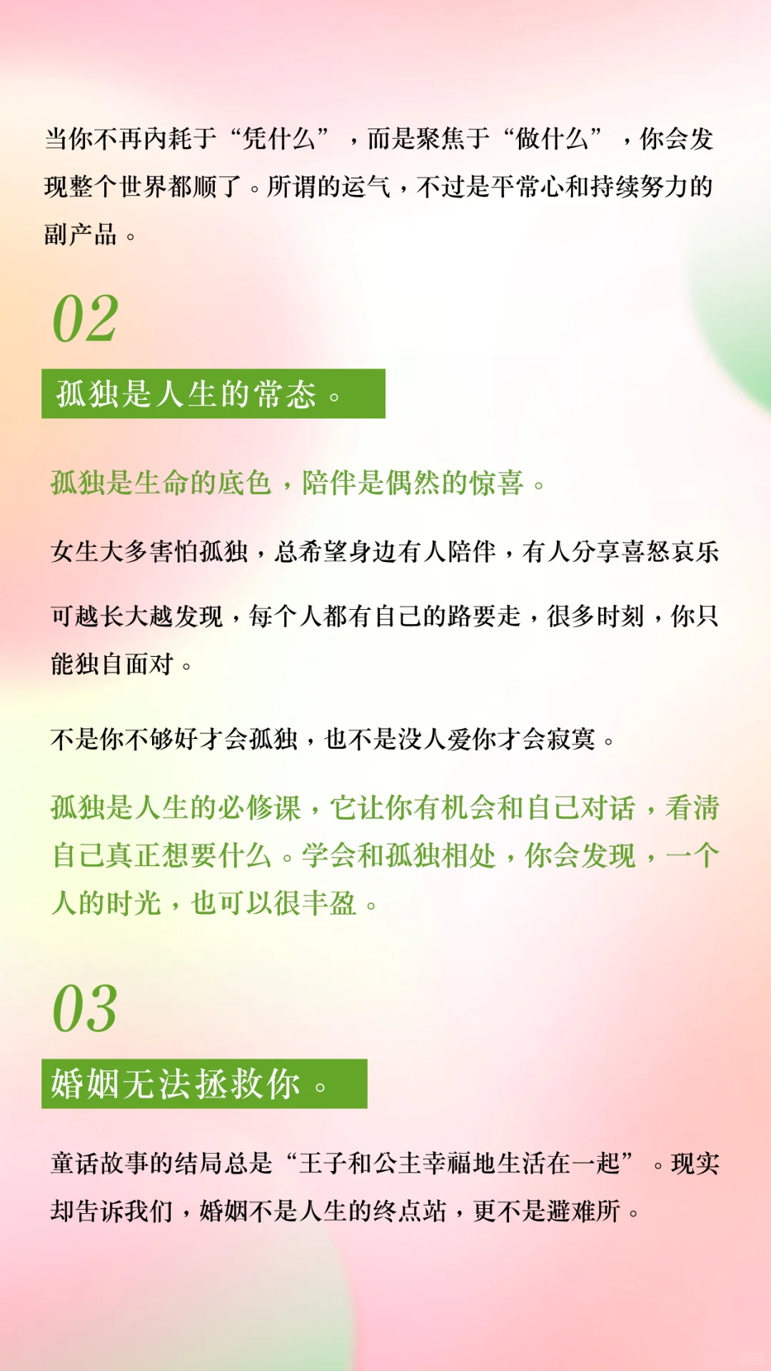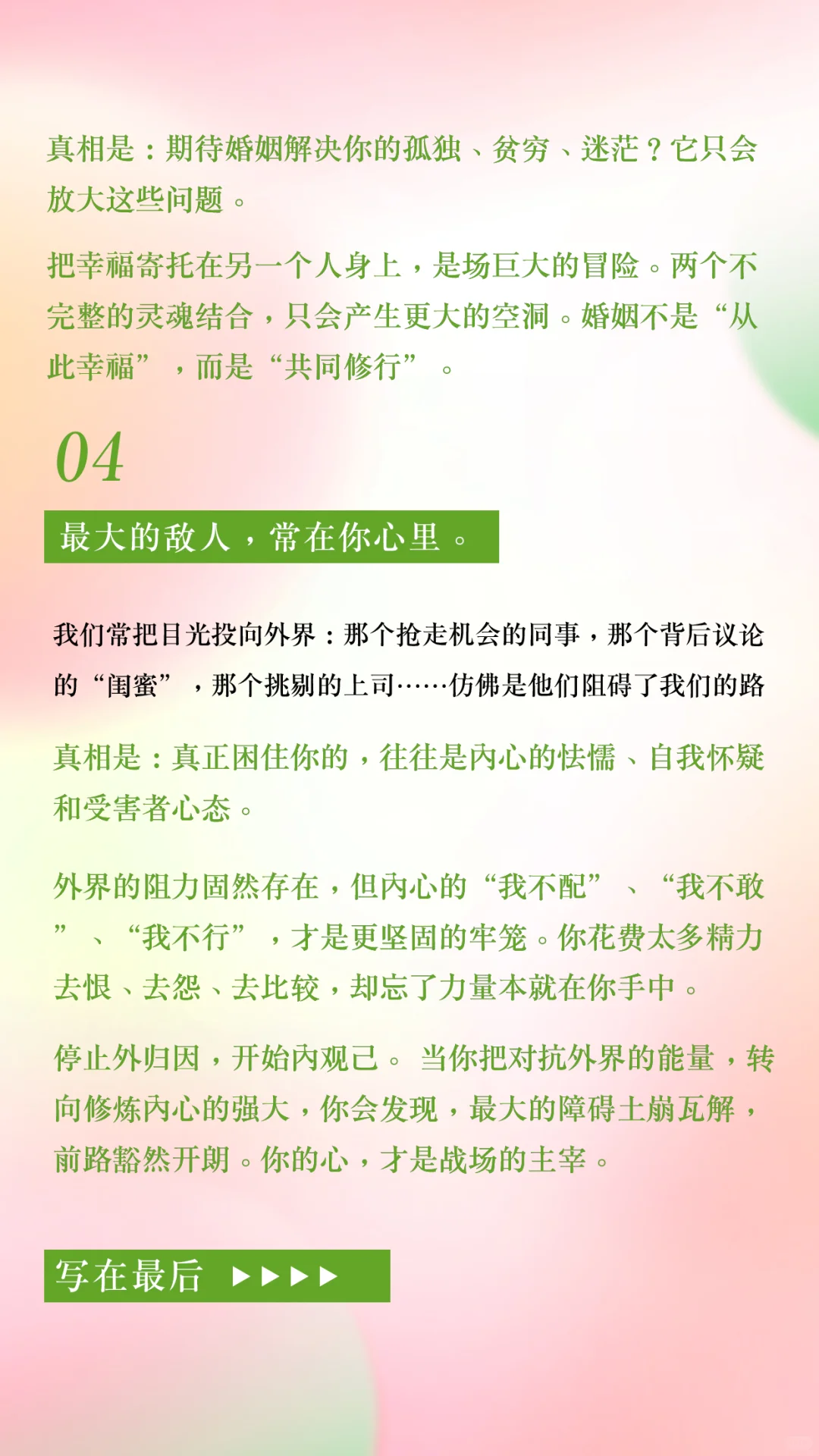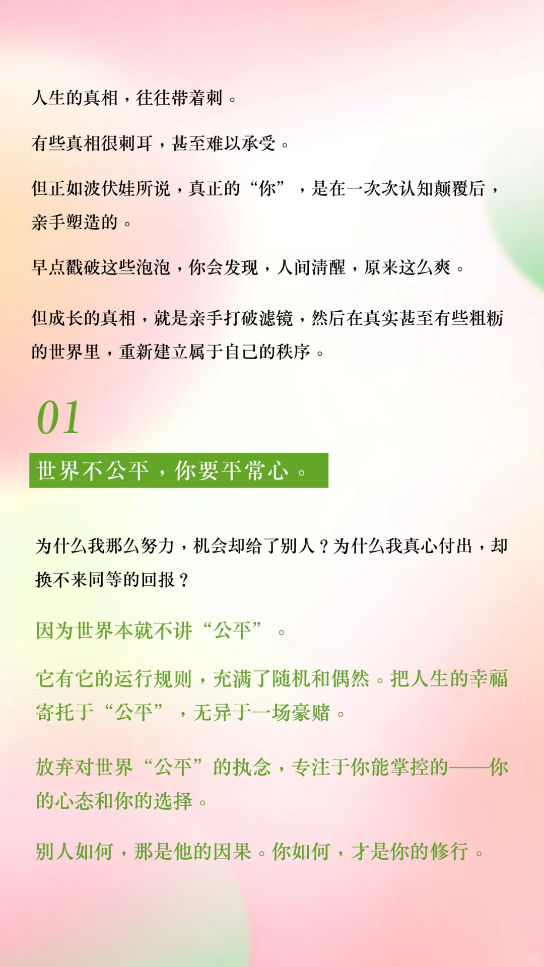 成长就是一个不断剥离幻想、接纳现实的过程,在认清生活的真相后,依然有热爱生活的勇气。最好的活法,不是照着地图走,而是心里有方向,脚下有力量。