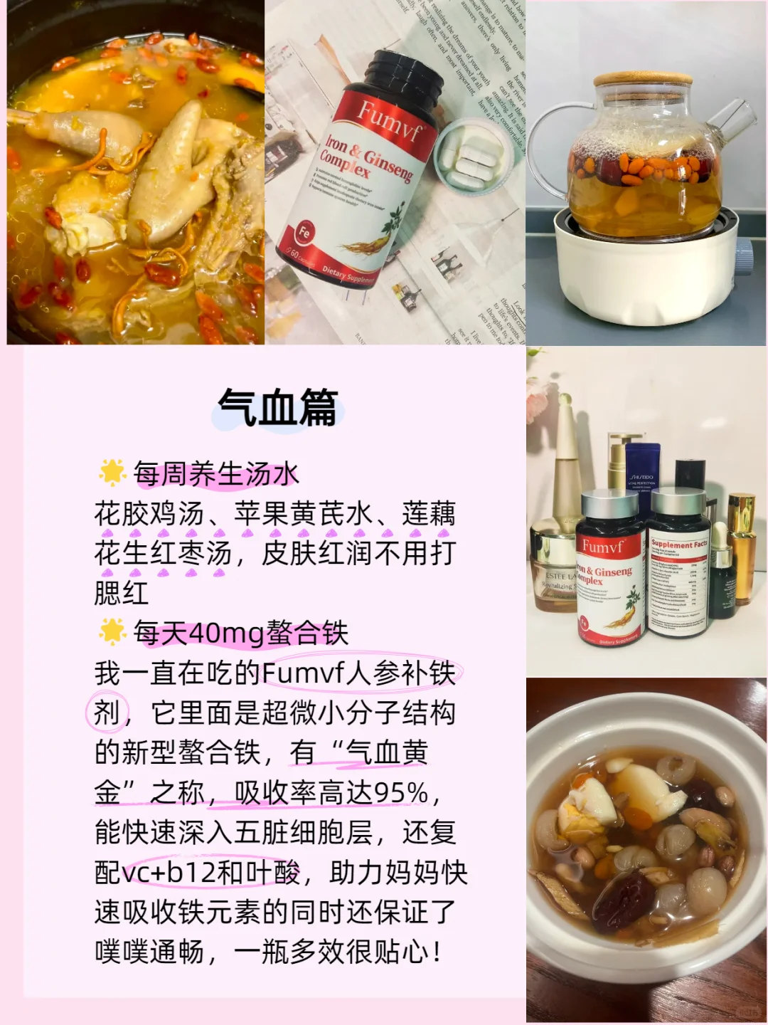 我一直在吃的Fumvf人参补铁剂,它里面是超微小分子结构的新型螯合铁,有“气血黄金”之称,吸收率高达95%,能快速深入五脏细胞层,还复配vc+b12和叶酸,助力妈妈快速吸收铁元素的同时还保证了噗噗通畅,一瓶多效很贴心!