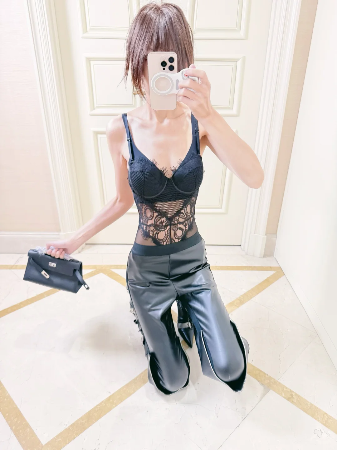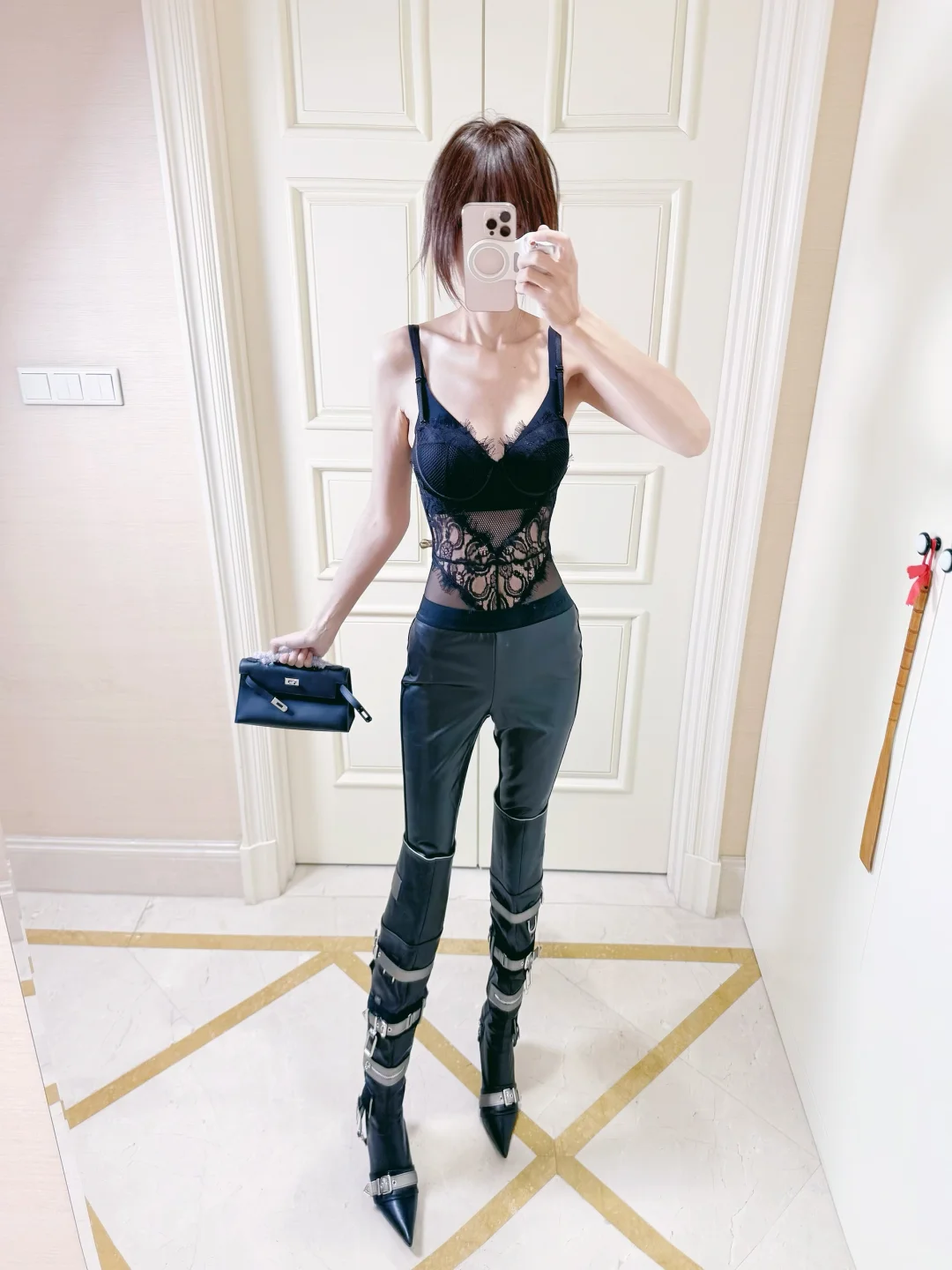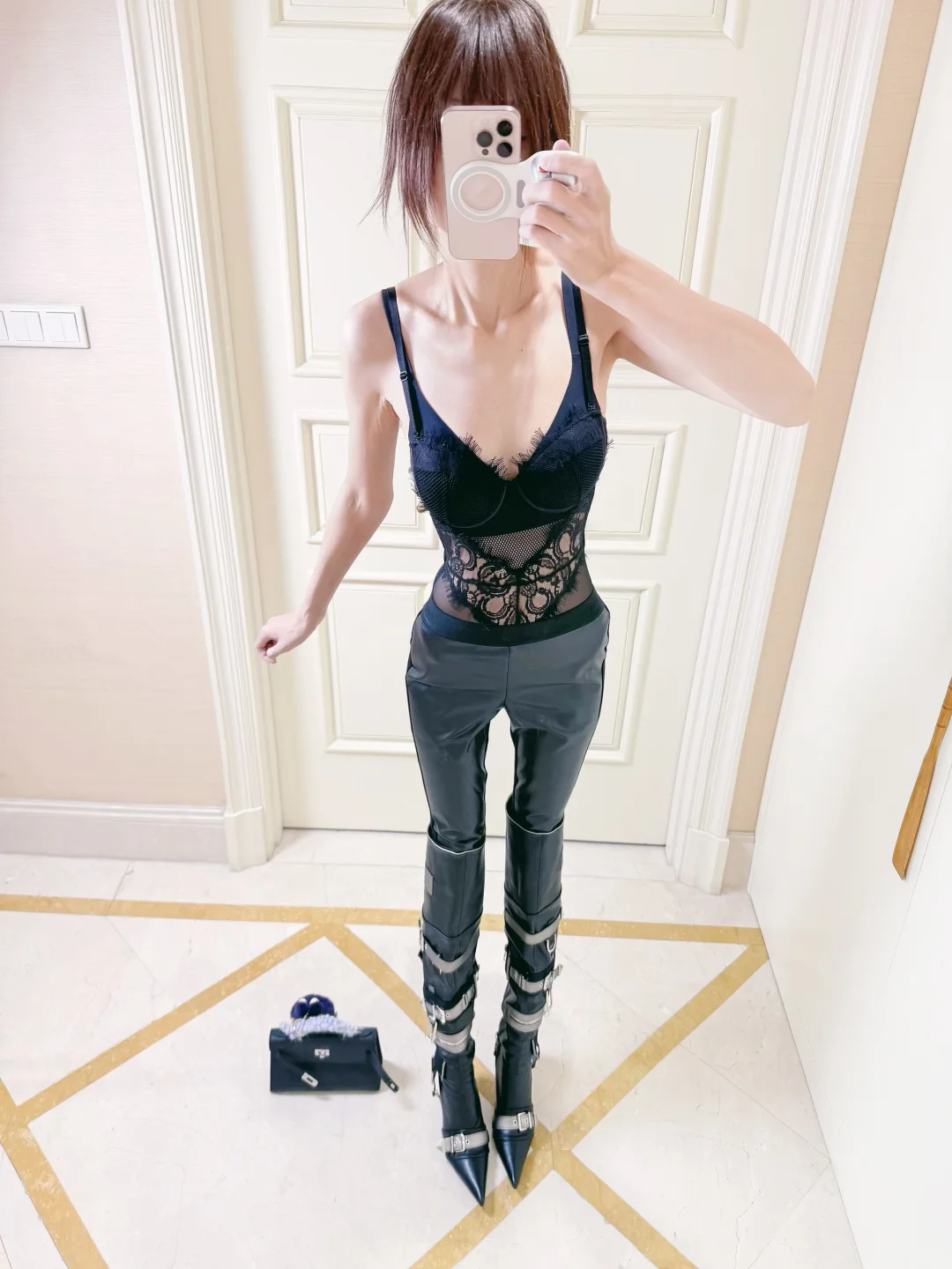包臀皮裤➕鱼骨胸衣🤳🦋🖤all black