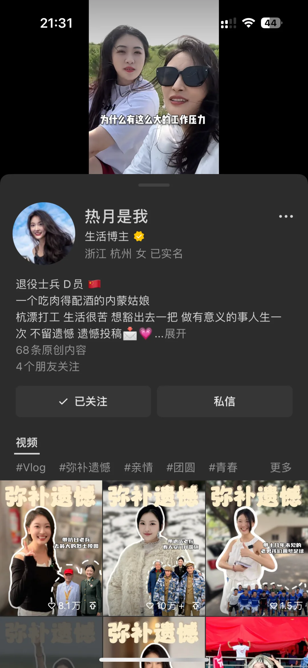 我想给大家分享的一个博主,叫热月是我!我平常都是在微信的视频号里看的,她是一名退伍女兵,看她的视频我每一次感动的都会哭,然后就是超级喜欢她,她的每一个视频我都会看,非常的有正能量特别的积极,那句视频开头“点多少转多少还是弥补一个遗憾”,我都记得很清楚哈哈,刚开始觉得点多少转多少挺有意思的,但是我发现每一期视频都有遗憾,博主会用自己的人脉背景,然后帮他们去弥补曾经的遗憾,然后就感觉特别的新鲜,我就感觉特别的真实,网上很少有这种真实又感人,特别正能量的视频,然后我记得有退伍老兵看升旗,然后还有残疾人去看演唱会,帮助瓜农卖瓜等等我都有深深的感悟,让我印象最深刻的是热月帮助瓜农去卖瓜这个视频,因为我本身就是河南的,然后热月这期视频也来到了河南,然后因为夏季吗,许多瓜农的西瓜很难卖出去,但是他没有直接买下西瓜,而是去帮助瓜农爷爷一颗一颗的卖出去,让我真的就是特别的感动,能够去靠自己劳动去帮助别人,而且他也是一个大网红,他没有像很多网红一样去直接买下一车的西瓜,我真的是对他感到非常的佩服,这种视频其实是少见的,我并没有在网上看到过有这种类型的视频,而热月拍的这类视频,他不仅能让我看到社会不同人士内心深处的遗憾,还有他们曾经的经历,以及还让我从中感悟到了许多人生感悟,人生经历等等,反观网络上许多没有营养的段子以及匪夷所思,让人难以理解的视频来说热月拍的这种视频更能让我们在这个虚假的网络中感受到真实的新鲜的社会现实,而网络上更需要的是像热月这类视频博主能够带给大家正能量还有积极的生活态度,这就是我给大家推荐的一位博主——热月是我!我也希望网络上能有越来越多的博主能向热月一样,向网民们传达积极的生活态度!#我最喜欢的博主#我想推荐#种草#网络 #热月是我