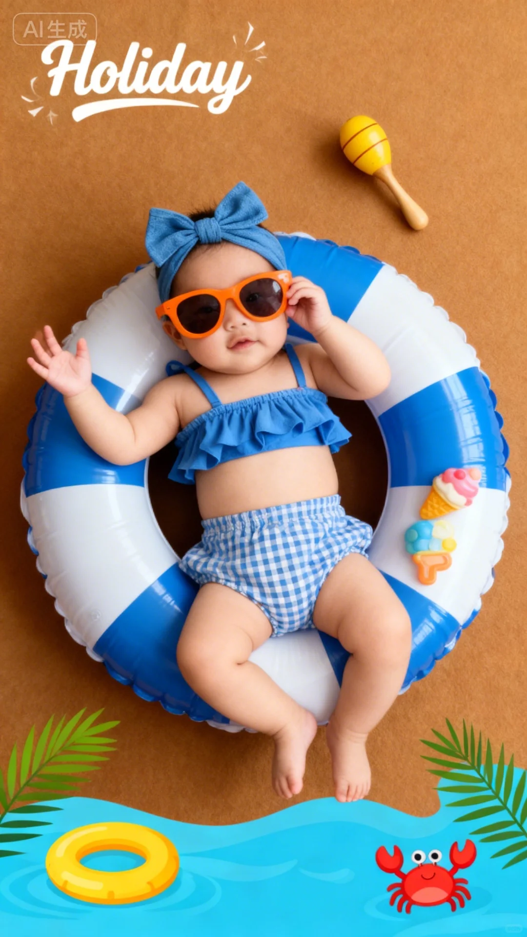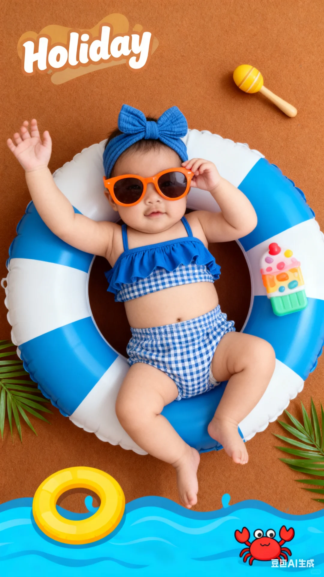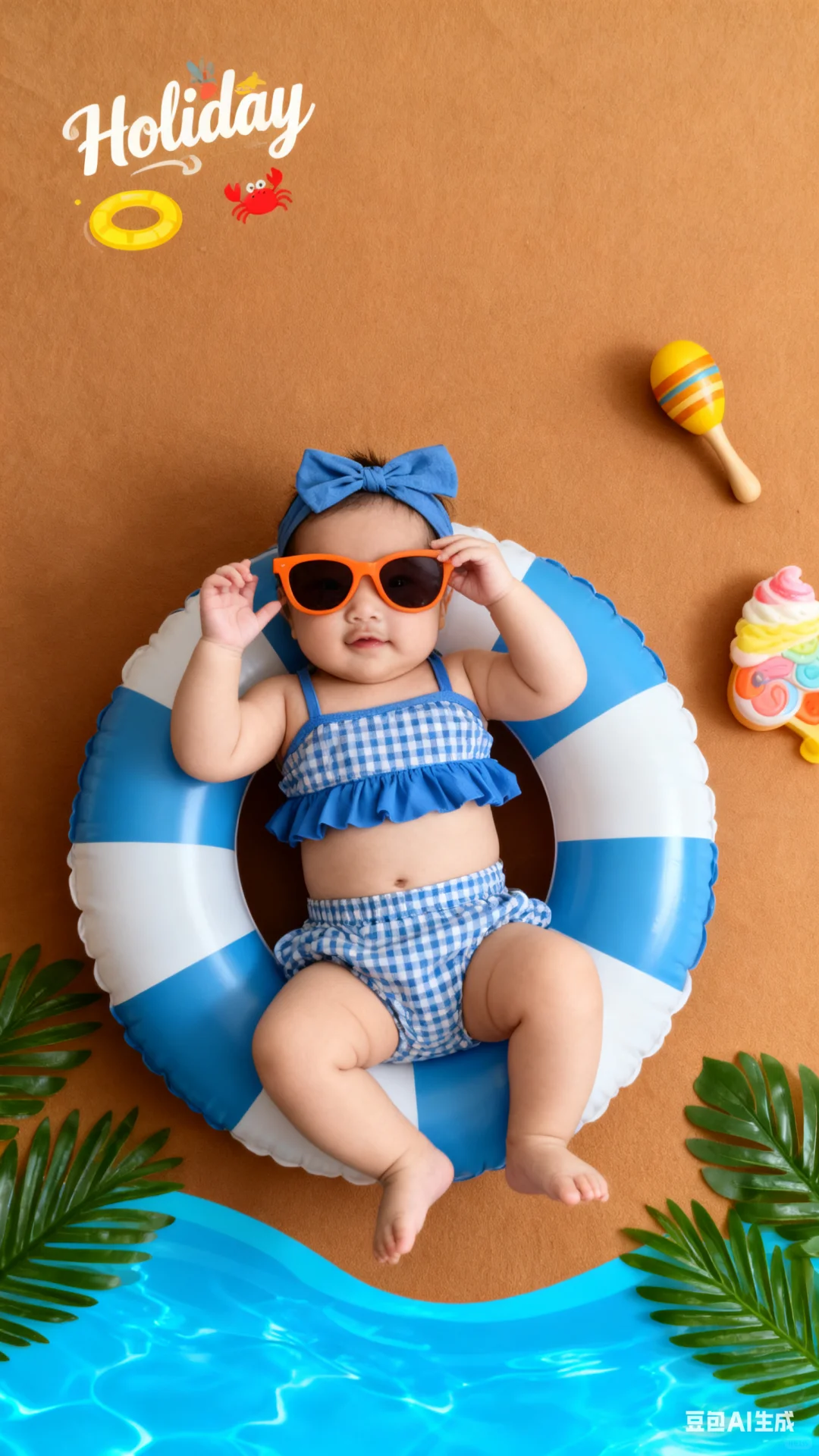 只保留婴儿,保持婴儿面部不变,删除背景。环境整体为夏日度假主题的室内布景,背景是棕色纯色平面,下方有蓝色水波图案装饰,搭配绿色棕榈叶元素,采用俯拍全景,完整呈现婴儿与周围道具的组合。主体是一位婴儿,姿态放松地处于画面中心。婴儿躺在游泳圈上,一只手自然抬起,另一只手轻扶墨镜,神态惬意,仿佛在享受夏日时光。服装:身着蓝白格纹的分体式泳装,上衣是带荷叶边的蓝色吊带设计,下装为格纹短裤,风格清新可爱。材质推测为棉质,柔软亲肤,适合婴儿穿着。头戴蓝色布艺发带,带有蝴蝶结造型;佩戴橙色大框墨镜,增添时尚感与童趣感。发带材质为棉质,柔软且有一定造型度;墨镜为塑料材质,轻便且色彩鲜艳。游泳圈:蓝白相间的充气游泳圈,材质为PVC,具有良好的充气性和安全性。右侧有彩色的仿真甜品玩具(如冰淇淋、蛋糕),材质为塑料,色彩鲜艳且造型卡通;上方有黄色木质沙锤,材质为木材,质地光滑。装饰元素:左上角有“Holiday”主题文字装饰,下方有黄色游泳圈、红色小螃蟹等卡通图案,均为平面设计元素,材质为数码印刷。采用室内柔光灯布光,光线均匀柔和,无明显阴影,细腻地呈现出婴儿肌肤、服饰纹理和道具细节,整体氛围明亮温馨。偏向清新夏日风滤镜,色调明亮且饱和度适中,突出蓝色、橙色等色彩的鲜活感,同时带有轻微的童趣颗粒感,契合夏日度假主题的活泼、童真视觉效果。