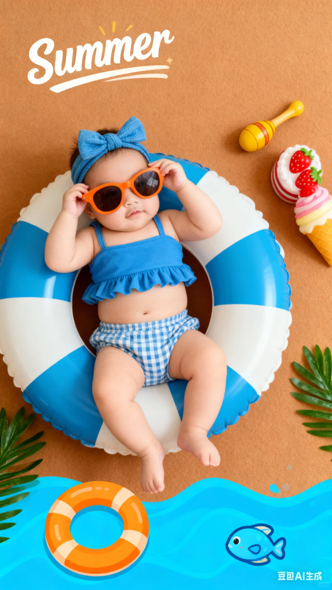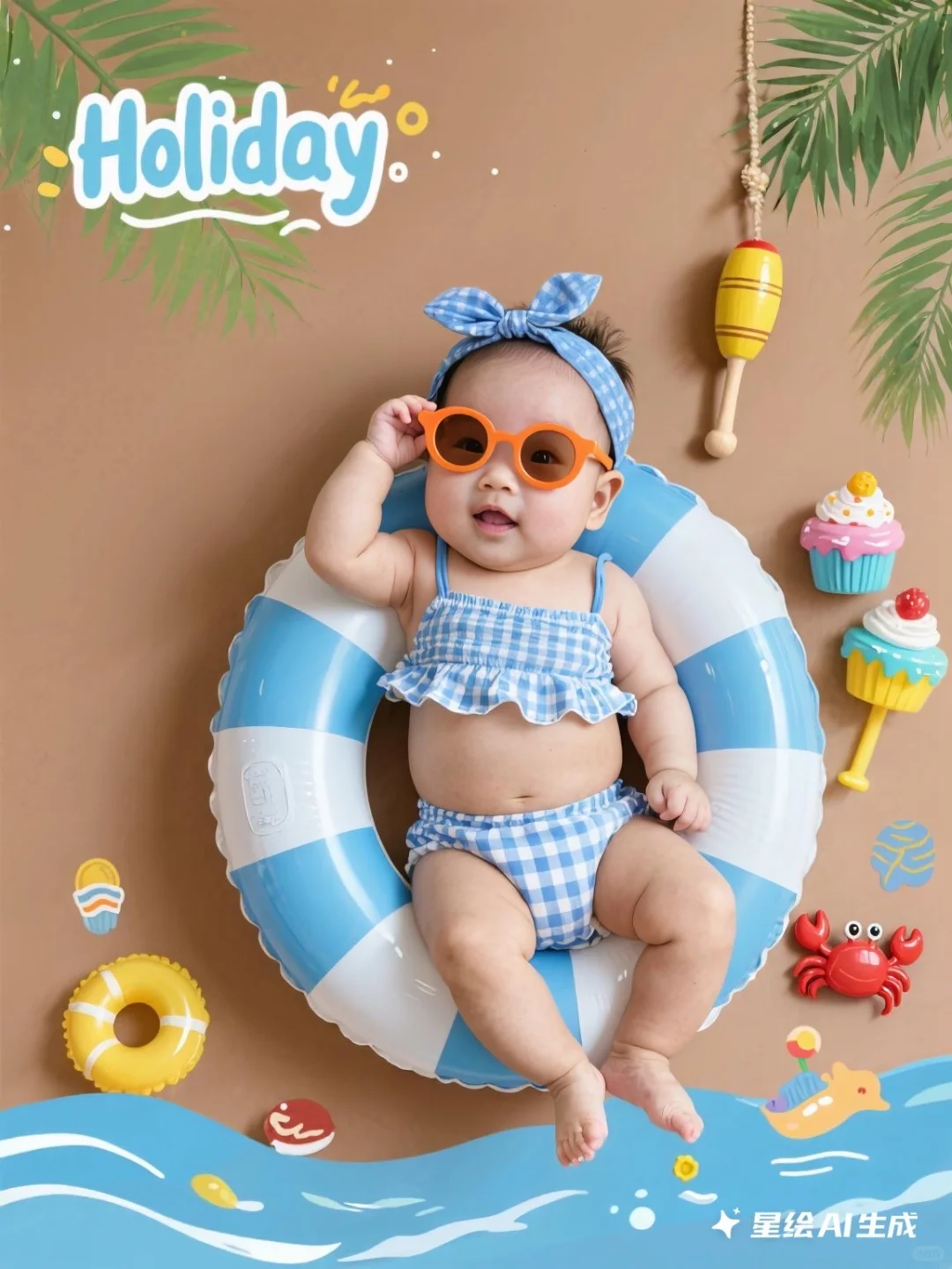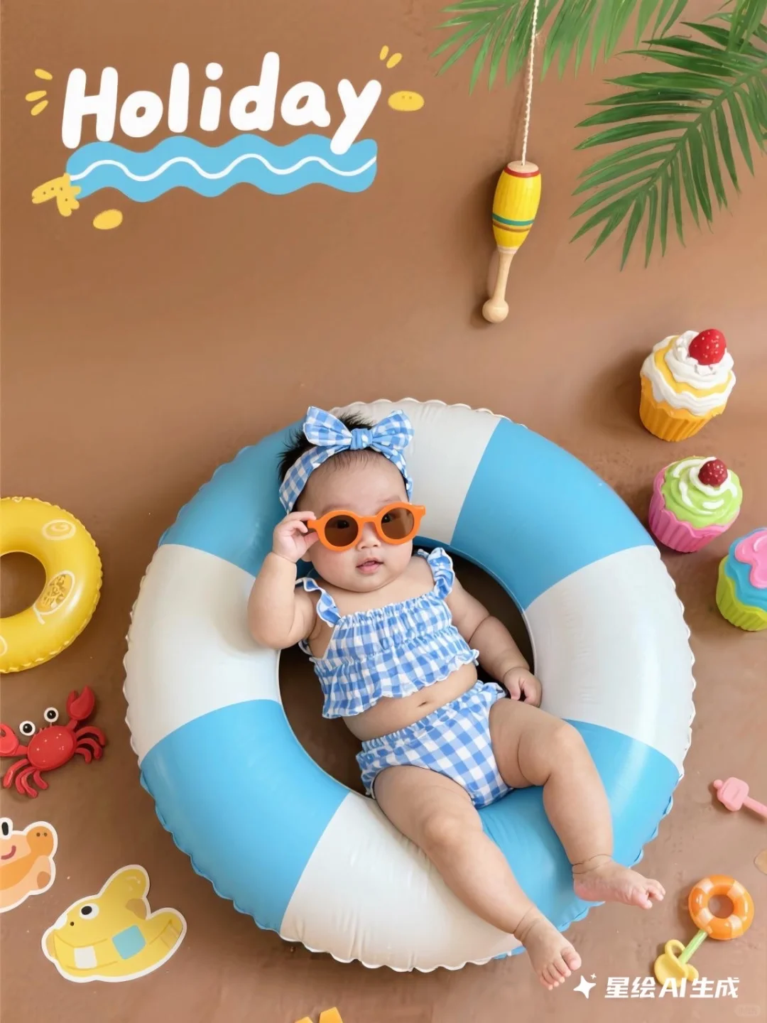 只保留婴儿,保持婴儿面部不变,删除背景。环境整体为夏日度假主题的室内布景,背景是棕色纯色平面,下方有蓝色水波图案装饰,搭配绿色棕榈叶元素,采用俯拍全景,完整呈现婴儿与周围道具的组合。主体是一位婴儿,姿态放松地处于画面中心。婴儿躺在游泳圈上,一只手自然抬起,另一只手轻扶墨镜,神态惬意,仿佛在享受夏日时光。服装:身着蓝白格纹的分体式泳装,上衣是带荷叶边的蓝色吊带设计,下装为格纹短裤,风格清新可爱。材质推测为棉质,柔软亲肤,适合婴儿穿着。头戴蓝色布艺发带,带有蝴蝶结造型;佩戴橙色大框墨镜,增添时尚感与童趣感。发带材质为棉质,柔软且有一定造型度;墨镜为塑料材质,轻便且色彩鲜艳。游泳圈:蓝白相间的充气游泳圈,材质为PVC,具有良好的充气性和安全性。右侧有彩色的仿真甜品玩具(如冰淇淋、蛋糕),材质为塑料,色彩鲜艳且造型卡通;上方有黄色木质沙锤,材质为木材,质地光滑。装饰元素:左上角有“Holiday”主题文字装饰,下方有黄色游泳圈、红色小螃蟹等卡通图案,均为平面设计元素,材质为数码印刷。采用室内柔光灯布光,光线均匀柔和,无明显阴影,细腻地呈现出婴儿肌肤、服饰纹理和道具细节,整体氛围明亮温馨。偏向清新夏日风滤镜,色调明亮且饱和度适中,突出蓝色、橙色等色彩的鲜活感,同时带有轻微的童趣颗粒感,契合夏日度假主题的活泼、童真视觉效果。