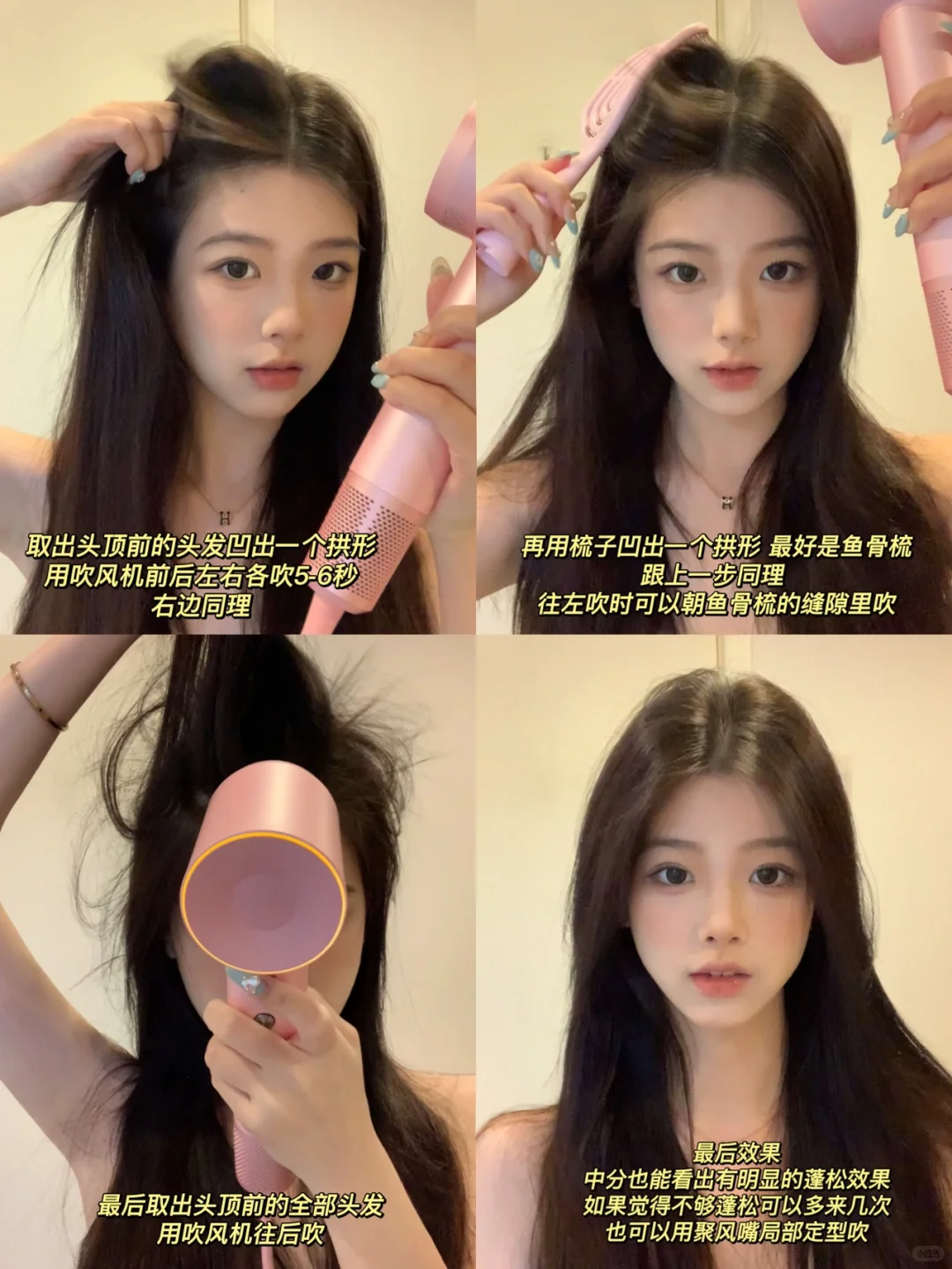 首先取出头顶前的头发凹出一个拱形,用热风前后左右各各吹5-6秒,然后换至冷风定型,右边也是同理。接下来我们用一把鱼骨梳,再重复上一遍的动作,需要注意的是从左至右时可以往鱼骨梳的缝隙里吹,这样更好把发根吹起,型成一个拱形。最后便是取出头顶的全部头发,用吹风机往后吹就大功告成啦!如果觉得还不够蓬松的可以多来几遍,最后用定型喷雾定型即可😋