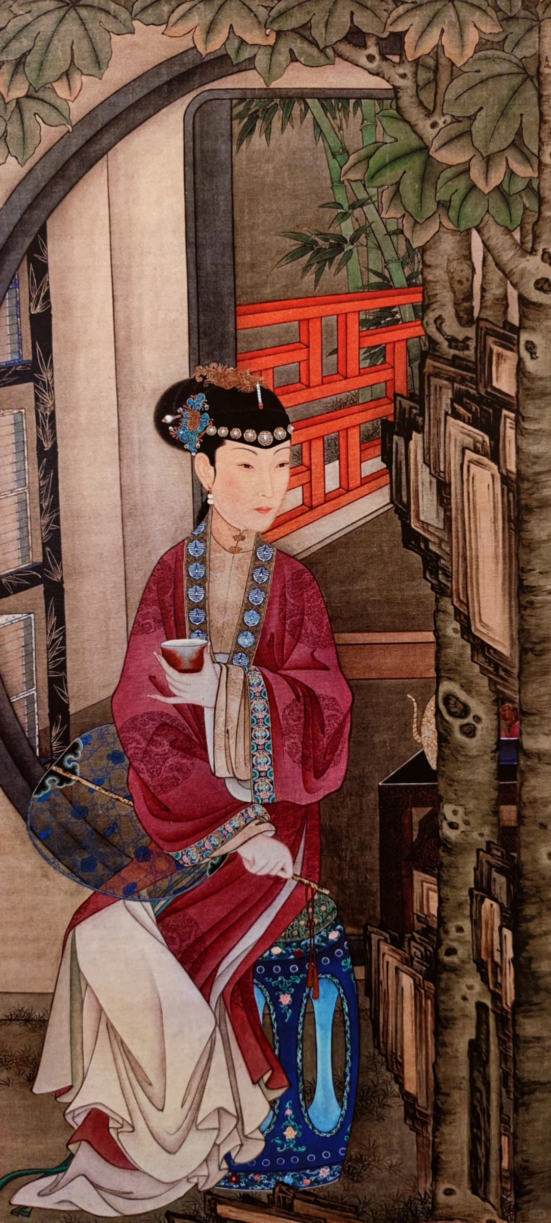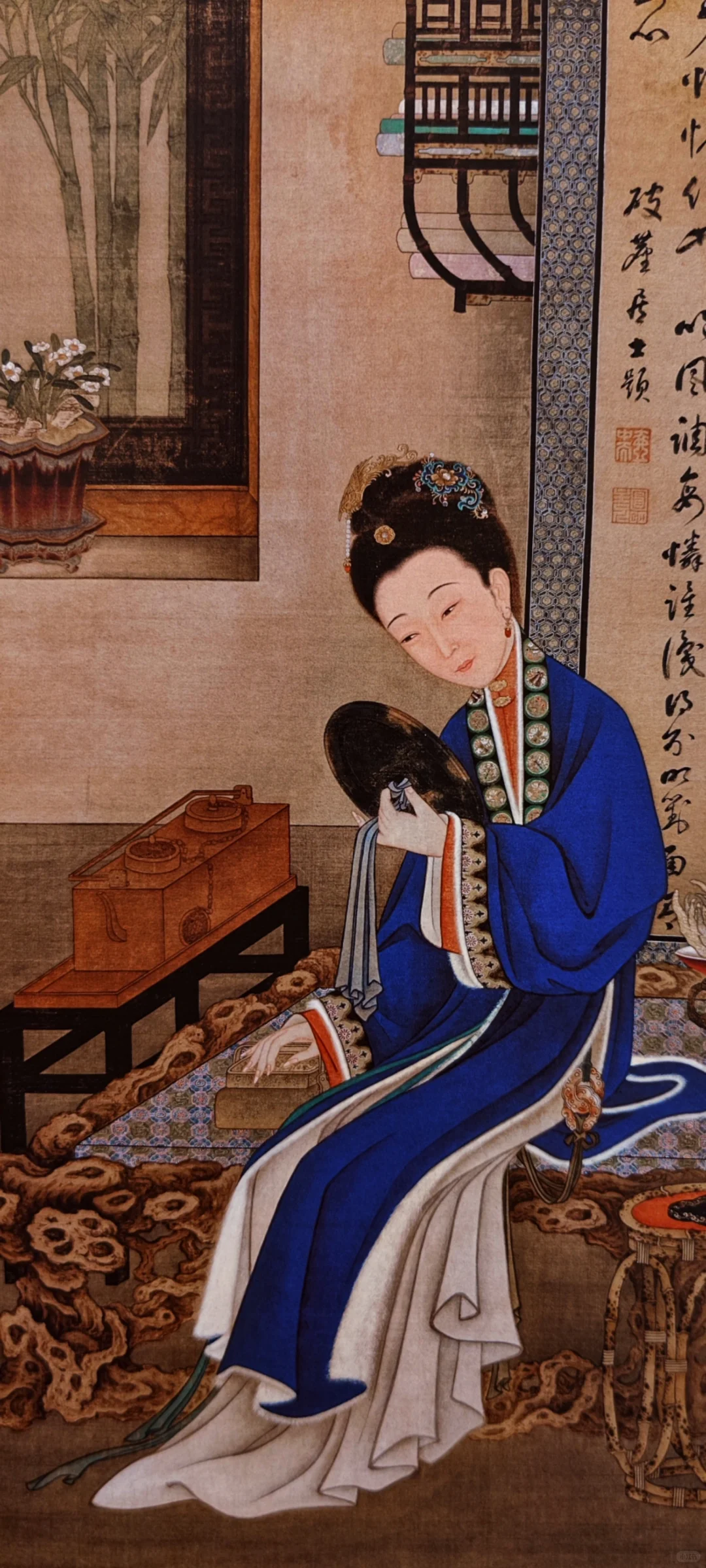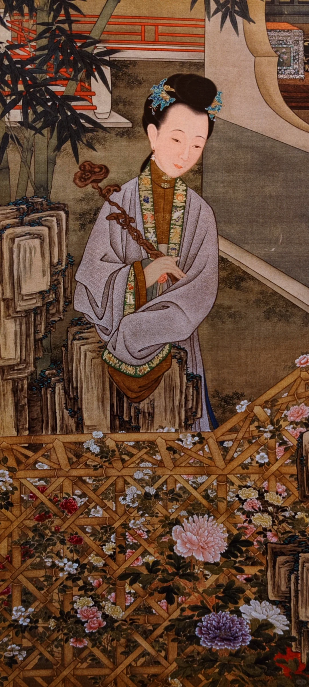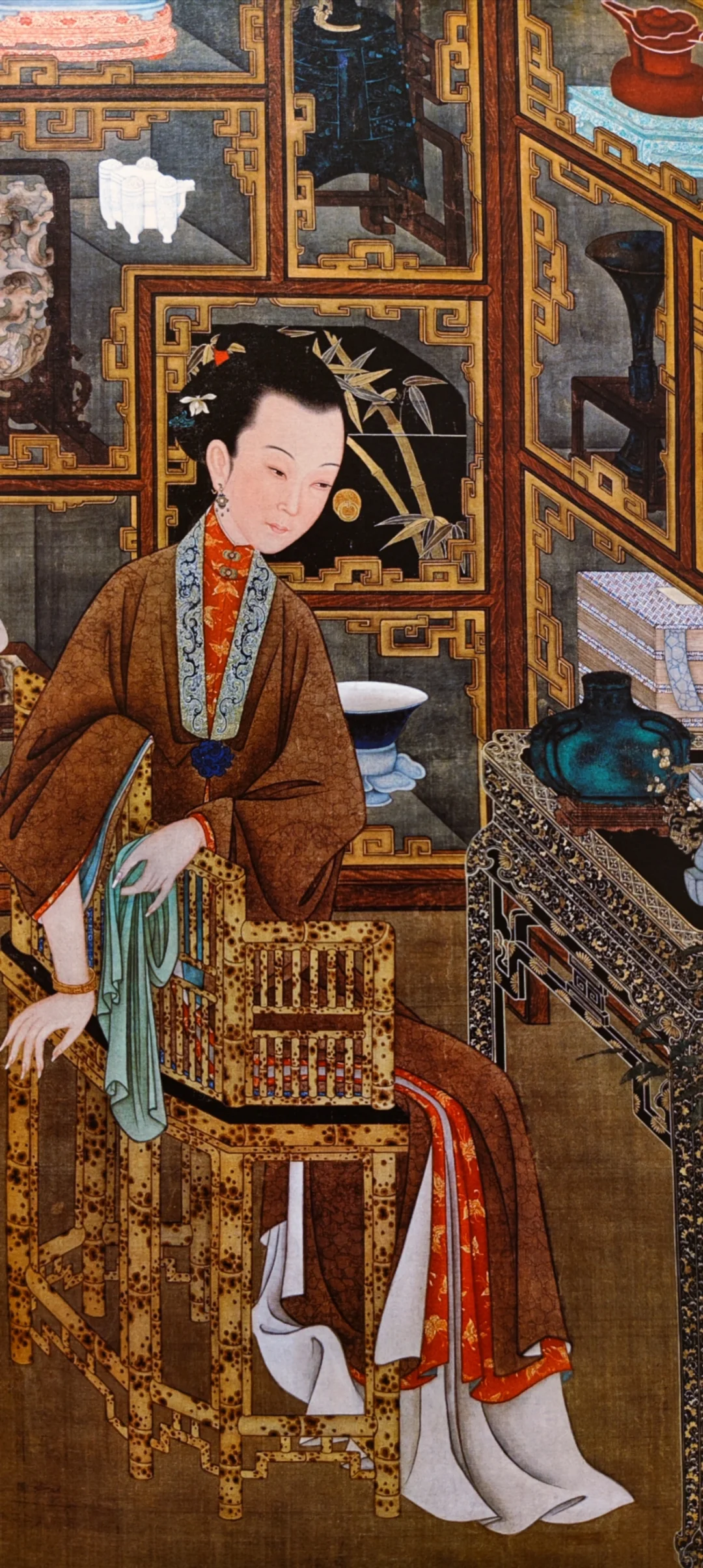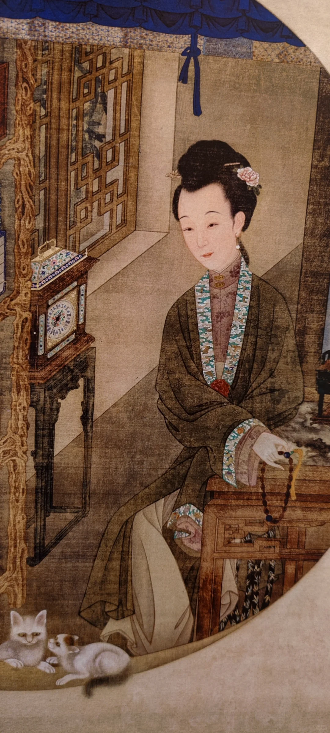 《胤禛妃行乐图》共十二幅,以工笔重彩之法,细腻勾勒了多样的仕女生活场景,涵盖了四时节气:春日“倚门观竹”“立持如意”“观书沉吟”,夏日“捻珠观猫”“消夏赏蝶”“烛下缝衣”,秋日“桐荫品茶”“持表对菊”“倚榻观鹊”,冬日“烘炉观雪”“博古幽思”“裘装对镜”。关于画中仕女的身份,学界虽尚无定论,但这套画作对于研究清代的宫廷审美趣味与工艺水平,以及宫廷日常生活仍具有较高的价值。