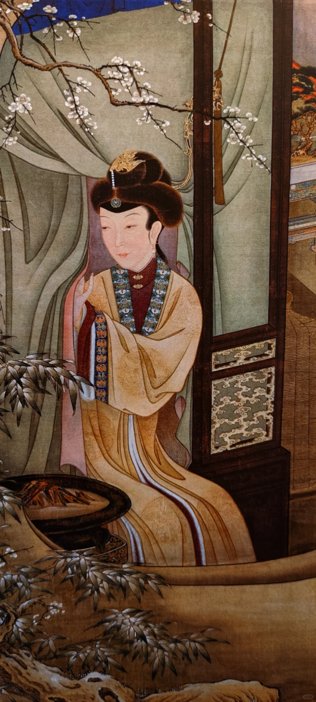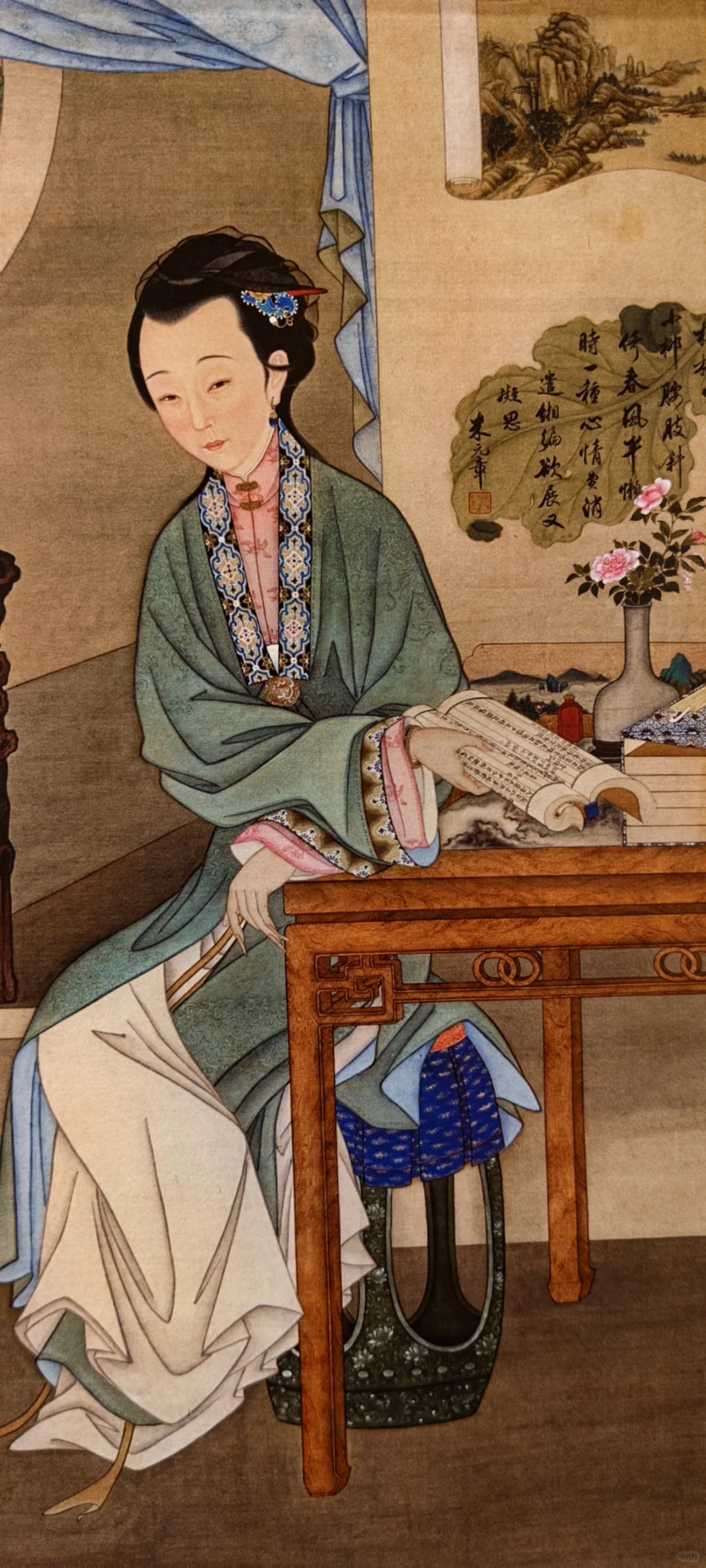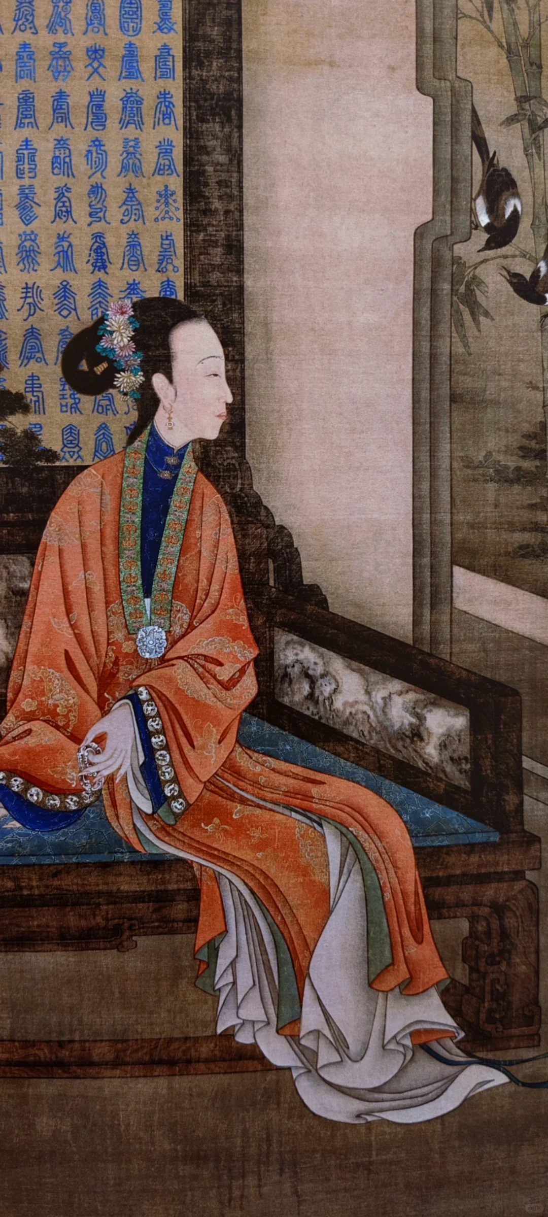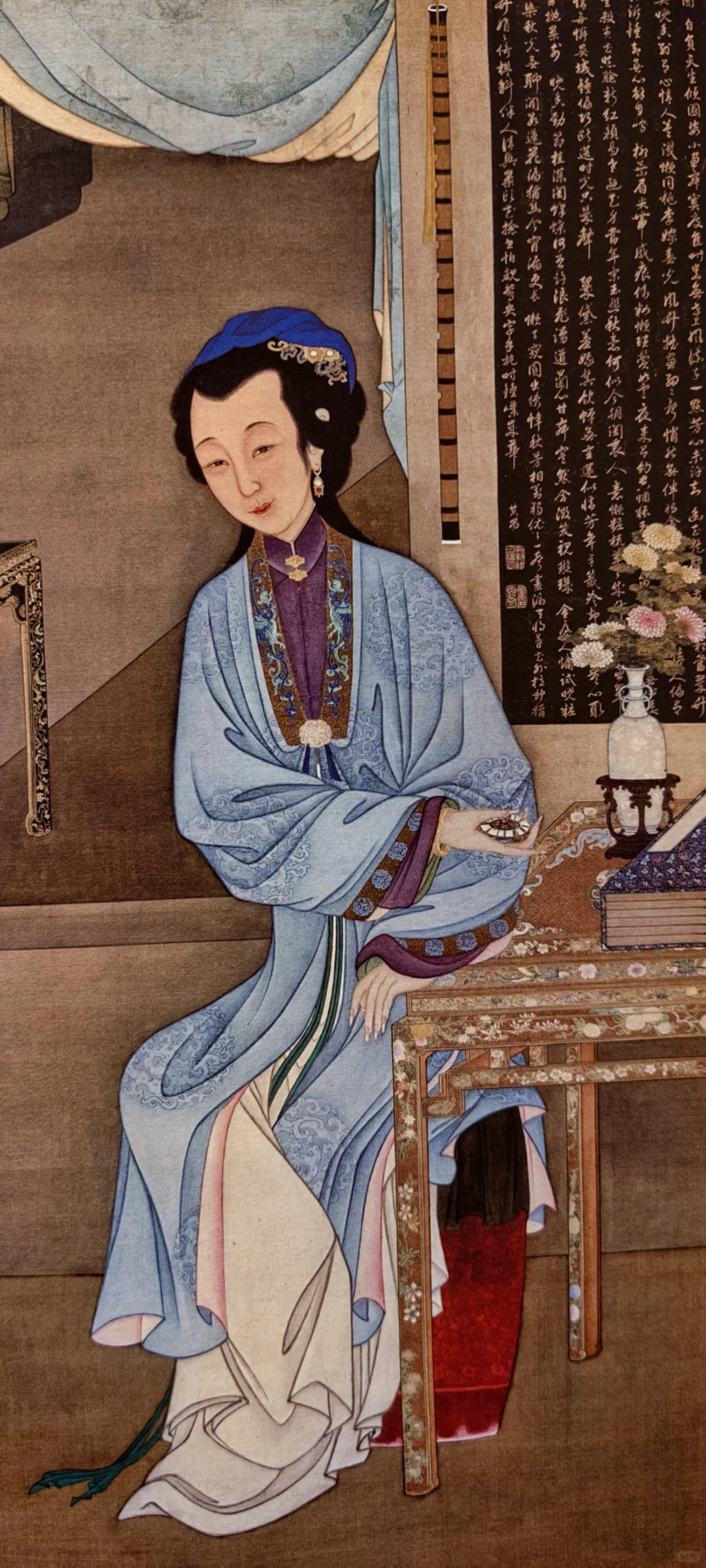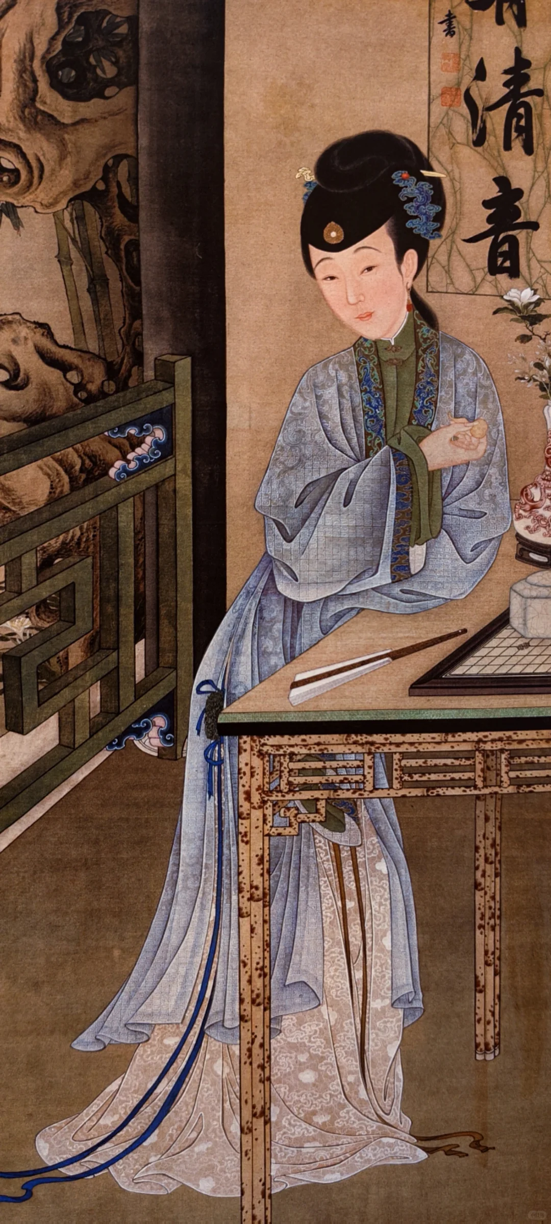 《胤禛妃行乐图》共十二幅,以工笔重彩之法,细腻勾勒了多样的仕女生活场景,涵盖了四时节气:春日“倚门观竹”“立持如意”“观书沉吟”,夏日“捻珠观猫”“消夏赏蝶”“烛下缝衣”,秋日“桐荫品茶”“持表对菊”“倚榻观鹊”,冬日“烘炉观雪”“博古幽思”“裘装对镜”。关于画中仕女的身份,学界虽尚无定论,但这套画作对于研究清代的宫廷审美趣味与工艺水平,以及宫廷日常生活仍具有较高的价值。