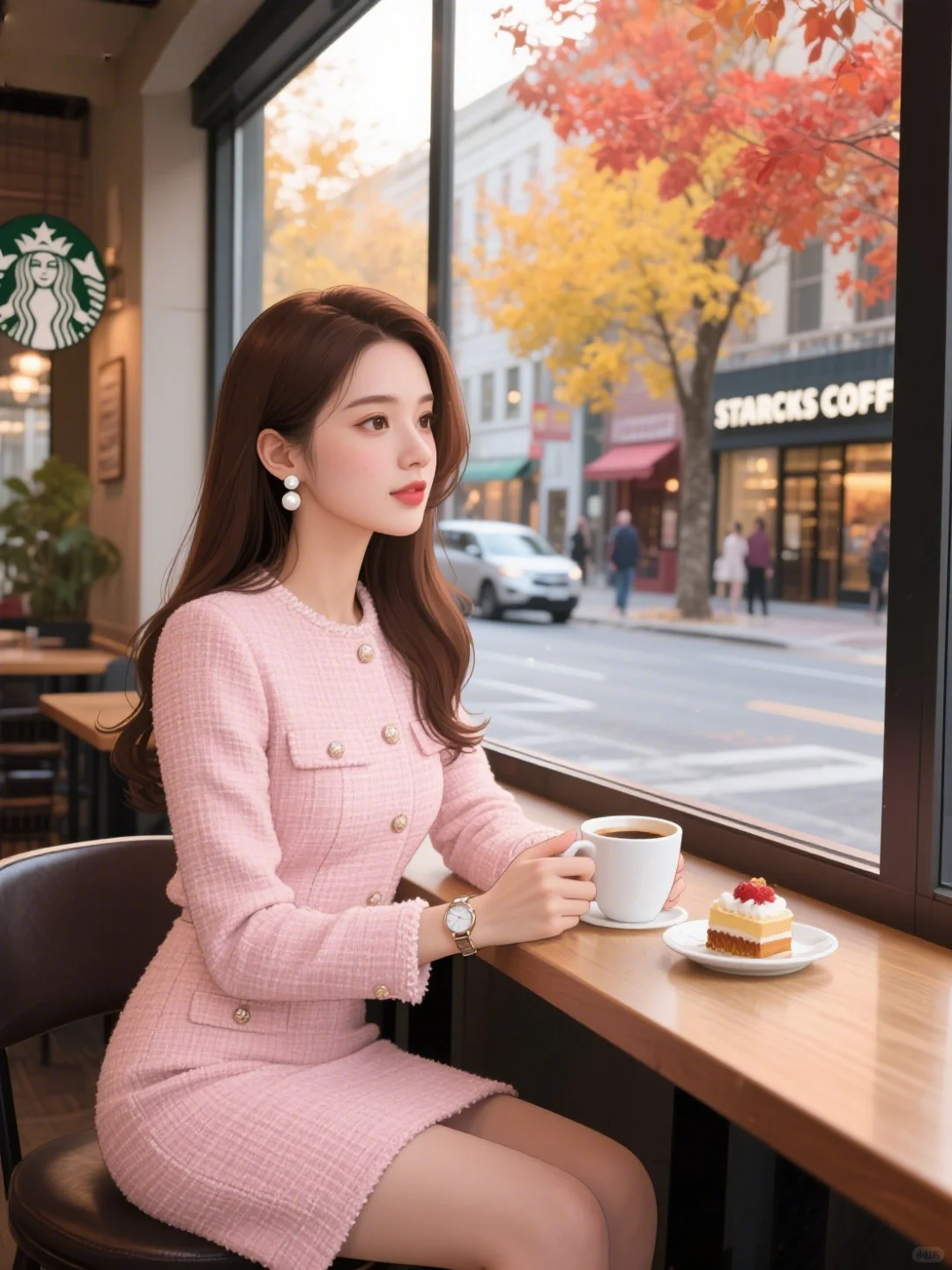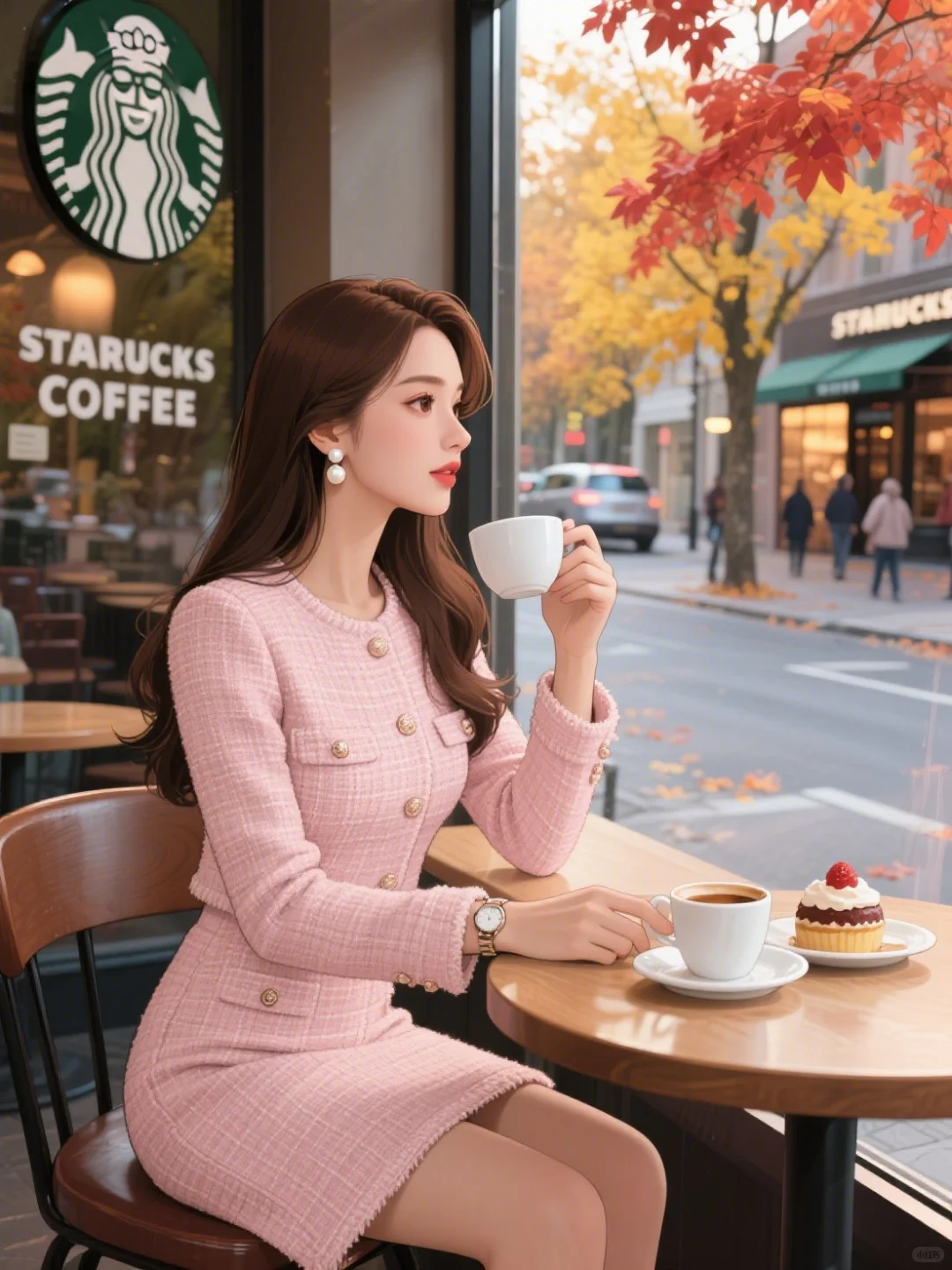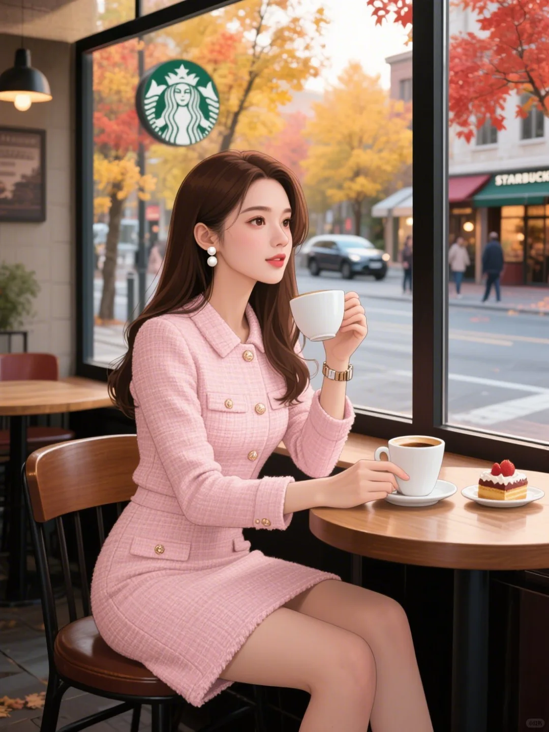 创意图片|秋天看着窗外的落叶喝咖啡