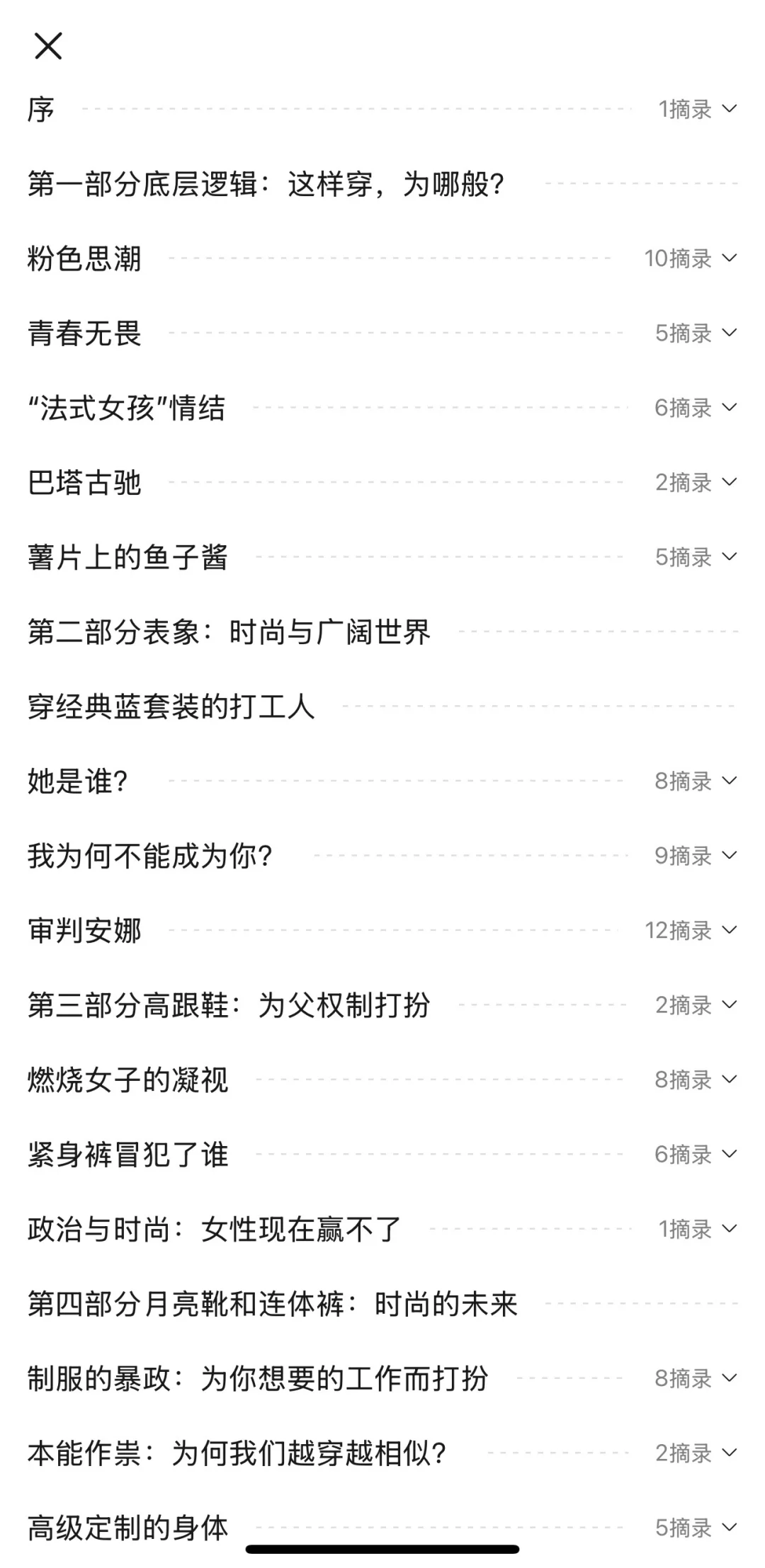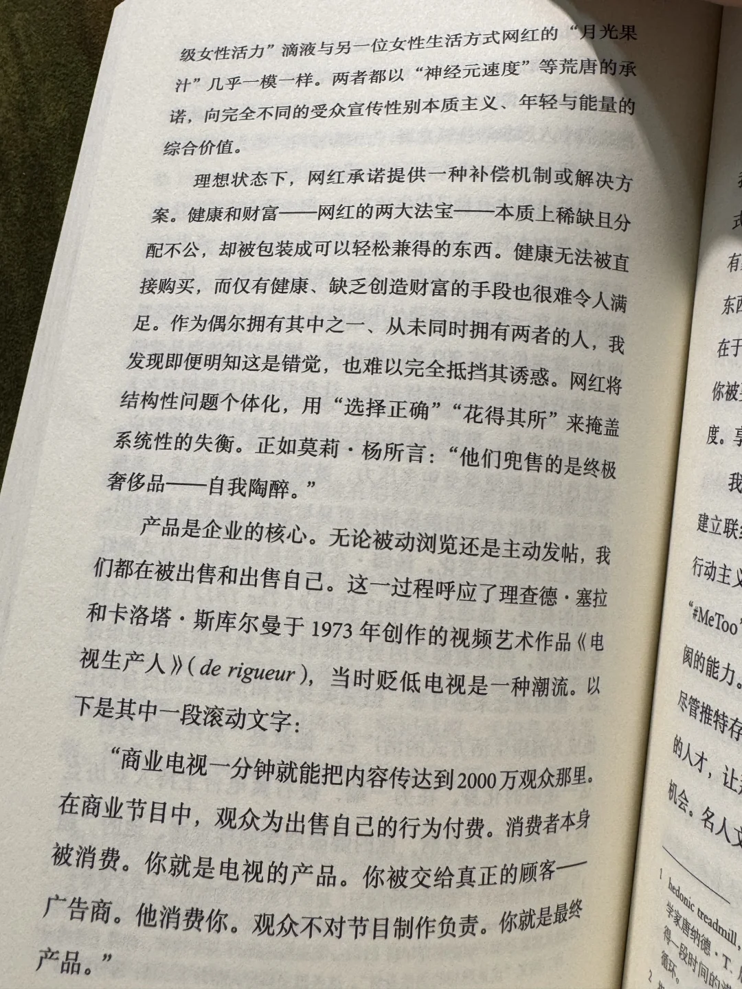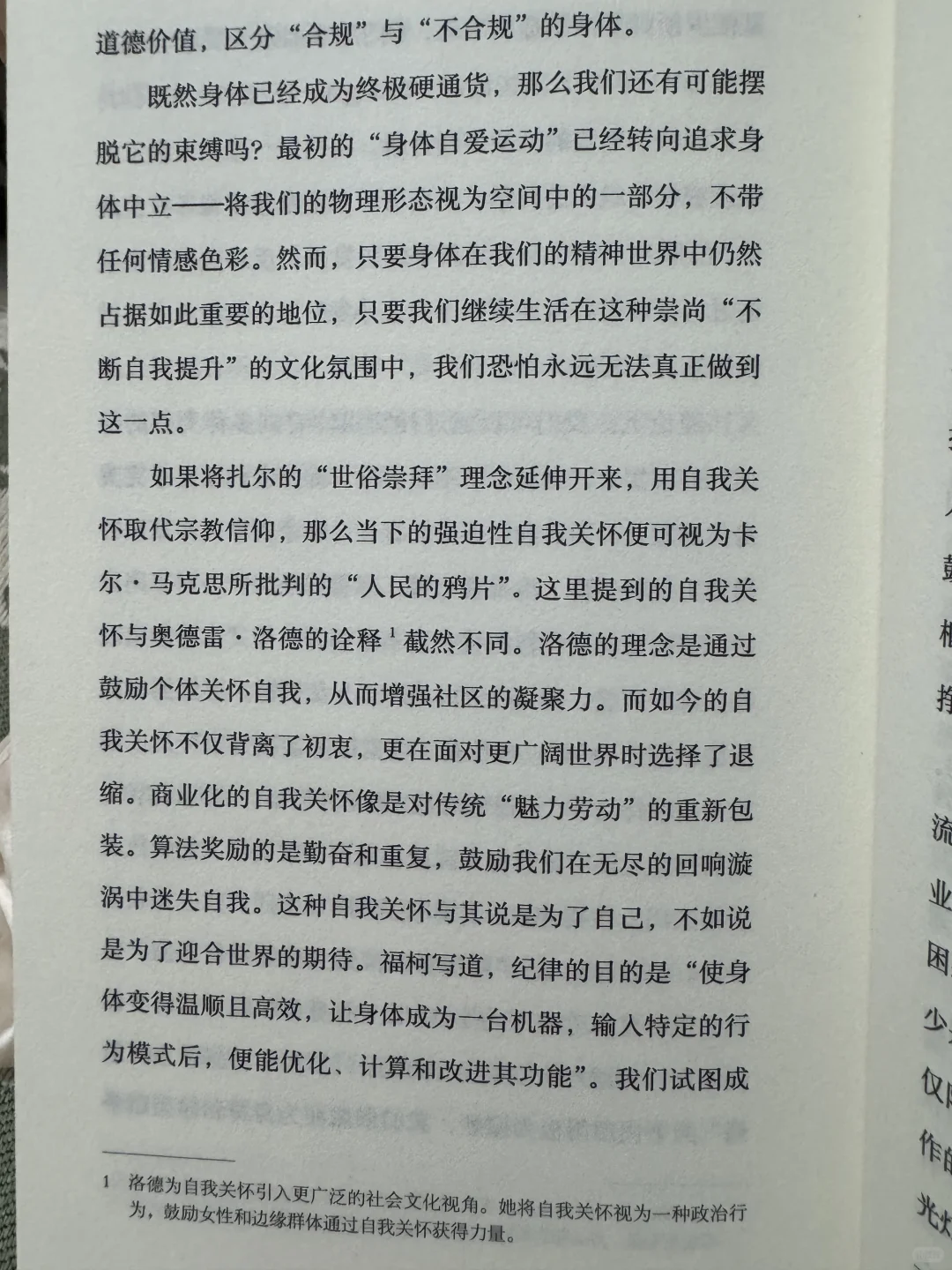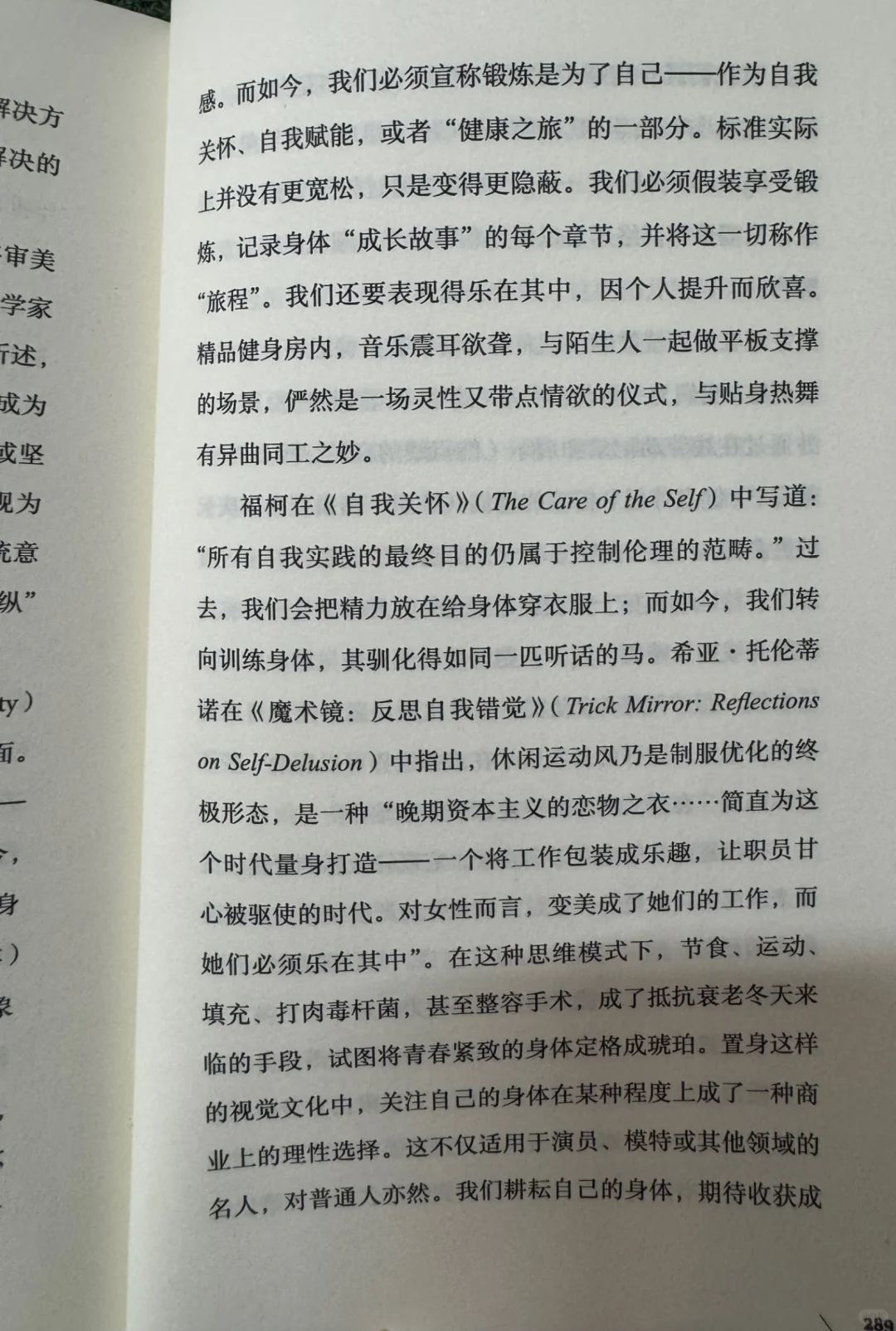 对我启发最大的是最后几章的部分:社交媒体让服装到身体的转向更加明显了。曾经我们定制服装来服务身份,隐藏或是凸显身体特征,如今我们直接孜孜不倦于定制我们的身体——大到整形手术,日常到健身锻炼。健身,这项“自我提升的技术”,也可以被异化为一种皮质醇爆表的劳动。于是,强身健体的初心变成了对“我深蹲硬拉多少 kg”数字斤斤计较的焦虑。而更难以察觉的是,符合主流审美、多少体脂如何线条的身材,比一件符合主流审美的服饰难获得得多——一张健身训练照的背后,暗自彰显着自律的品质和基因的优越。这也是我苦恼的点:似乎每次试图解放什么(比如此时是破解白幼瘦审美),又会落入新的窠臼。当然,我或多或少相信历史趋势是螺旋性上升,作者也说:“很少有系统性问题能通过自我关怀真正解决”,我们无法彻底摆脱,但意识就是自由的开始。
