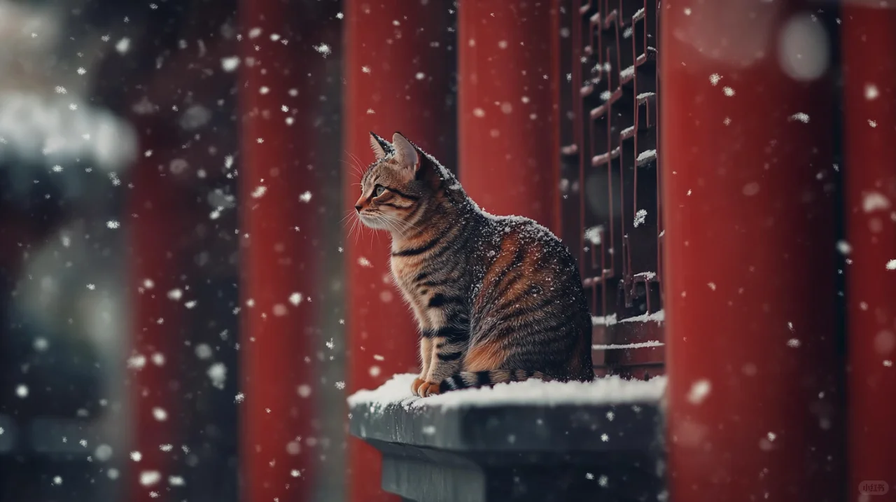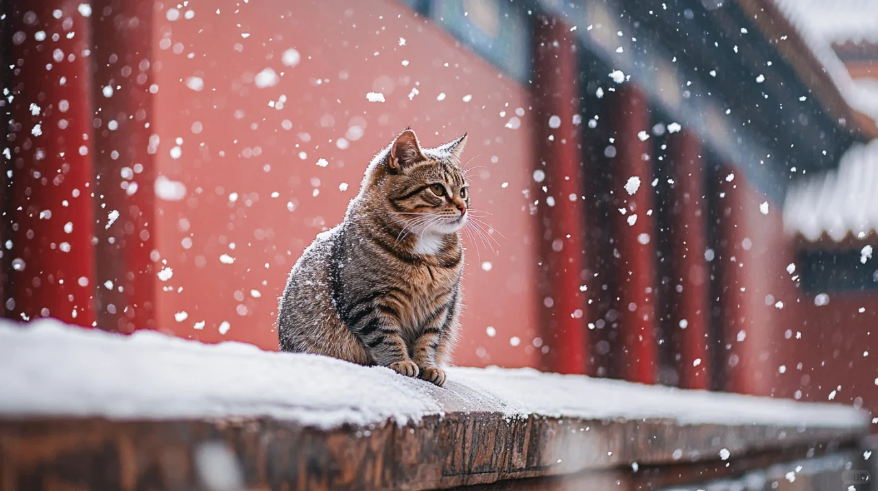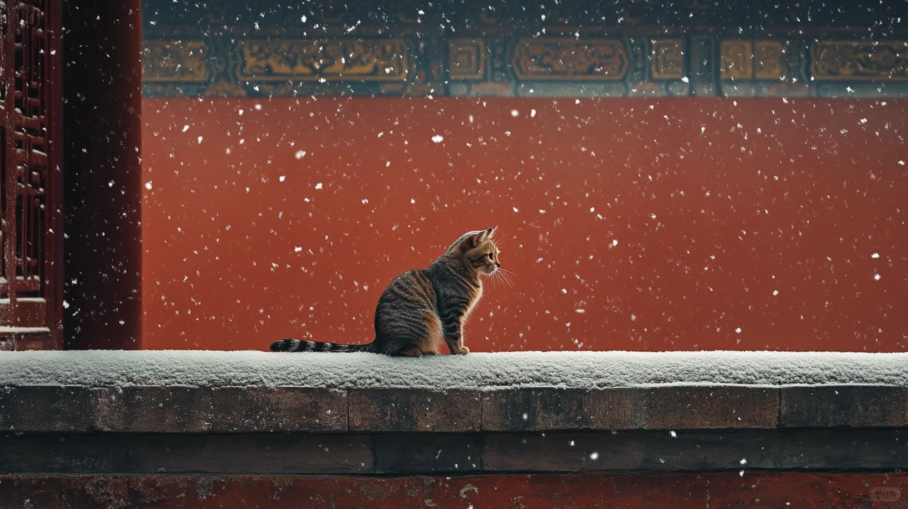 ❄️ Heavy snow is falling, and the red walls of the Forbidden City appear even more solemn against the backdrop of the white snow. In this ancient and tranquil world, a cat quietly stands on the palace wall, like a touch of liveliness in the winter. 🐱
