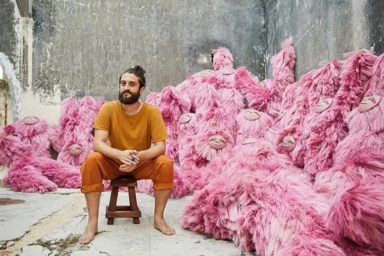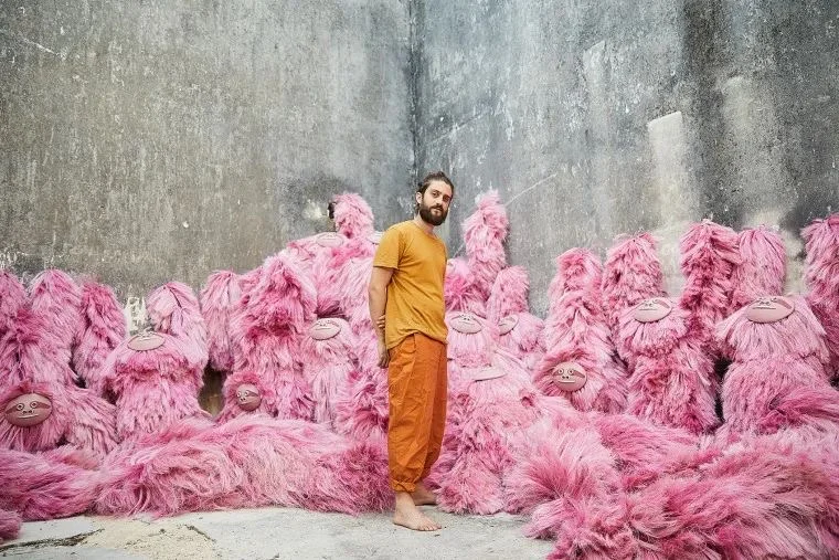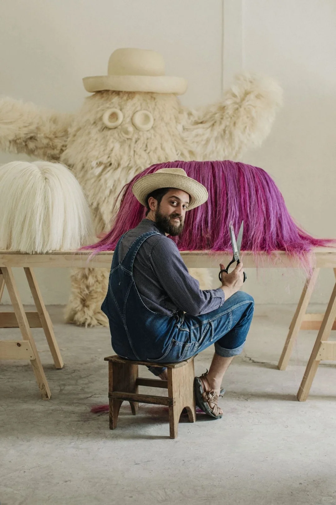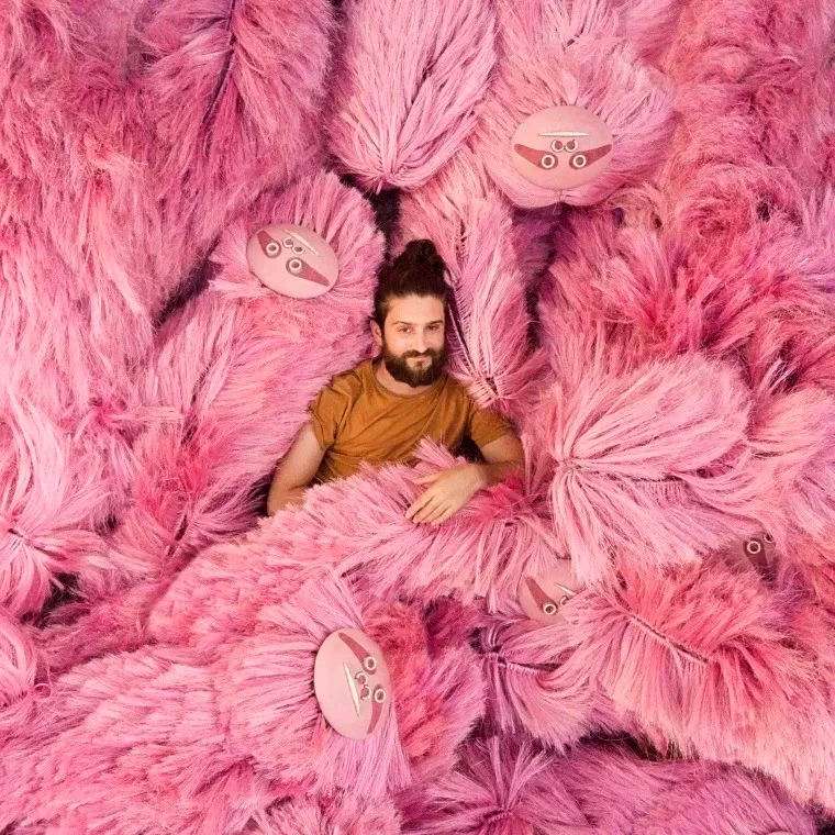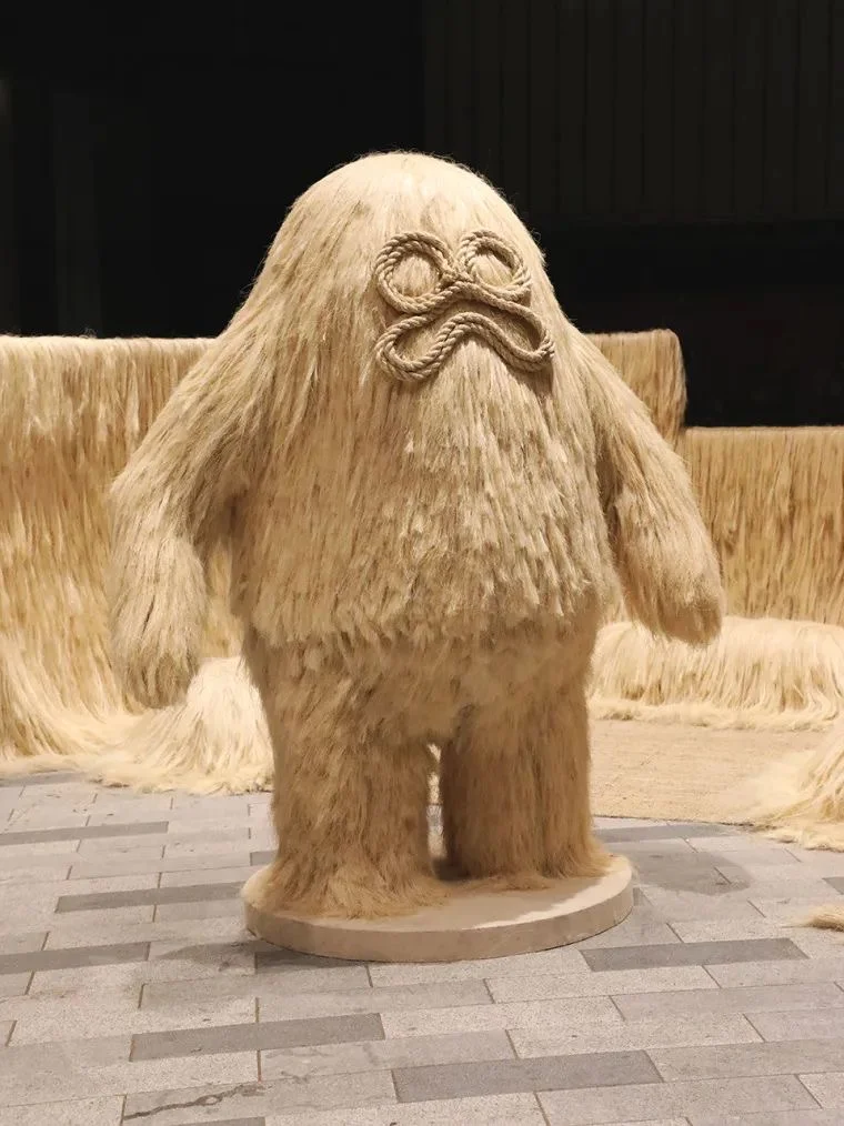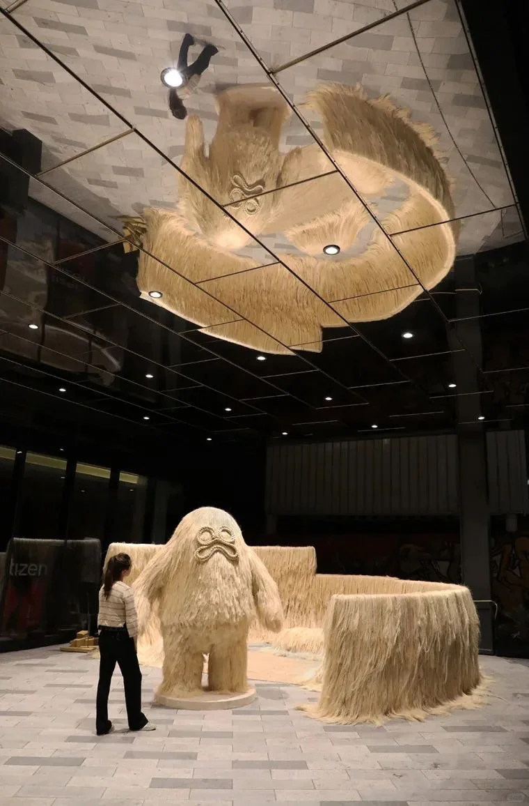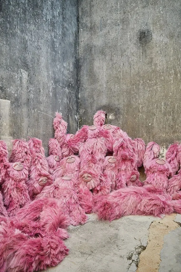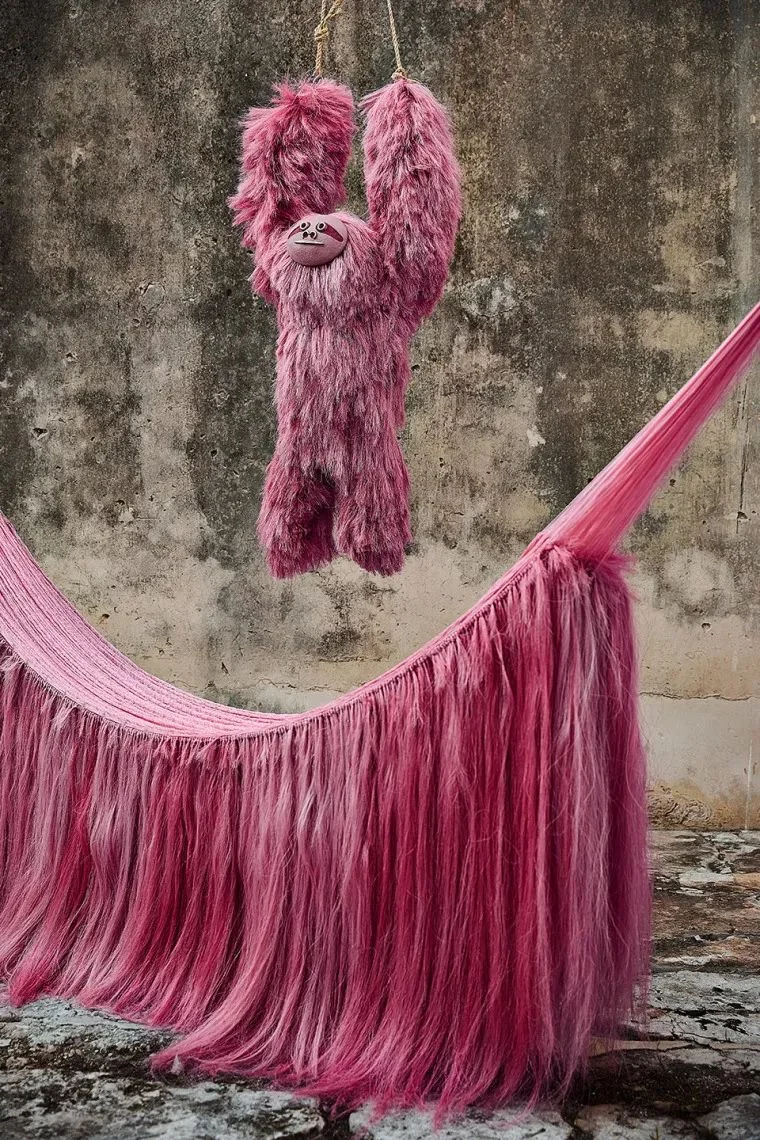 Fernando Laposse,墨西哥设计师,现生活于伦敦和墨西哥,擅长纤维与废弃原料的再利用。这些毛茸茸的树懒是由数千根龙舌兰纤维手工编织而成的,这些龙舌兰纤维来源于梅斯卡酒生产过程中的废料,并使用cochineal染色(一种从仙人掌中生长的小虫子中提取的天然色素)。这件作品是设计师Fernando Laposse与墨西哥南部一个小型土著社Tonahuixtla的一群工匠合作完成的。