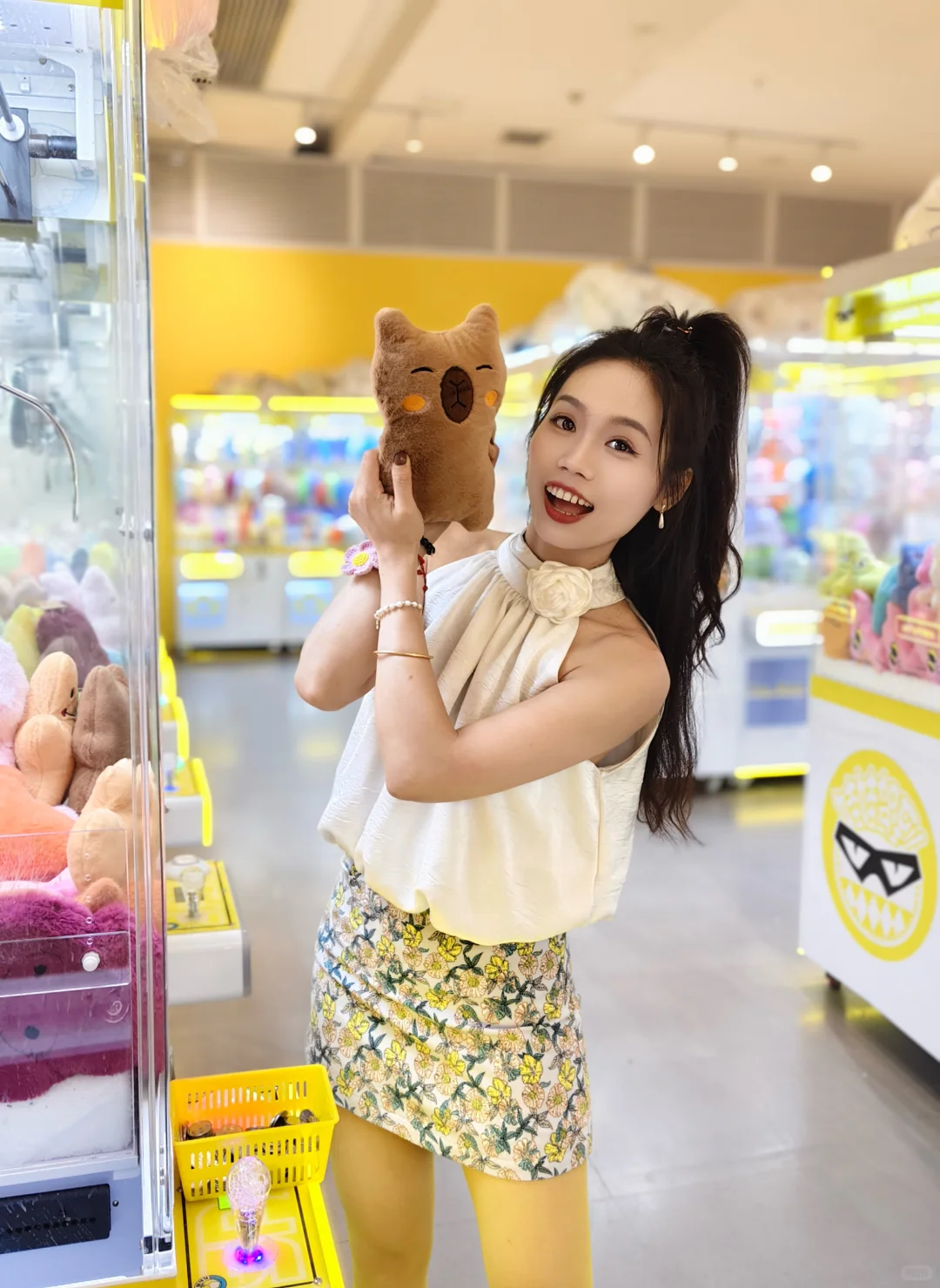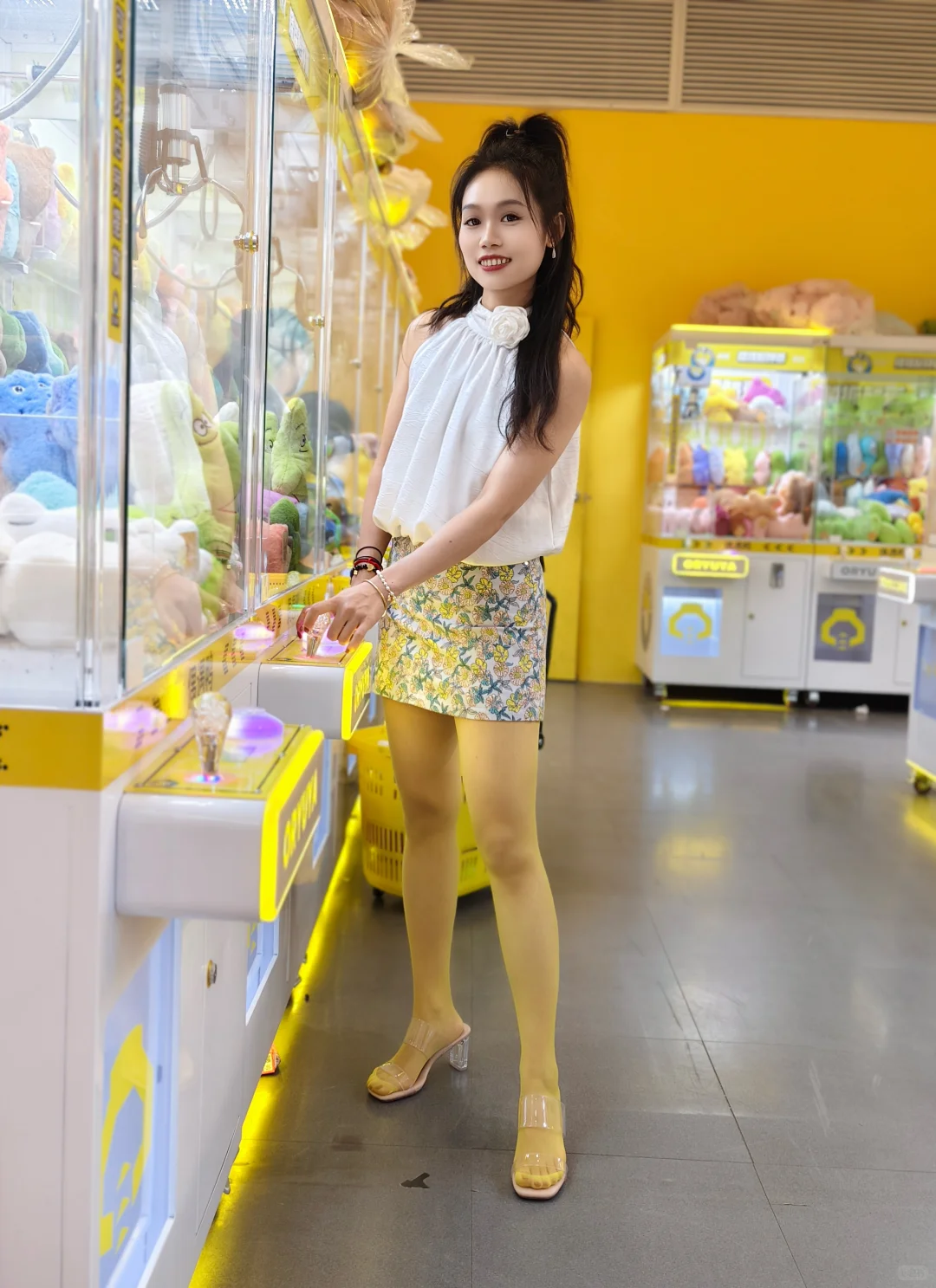 抓娃娃穿搭:黄色丝袜➕包臀裙➕透明凉高