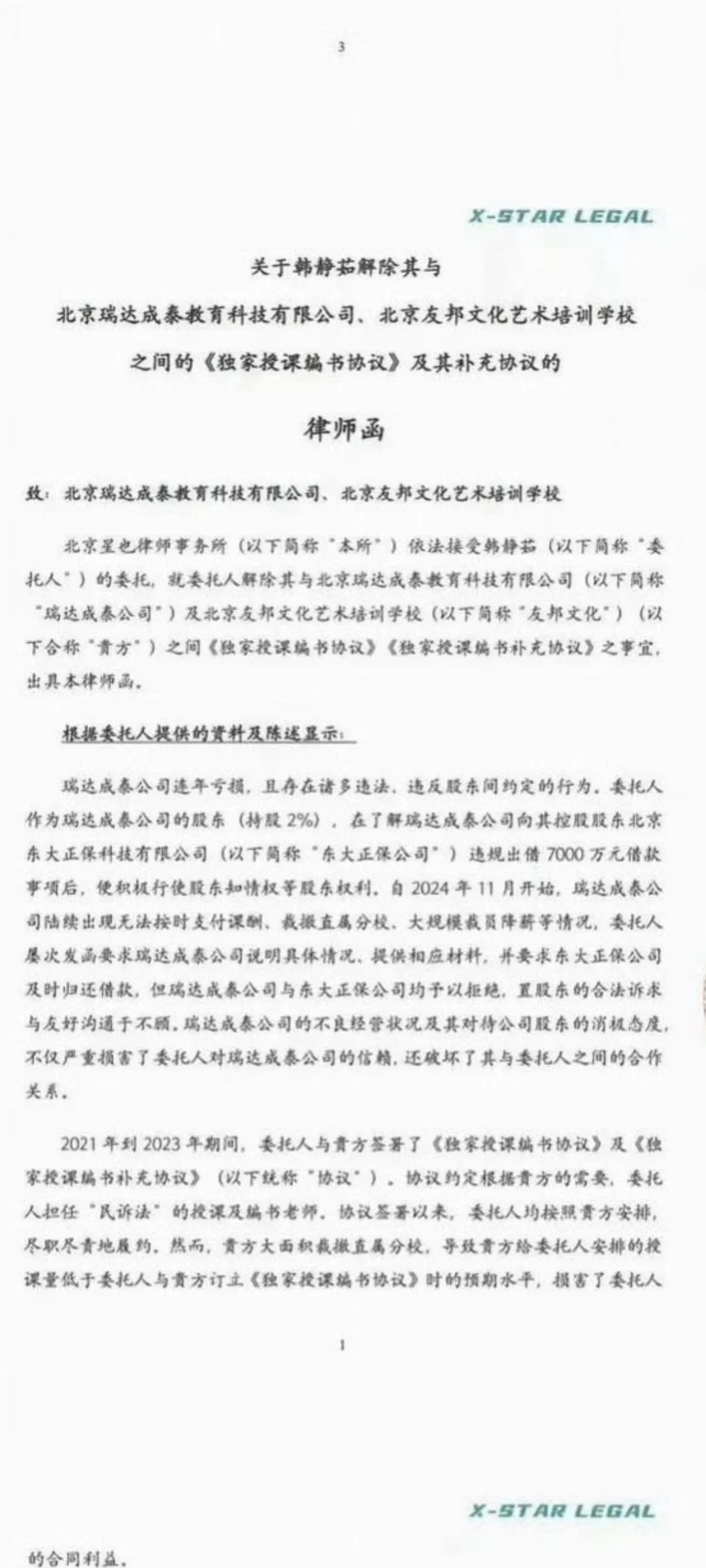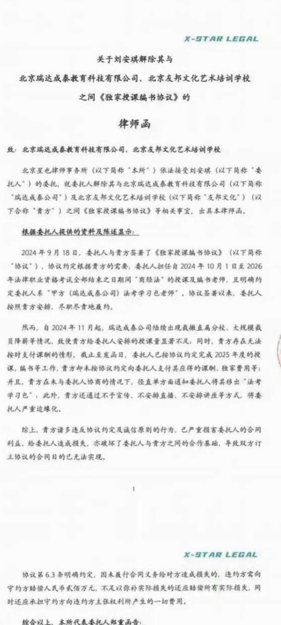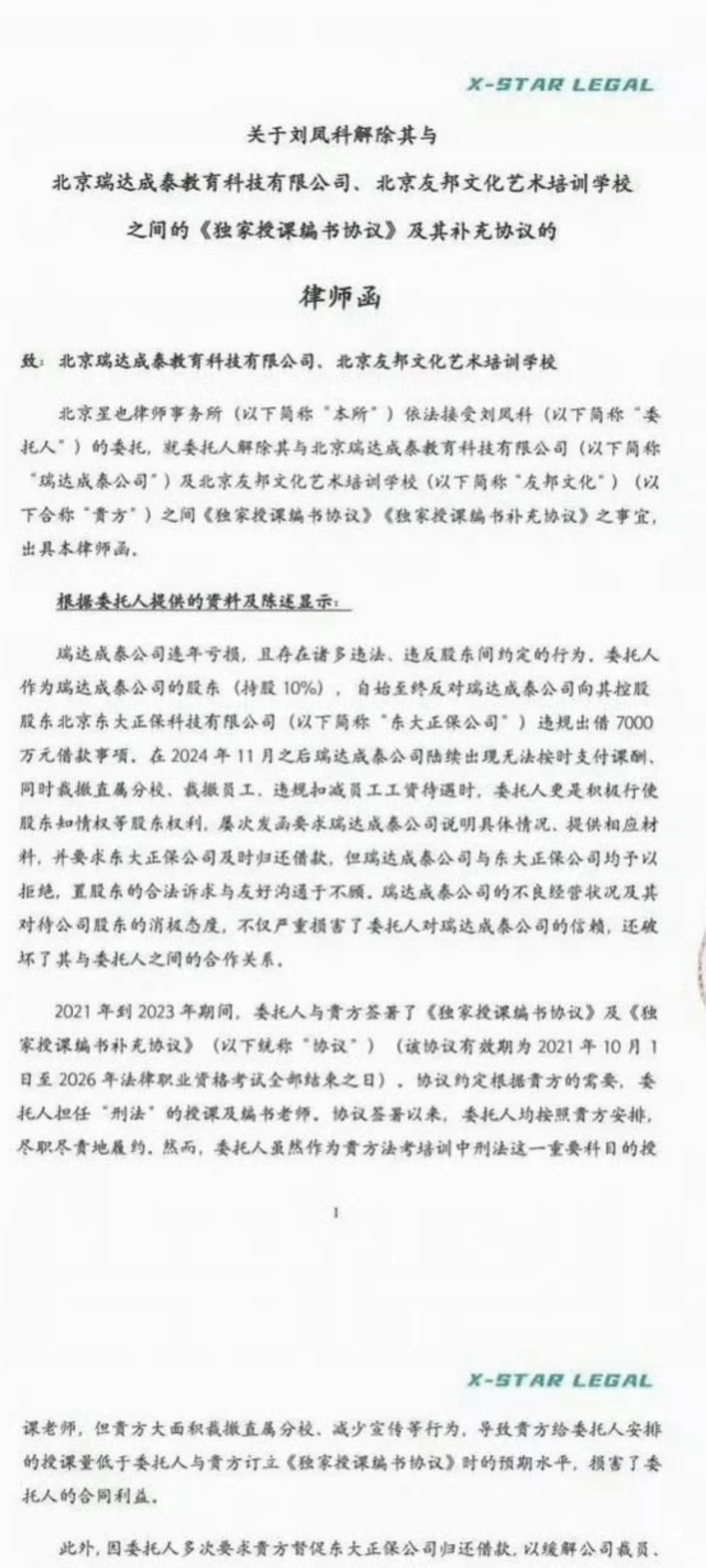 韩心怡,刘安琪,刘凤科发律师函和瑞达解约