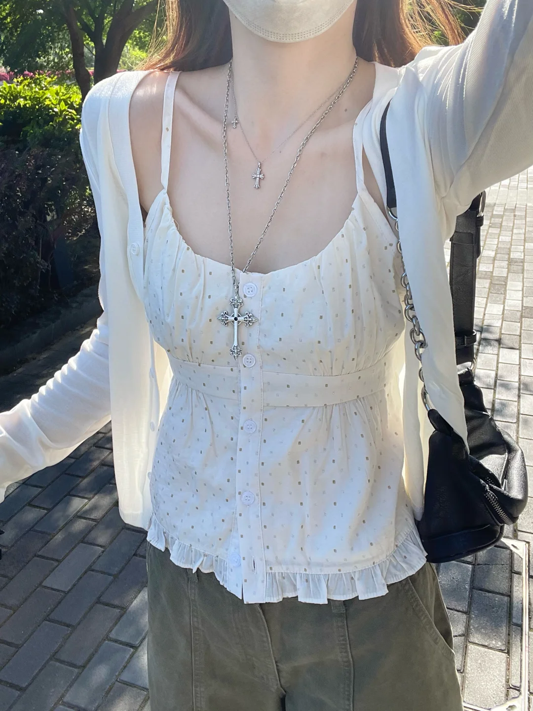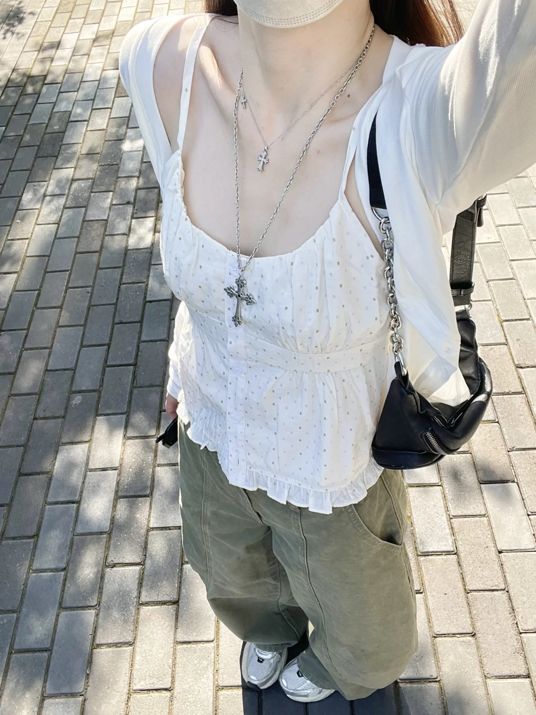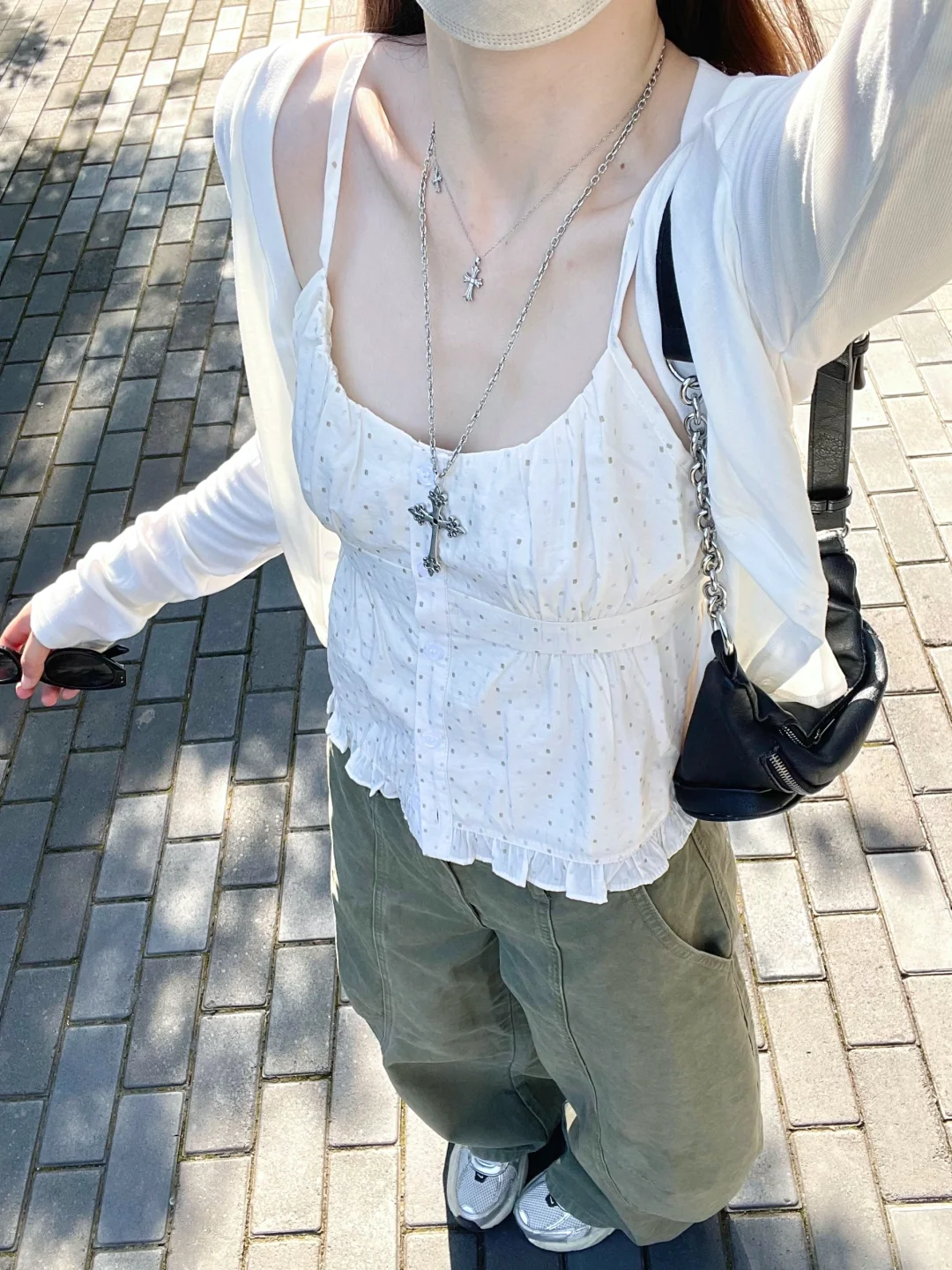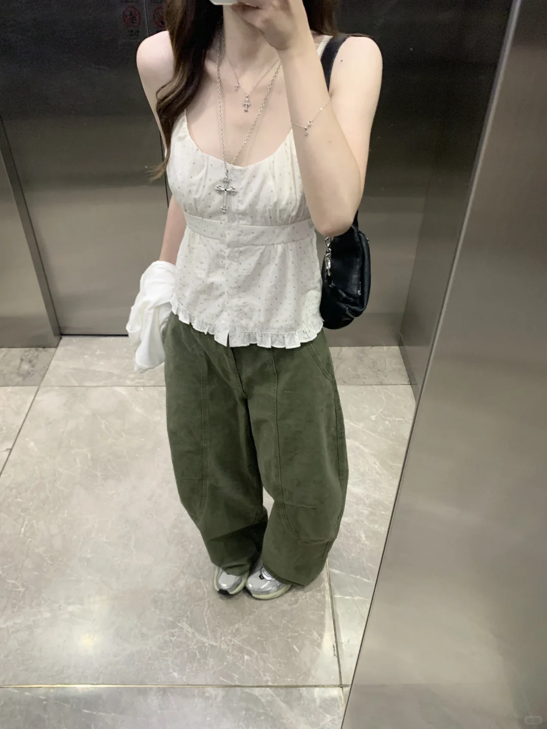 白色开衫➕白色波点吊带➕军绿色弯刀裤工装裤 休闲甜酷工装风~