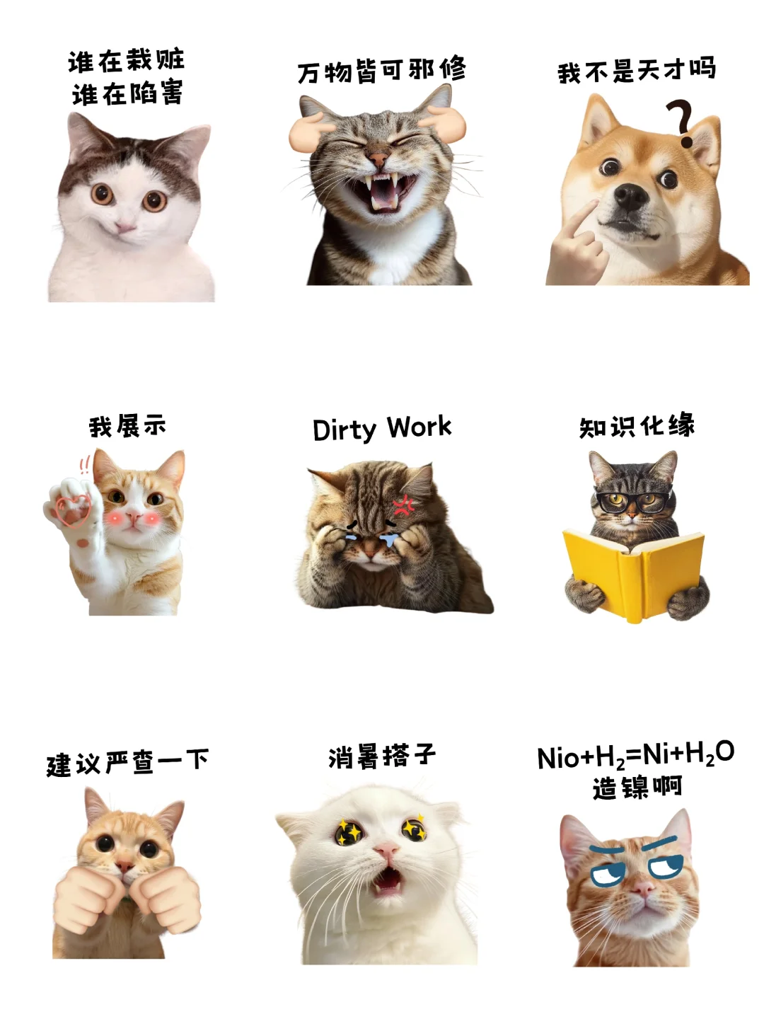 9. Nio+H2=Ni+H2O造镍啊:用化学反应谐音“造孽”,调侃之余带点小内涵。