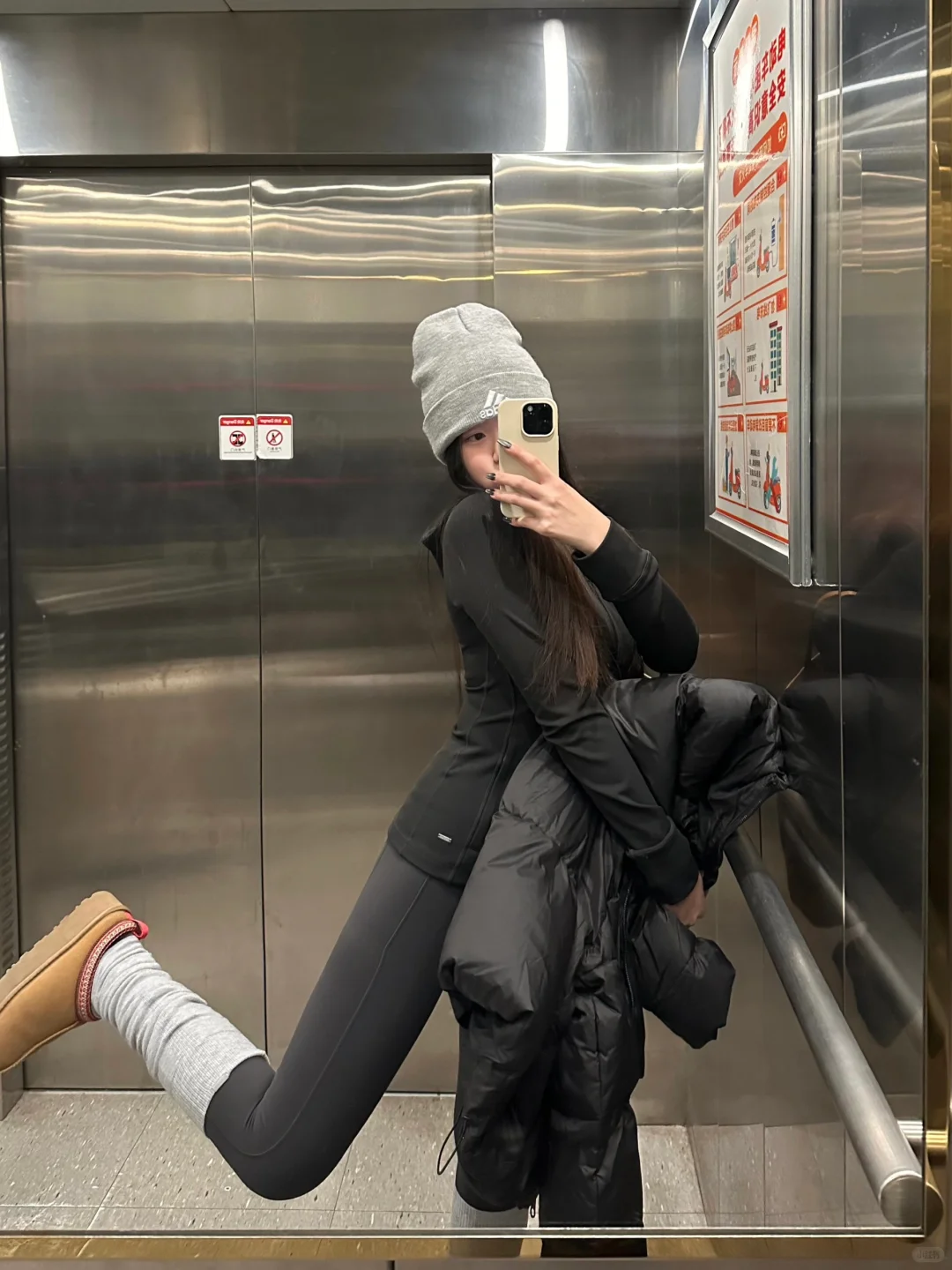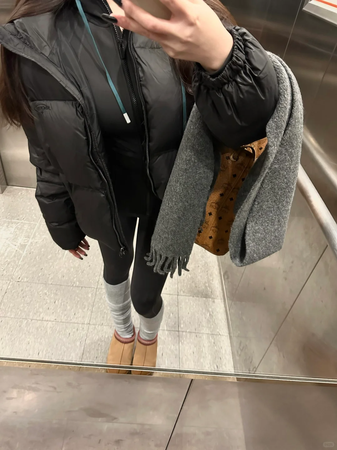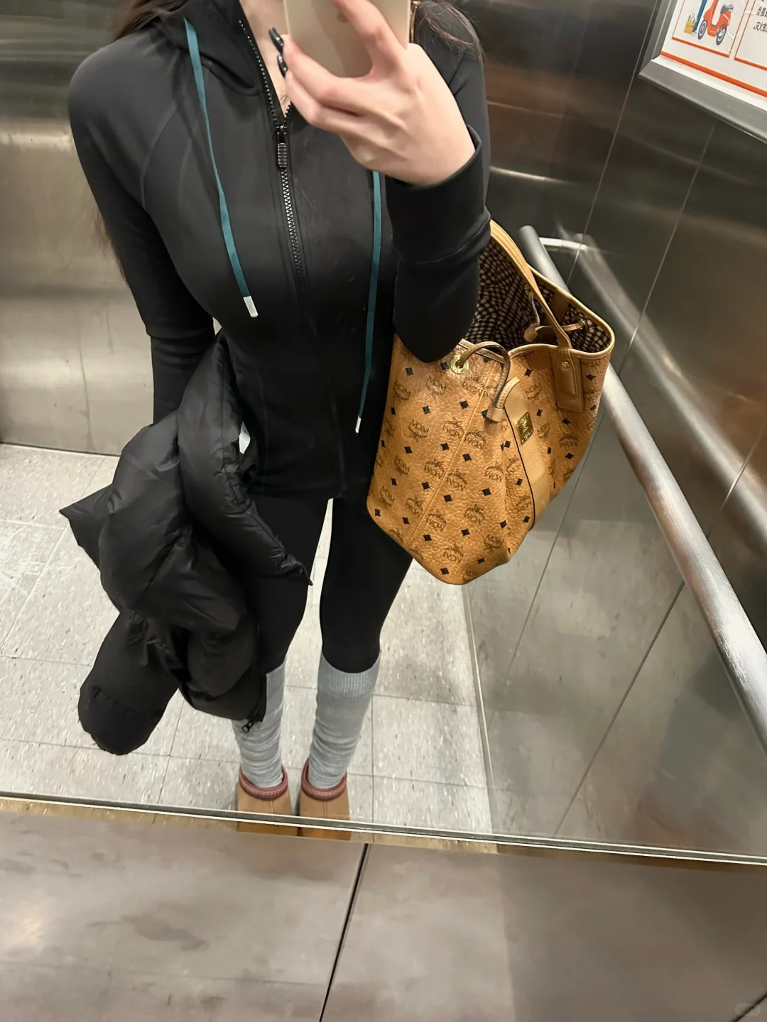 黑色短款面包羽绒服➕修身连帽瑜伽服 搭配了深灰瑜伽裤和浅灰袜套 好喜欢这种简单休闲的感觉~