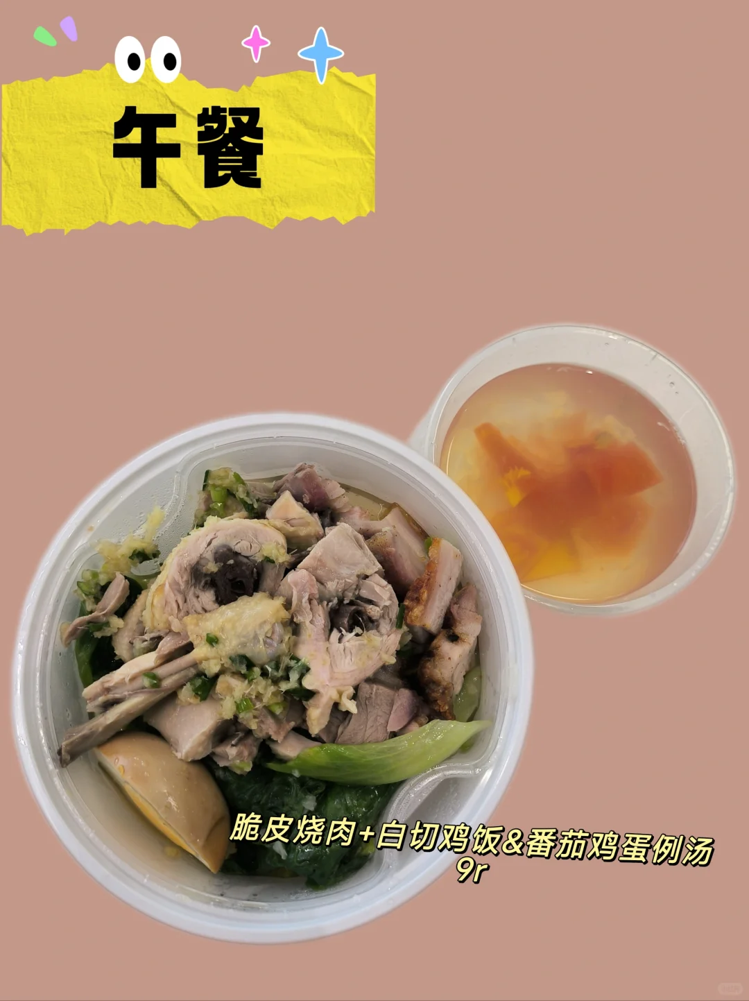 🍱午餐: 脆皮烧肉+白切鸡饭&番茄鸡蛋例汤 930kcal